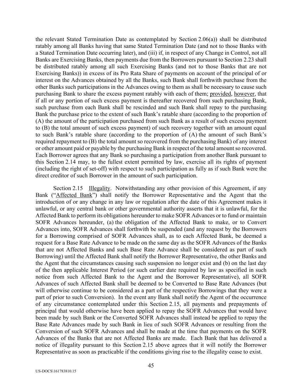 45 US-DOCS\161783810.15 the relevant Stated Termination Date as contemplated by Section 2.06(a)) shall be distributed ratably among all Banks having that same Stated Termination Date (and not to those Banks with a Stated Termination Date occurring later), and (iii) if, in respect of any Change in Control, not all Banks are Exercising Banks, then payments due from the Borrowers pursuant to Section 2.23 shall be distributed ratably among all such Exercising Banks (and not to those Banks that are not Exercising Banks)) in excess of its Pro Rata Share of payments on account of the principal of or interest on the Advances obtained by all the Banks, such Bank shall forthwith purchase from the other Banks such participations in the Advances owing to them as shall be necessary to cause such purchasing Bank to share the excess payment ratably with each of them; provided, however, that if all or any portion of such excess payment is thereafter recovered from such purchasing Bank, such purchase from each Bank shall be rescinded and such Bank shall repay to the purchasing Bank the purchase price to the extent of such Bank’s ratable share (according to the proportion of (A) the amount of the participation purchased from such Bank as a result of such excess payment to (B) the total amount of such excess payment) of such recovery together with an amount equal to such Bank’s ratable share (according to the proportion of (A) the amount of such Bank’s required repayment to (B) the total amount so recovered from the purchasing Bank) of any interest or other amount paid or payable by the purchasing Bank in respect of the total amount so recovered. Each Borrower agrees that any Bank so purchasing a participation from another Bank pursuant to this Section 2.14 may, to the fullest extent permitted by law, exercise all its rights of payment (including the right of set-off) with respect to such participation as fully as if such Bank were the direct creditor of such Borrower in the amount of such participation. Section 2.15 Illegality. Notwithstanding any other provision of this Agreement, if any Bank (“Affected Bank”) shall notify the Borrower Representative and the Agent that the introduction of or any change in any law or regulation after the date of this Agreement makes it unlawful, or any central bank or other governmental authority asserts that it is unlawful, for the Affected Bank to perform its obligations hereunder to make SOFR Advances or to fund or maintain SOFR Advances hereunder, (a) the obligation of the Affected Bank to make, or to Convert Advances into, SOFR Advances shall forthwith be suspended (and any request by the Borrowers for a Borrowing comprised of SOFR Advances shall, as to each Affected Bank, be deemed a request for a Base Rate Advance to be made on the same day as the SOFR Advances of the Banks that are not Affected Banks and such Base Rate Advance shall be considered as part of such Borrowing) until the Affected Bank shall notify the Borrower Representative, the other Banks and the Agent that the circumstances causing such suspension no longer exist and (b) on the last day of the then applicable Interest Period (or such earlier date required by law as specified in such notice from such Affected Bank to the Agent and the Borrower Representative), all SOFR Advances of such Affected Bank shall be deemed to be Converted to Base Rate Advances (but will otherwise continue to be considered as a part of the respective Borrowings that they were a part of prior to such Conversion). In the event any Bank shall notify the Agent of the occurrence of any circumstance contemplated under this Section 2.15, all payments and prepayments of principal that would otherwise have been applied to repay the SOFR Advances that would have been made by such Bank or the Converted SOFR Advances shall instead be applied to repay the Base Rate Advances made by such Bank in lieu of such SOFR Advances or resulting from the Conversion of such SOFR Advances and shall be made at the time that payments on the SOFR Advances of the Banks that are not Affected Banks are made. Each Bank that has delivered a notice of illegality pursuant to this Section 2.15 above agrees that it will notify the Borrower Representative as soon as practicable if the conditions giving rise to the illegality cease to exist.
