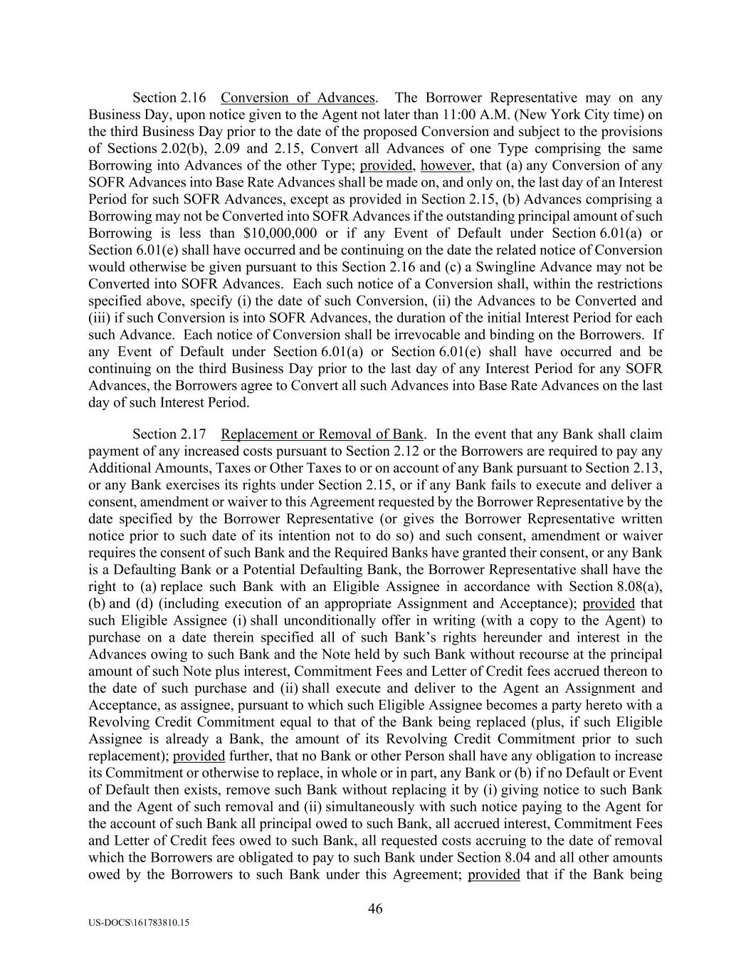 46 US-DOCS\161783810.15 Section 2.16 Conversion of Advances. The Borrower Representative may on any Business Day, upon notice given to the Agent not later than 11:00 A.M. (New York City time) on the third Business Day prior to the date of the proposed Conversion and subject to the provisions of Sections 2.02(b), 2.09 and 2.15, Convert all Advances of one Type comprising the same Borrowing into Advances of the other Type; provided, however, that (a) any Conversion of any SOFR Advances into Base Rate Advances shall be made on, and only on, the last day of an Interest Period for such SOFR Advances, except as provided in Section 2.15, (b) Advances comprising a Borrowing may not be Converted into SOFR Advances if the outstanding principal amount of such Borrowing is less than $10,000,000 or if any Event of Default under Section 6.01(a) or Section 6.01(e) shall have occurred and be continuing on the date the related notice of Conversion would otherwise be given pursuant to this Section 2.16 and (c) a Swingline Advance may not be Converted into SOFR Advances. Each such notice of a Conversion shall, within the restrictions specified above, specify (i) the date of such Conversion, (ii) the Advances to be Converted and (iii) if such Conversion is into SOFR Advances, the duration of the initial Interest Period for each such Advance. Each notice of Conversion shall be irrevocable and binding on the Borrowers. If any Event of Default under Section 6.01(a) or Section 6.01(e) shall have occurred and be continuing on the third Business Day prior to the last day of any Interest Period for any SOFR Advances, the Borrowers agree to Convert all such Advances into Base Rate Advances on the last day of such Interest Period. Section 2.17 Replacement or Removal of Bank. In the event that any Bank shall claim payment of any increased costs pursuant to Section 2.12 or the Borrowers are required to pay any Additional Amounts, Taxes or Other Taxes to or on account of any Bank pursuant to Section 2.13, or any Bank exercises its rights under Section 2.15, or if any Bank fails to execute and deliver a consent, amendment or waiver to this Agreement requested by the Borrower Representative by the date specified by the Borrower Representative (or gives the Borrower Representative written notice prior to such date of its intention not to do so) and such consent, amendment or waiver requires the consent of such Bank and the Required Banks have granted their consent, or any Bank is a Defaulting Bank or a Potential Defaulting Bank, the Borrower Representative shall have the right to (a) replace such Bank with an Eligible Assignee in accordance with Section 8.08(a), (b) and (d) (including execution of an appropriate Assignment and Acceptance); provided that such Eligible Assignee (i) shall unconditionally offer in writing (with a copy to the Agent) to purchase on a date therein specified all of such Bank’s rights hereunder and interest in the Advances owing to such Bank and the Note held by such Bank without recourse at the principal amount of such Note plus interest, Commitment Fees and Letter of Credit fees accrued thereon to the date of such purchase and (ii) shall execute and deliver to the Agent an Assignment and Acceptance, as assignee, pursuant to which such Eligible Assignee becomes a party hereto with a Revolving Credit Commitment equal to that of the Bank being replaced (plus, if such Eligible Assignee is already a Bank, the amount of its Revolving Credit Commitment prior to such replacement); provided further, that no Bank or other Person shall have any obligation to increase its Commitment or otherwise to replace, in whole or in part, any Bank or (b) if no Default or Event of Default then exists, remove such Bank without replacing it by (i) giving notice to such Bank and the Agent of such removal and (ii) simultaneously with such notice paying to the Agent for the account of such Bank all principal owed to such Bank, all accrued interest, Commitment Fees and Letter of Credit fees owed to such Bank, all requested costs accruing to the date of removal which the Borrowers are obligated to pay to such Bank under Section 8.04 and all other amounts owed by the Borrowers to such Bank under this Agreement; provided that if the Bank being