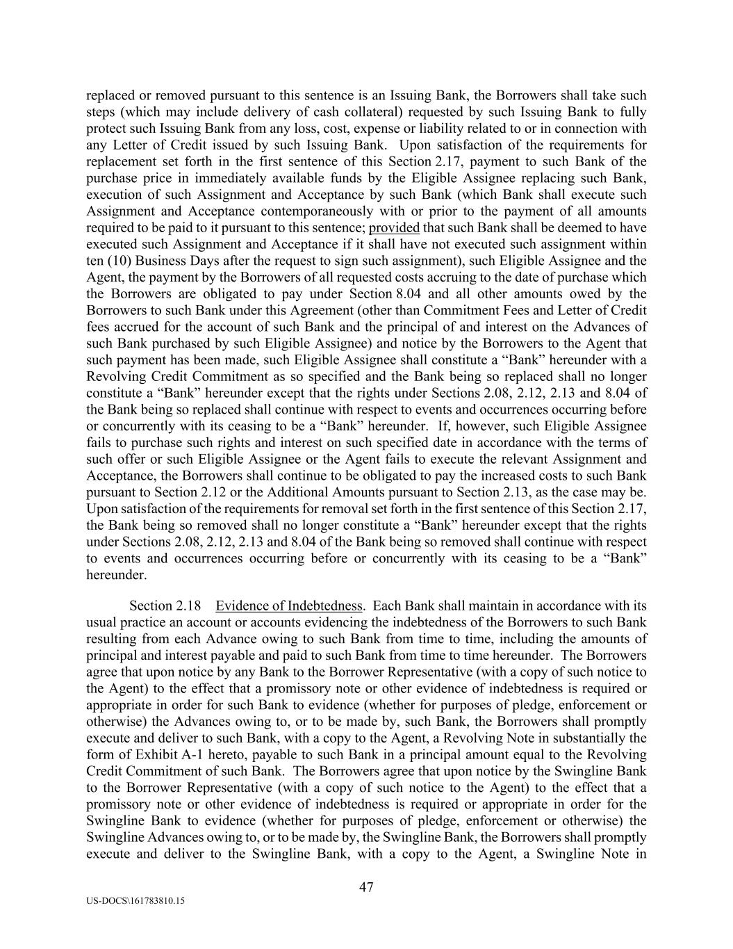 47 US-DOCS\161783810.15 replaced or removed pursuant to this sentence is an Issuing Bank, the Borrowers shall take such steps (which may include delivery of cash collateral) requested by such Issuing Bank to fully protect such Issuing Bank from any loss, cost, expense or liability related to or in connection with any Letter of Credit issued by such Issuing Bank. Upon satisfaction of the requirements for replacement set forth in the first sentence of this Section 2.17, payment to such Bank of the purchase price in immediately available funds by the Eligible Assignee replacing such Bank, execution of such Assignment and Acceptance by such Bank (which Bank shall execute such Assignment and Acceptance contemporaneously with or prior to the payment of all amounts required to be paid to it pursuant to this sentence; provided that such Bank shall be deemed to have executed such Assignment and Acceptance if it shall have not executed such assignment within ten (10) Business Days after the request to sign such assignment), such Eligible Assignee and the Agent, the payment by the Borrowers of all requested costs accruing to the date of purchase which the Borrowers are obligated to pay under Section 8.04 and all other amounts owed by the Borrowers to such Bank under this Agreement (other than Commitment Fees and Letter of Credit fees accrued for the account of such Bank and the principal of and interest on the Advances of such Bank purchased by such Eligible Assignee) and notice by the Borrowers to the Agent that such payment has been made, such Eligible Assignee shall constitute a “Bank” hereunder with a Revolving Credit Commitment as so specified and the Bank being so replaced shall no longer constitute a “Bank” hereunder except that the rights under Sections 2.08, 2.12, 2.13 and 8.04 of the Bank being so replaced shall continue with respect to events and occurrences occurring before or concurrently with its ceasing to be a “Bank” hereunder. If, however, such Eligible Assignee fails to purchase such rights and interest on such specified date in accordance with the terms of such offer or such Eligible Assignee or the Agent fails to execute the relevant Assignment and Acceptance, the Borrowers shall continue to be obligated to pay the increased costs to such Bank pursuant to Section 2.12 or the Additional Amounts pursuant to Section 2.13, as the case may be. Upon satisfaction of the requirements for removal set forth in the first sentence of this Section 2.17, the Bank being so removed shall no longer constitute a “Bank” hereunder except that the rights under Sections 2.08, 2.12, 2.13 and 8.04 of the Bank being so removed shall continue with respect to events and occurrences occurring before or concurrently with its ceasing to be a “Bank” hereunder. Section 2.18 Evidence of Indebtedness. Each Bank shall maintain in accordance with its usual practice an account or accounts evidencing the indebtedness of the Borrowers to such Bank resulting from each Advance owing to such Bank from time to time, including the amounts of principal and interest payable and paid to such Bank from time to time hereunder. The Borrowers agree that upon notice by any Bank to the Borrower Representative (with a copy of such notice to the Agent) to the effect that a promissory note or other evidence of indebtedness is required or appropriate in order for such Bank to evidence (whether for purposes of pledge, enforcement or otherwise) the Advances owing to, or to be made by, such Bank, the Borrowers shall promptly execute and deliver to such Bank, with a copy to the Agent, a Revolving Note in substantially the form of Exhibit A-1 hereto, payable to such Bank in a principal amount equal to the Revolving Credit Commitment of such Bank. The Borrowers agree that upon notice by the Swingline Bank to the Borrower Representative (with a copy of such notice to the Agent) to the effect that a promissory note or other evidence of indebtedness is required or appropriate in order for the Swingline Bank to evidence (whether for purposes of pledge, enforcement or otherwise) the Swingline Advances owing to, or to be made by, the Swingline Bank, the Borrowers shall promptly execute and deliver to the Swingline Bank, with a copy to the Agent, a Swingline Note in