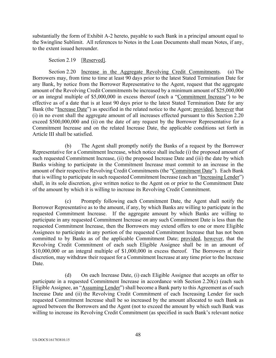 48 US-DOCS\161783810.15 substantially the form of Exhibit A-2 hereto, payable to such Bank in a principal amount equal to the Swingline Sublimit. All references to Notes in the Loan Documents shall mean Notes, if any, to the extent issued hereunder. Section 2.19 [Reserved]. Section 2.20 Increase in the Aggregate Revolving Credit Commitments. (a) The Borrowers may, from time to time at least 90 days prior to the latest Stated Termination Date for any Bank, by notice from the Borrower Representative to the Agent, request that the aggregate amount of the Revolving Credit Commitments be increased by a minimum amount of $25,000,000 or an integral multiple of $5,000,000 in excess thereof (each a “Commitment Increase”) to be effective as of a date that is at least 90 days prior to the latest Stated Termination Date for any Bank (the “Increase Date”) as specified in the related notice to the Agent; provided, however that (i) in no event shall the aggregate amount of all increases effected pursuant to this Section 2.20 exceed $500,000,000 and (ii) on the date of any request by the Borrower Representative for a Commitment Increase and on the related Increase Date, the applicable conditions set forth in Article III shall be satisfied. (b) The Agent shall promptly notify the Banks of a request by the Borrower Representative for a Commitment Increase, which notice shall include (i) the proposed amount of such requested Commitment Increase, (ii) the proposed Increase Date and (iii) the date by which Banks wishing to participate in the Commitment Increase must commit to an increase in the amount of their respective Revolving Credit Commitments (the “Commitment Date”). Each Bank that is willing to participate in such requested Commitment Increase (each an “Increasing Lender”) shall, in its sole discretion, give written notice to the Agent on or prior to the Commitment Date of the amount by which it is willing to increase its Revolving Credit Commitment. (c) Promptly following each Commitment Date, the Agent shall notify the Borrower Representative as to the amount, if any, by which Banks are willing to participate in the requested Commitment Increase. If the aggregate amount by which Banks are willing to participate in any requested Commitment Increase on any such Commitment Date is less than the requested Commitment Increase, then the Borrowers may extend offers to one or more Eligible Assignees to participate in any portion of the requested Commitment Increase that has not been committed to by Banks as of the applicable Commitment Date; provided, however, that the Revolving Credit Commitment of each such Eligible Assignee shall be in an amount of $10,000,000 or an integral multiple of $1,000,000 in excess thereof. The Borrowers at their discretion, may withdraw their request for a Commitment Increase at any time prior to the Increase Date. (d) On each Increase Date, (i) each Eligible Assignee that accepts an offer to participate in a requested Commitment Increase in accordance with Section 2.20(c) (each such Eligible Assignee, an “Assuming Lender”) shall become a Bank party to this Agreement as of such Increase Date and (ii) the Revolving Credit Commitment of each Increasing Lender for such requested Commitment Increase shall be so increased by the amount allocated to such Bank as agreed between the Borrowers and the Agent (not to exceed the amount by which such Bank was willing to increase its Revolving Credit Commitment (as specified in such Bank’s relevant notice