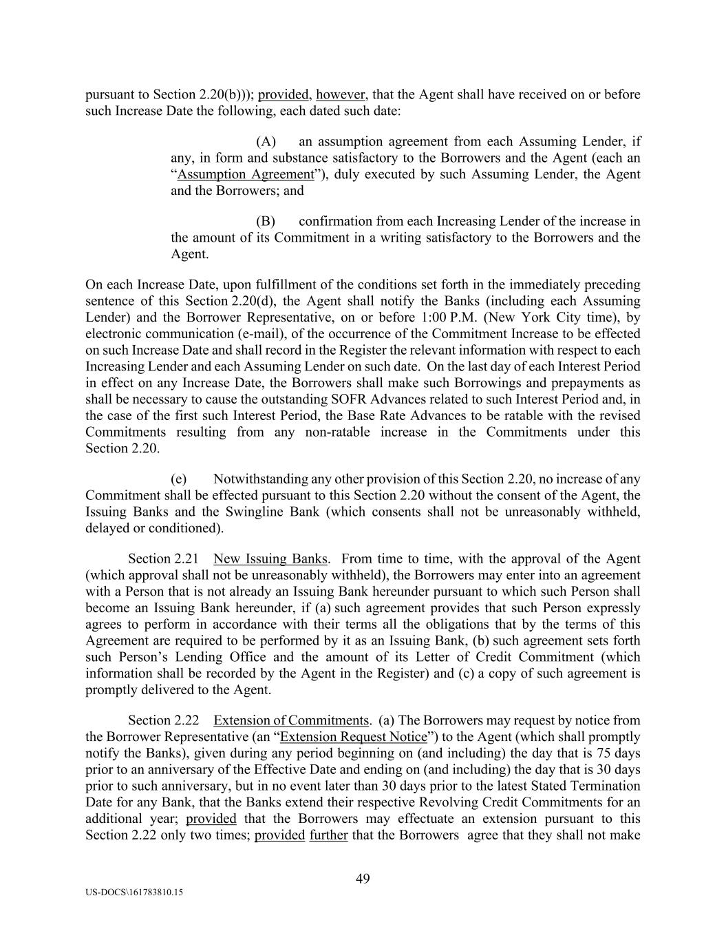 49 US-DOCS\161783810.15 pursuant to Section 2.20(b))); provided, however, that the Agent shall have received on or before such Increase Date the following, each dated such date: (A) an assumption agreement from each Assuming Lender, if any, in form and substance satisfactory to the Borrowers and the Agent (each an “Assumption Agreement”), duly executed by such Assuming Lender, the Agent and the Borrowers; and (B) confirmation from each Increasing Lender of the increase in the amount of its Commitment in a writing satisfactory to the Borrowers and the Agent. On each Increase Date, upon fulfillment of the conditions set forth in the immediately preceding sentence of this Section 2.20(d), the Agent shall notify the Banks (including each Assuming Lender) and the Borrower Representative, on or before 1:00 P.M. (New York City time), by electronic communication (e-mail), of the occurrence of the Commitment Increase to be effected on such Increase Date and shall record in the Register the relevant information with respect to each Increasing Lender and each Assuming Lender on such date. On the last day of each Interest Period in effect on any Increase Date, the Borrowers shall make such Borrowings and prepayments as shall be necessary to cause the outstanding SOFR Advances related to such Interest Period and, in the case of the first such Interest Period, the Base Rate Advances to be ratable with the revised Commitments resulting from any non-ratable increase in the Commitments under this Section 2.20. (e) Notwithstanding any other provision of this Section 2.20, no increase of any Commitment shall be effected pursuant to this Section 2.20 without the consent of the Agent, the Issuing Banks and the Swingline Bank (which consents shall not be unreasonably withheld, delayed or conditioned). Section 2.21 New Issuing Banks. From time to time, with the approval of the Agent (which approval shall not be unreasonably withheld), the Borrowers may enter into an agreement with a Person that is not already an Issuing Bank hereunder pursuant to which such Person shall become an Issuing Bank hereunder, if (a) such agreement provides that such Person expressly agrees to perform in accordance with their terms all the obligations that by the terms of this Agreement are required to be performed by it as an Issuing Bank, (b) such agreement sets forth such Person’s Lending Office and the amount of its Letter of Credit Commitment (which information shall be recorded by the Agent in the Register) and (c) a copy of such agreement is promptly delivered to the Agent. Section 2.22 Extension of Commitments. (a) The Borrowers may request by notice from the Borrower Representative (an “Extension Request Notice”) to the Agent (which shall promptly notify the Banks), given during any period beginning on (and including) the day that is 75 days prior to an anniversary of the Effective Date and ending on (and including) the day that is 30 days prior to such anniversary, but in no event later than 30 days prior to the latest Stated Termination Date for any Bank, that the Banks extend their respective Revolving Credit Commitments for an additional year; provided that the Borrowers may effectuate an extension pursuant to this Section 2.22 only two times; provided further that the Borrowers agree that they shall not make