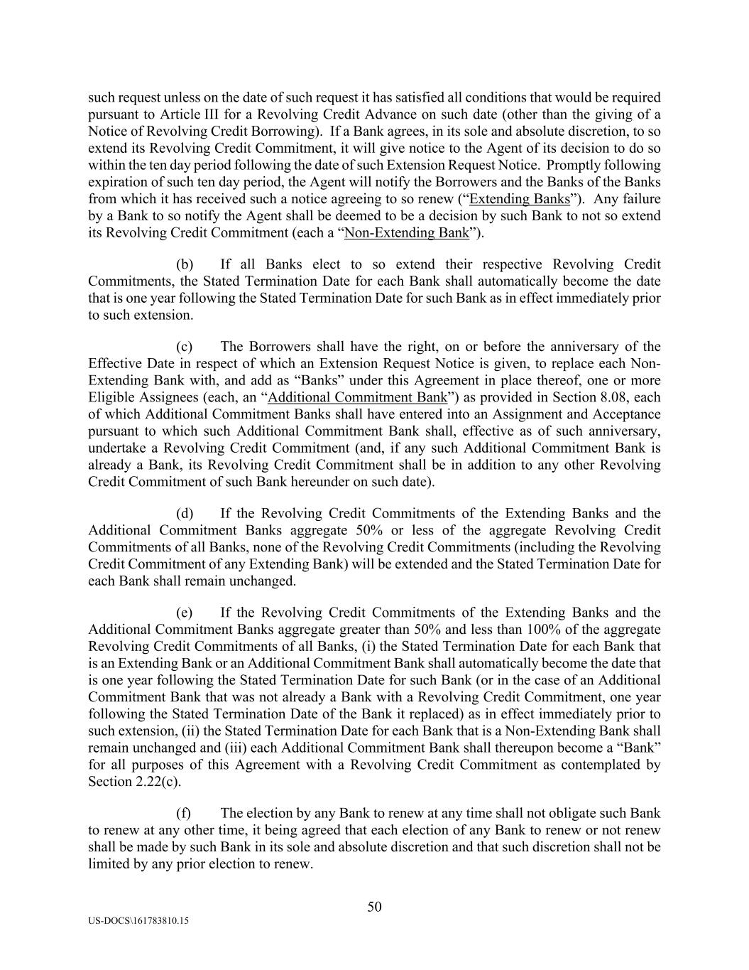 50 US-DOCS\161783810.15 such request unless on the date of such request it has satisfied all conditions that would be required pursuant to Article III for a Revolving Credit Advance on such date (other than the giving of a Notice of Revolving Credit Borrowing). If a Bank agrees, in its sole and absolute discretion, to so extend its Revolving Credit Commitment, it will give notice to the Agent of its decision to do so within the ten day period following the date of such Extension Request Notice. Promptly following expiration of such ten day period, the Agent will notify the Borrowers and the Banks of the Banks from which it has received such a notice agreeing to so renew (“Extending Banks”). Any failure by a Bank to so notify the Agent shall be deemed to be a decision by such Bank to not so extend its Revolving Credit Commitment (each a “Non-Extending Bank”). (b) If all Banks elect to so extend their respective Revolving Credit Commitments, the Stated Termination Date for each Bank shall automatically become the date that is one year following the Stated Termination Date for such Bank as in effect immediately prior to such extension. (c) The Borrowers shall have the right, on or before the anniversary of the Effective Date in respect of which an Extension Request Notice is given, to replace each Non- Extending Bank with, and add as “Banks” under this Agreement in place thereof, one or more Eligible Assignees (each, an “Additional Commitment Bank”) as provided in Section 8.08, each of which Additional Commitment Banks shall have entered into an Assignment and Acceptance pursuant to which such Additional Commitment Bank shall, effective as of such anniversary, undertake a Revolving Credit Commitment (and, if any such Additional Commitment Bank is already a Bank, its Revolving Credit Commitment shall be in addition to any other Revolving Credit Commitment of such Bank hereunder on such date). (d) If the Revolving Credit Commitments of the Extending Banks and the Additional Commitment Banks aggregate 50% or less of the aggregate Revolving Credit Commitments of all Banks, none of the Revolving Credit Commitments (including the Revolving Credit Commitment of any Extending Bank) will be extended and the Stated Termination Date for each Bank shall remain unchanged. (e) If the Revolving Credit Commitments of the Extending Banks and the Additional Commitment Banks aggregate greater than 50% and less than 100% of the aggregate Revolving Credit Commitments of all Banks, (i) the Stated Termination Date for each Bank that is an Extending Bank or an Additional Commitment Bank shall automatically become the date that is one year following the Stated Termination Date for such Bank (or in the case of an Additional Commitment Bank that was not already a Bank with a Revolving Credit Commitment, one year following the Stated Termination Date of the Bank it replaced) as in effect immediately prior to such extension, (ii) the Stated Termination Date for each Bank that is a Non-Extending Bank shall remain unchanged and (iii) each Additional Commitment Bank shall thereupon become a “Bank” for all purposes of this Agreement with a Revolving Credit Commitment as contemplated by Section 2.22(c). (f) The election by any Bank to renew at any time shall not obligate such Bank to renew at any other time, it being agreed that each election of any Bank to renew or not renew shall be made by such Bank in its sole and absolute discretion and that such discretion shall not be limited by any prior election to renew.