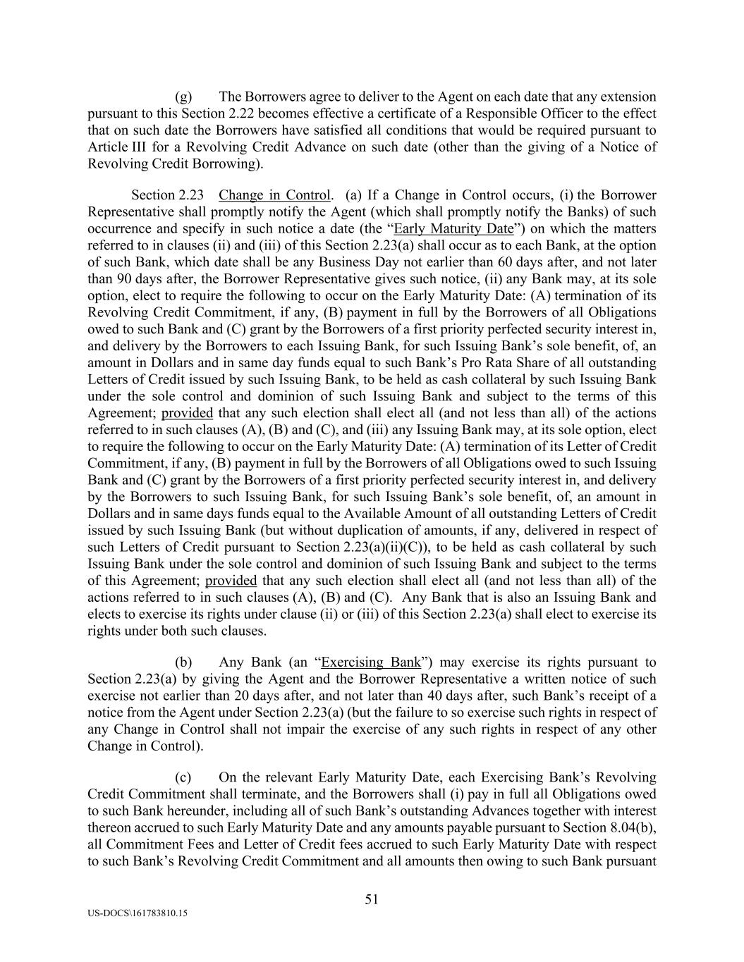 51 US-DOCS\161783810.15 (g) The Borrowers agree to deliver to the Agent on each date that any extension pursuant to this Section 2.22 becomes effective a certificate of a Responsible Officer to the effect that on such date the Borrowers have satisfied all conditions that would be required pursuant to Article III for a Revolving Credit Advance on such date (other than the giving of a Notice of Revolving Credit Borrowing). Section 2.23 Change in Control. (a) If a Change in Control occurs, (i) the Borrower Representative shall promptly notify the Agent (which shall promptly notify the Banks) of such occurrence and specify in such notice a date (the “Early Maturity Date”) on which the matters referred to in clauses (ii) and (iii) of this Section 2.23(a) shall occur as to each Bank, at the option of such Bank, which date shall be any Business Day not earlier than 60 days after, and not later than 90 days after, the Borrower Representative gives such notice, (ii) any Bank may, at its sole option, elect to require the following to occur on the Early Maturity Date: (A) termination of its Revolving Credit Commitment, if any, (B) payment in full by the Borrowers of all Obligations owed to such Bank and (C) grant by the Borrowers of a first priority perfected security interest in, and delivery by the Borrowers to each Issuing Bank, for such Issuing Bank’s sole benefit, of, an amount in Dollars and in same day funds equal to such Bank’s Pro Rata Share of all outstanding Letters of Credit issued by such Issuing Bank, to be held as cash collateral by such Issuing Bank under the sole control and dominion of such Issuing Bank and subject to the terms of this Agreement; provided that any such election shall elect all (and not less than all) of the actions referred to in such clauses (A), (B) and (C), and (iii) any Issuing Bank may, at its sole option, elect to require the following to occur on the Early Maturity Date: (A) termination of its Letter of Credit Commitment, if any, (B) payment in full by the Borrowers of all Obligations owed to such Issuing Bank and (C) grant by the Borrowers of a first priority perfected security interest in, and delivery by the Borrowers to such Issuing Bank, for such Issuing Bank’s sole benefit, of, an amount in Dollars and in same days funds equal to the Available Amount of all outstanding Letters of Credit issued by such Issuing Bank (but without duplication of amounts, if any, delivered in respect of such Letters of Credit pursuant to Section 2.23(a)(ii)(C)), to be held as cash collateral by such Issuing Bank under the sole control and dominion of such Issuing Bank and subject to the terms of this Agreement; provided that any such election shall elect all (and not less than all) of the actions referred to in such clauses (A), (B) and (C). Any Bank that is also an Issuing Bank and elects to exercise its rights under clause (ii) or (iii) of this Section 2.23(a) shall elect to exercise its rights under both such clauses. (b) Any Bank (an “Exercising Bank”) may exercise its rights pursuant to Section 2.23(a) by giving the Agent and the Borrower Representative a written notice of such exercise not earlier than 20 days after, and not later than 40 days after, such Bank’s receipt of a notice from the Agent under Section 2.23(a) (but the failure to so exercise such rights in respect of any Change in Control shall not impair the exercise of any such rights in respect of any other Change in Control). (c) On the relevant Early Maturity Date, each Exercising Bank’s Revolving Credit Commitment shall terminate, and the Borrowers shall (i) pay in full all Obligations owed to such Bank hereunder, including all of such Bank’s outstanding Advances together with interest thereon accrued to such Early Maturity Date and any amounts payable pursuant to Section 8.04(b), all Commitment Fees and Letter of Credit fees accrued to such Early Maturity Date with respect to such Bank’s Revolving Credit Commitment and all amounts then owing to such Bank pursuant