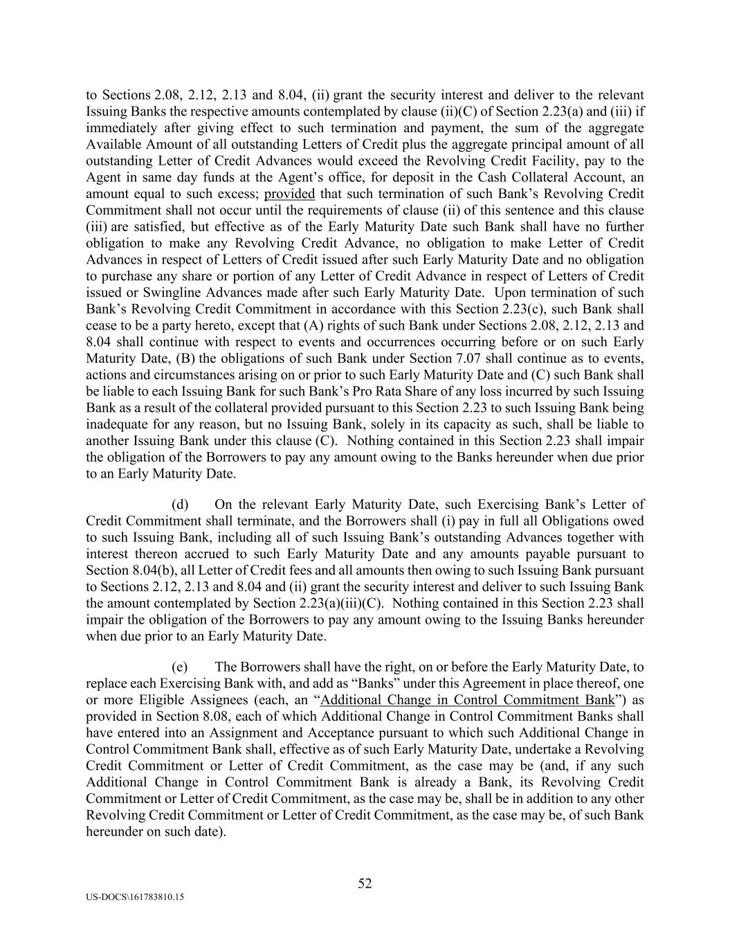 52 US-DOCS\161783810.15 to Sections 2.08, 2.12, 2.13 and 8.04, (ii) grant the security interest and deliver to the relevant Issuing Banks the respective amounts contemplated by clause (ii)(C) of Section 2.23(a) and (iii) if immediately after giving effect to such termination and payment, the sum of the aggregate Available Amount of all outstanding Letters of Credit plus the aggregate principal amount of all outstanding Letter of Credit Advances would exceed the Revolving Credit Facility, pay to the Agent in same day funds at the Agent’s office, for deposit in the Cash Collateral Account, an amount equal to such excess; provided that such termination of such Bank’s Revolving Credit Commitment shall not occur until the requirements of clause (ii) of this sentence and this clause (iii) are satisfied, but effective as of the Early Maturity Date such Bank shall have no further obligation to make any Revolving Credit Advance, no obligation to make Letter of Credit Advances in respect of Letters of Credit issued after such Early Maturity Date and no obligation to purchase any share or portion of any Letter of Credit Advance in respect of Letters of Credit issued or Swingline Advances made after such Early Maturity Date. Upon termination of such Bank’s Revolving Credit Commitment in accordance with this Section 2.23(c), such Bank shall cease to be a party hereto, except that (A) rights of such Bank under Sections 2.08, 2.12, 2.13 and 8.04 shall continue with respect to events and occurrences occurring before or on such Early Maturity Date, (B) the obligations of such Bank under Section 7.07 shall continue as to events, actions and circumstances arising on or prior to such Early Maturity Date and (C) such Bank shall be liable to each Issuing Bank for such Bank’s Pro Rata Share of any loss incurred by such Issuing Bank as a result of the collateral provided pursuant to this Section 2.23 to such Issuing Bank being inadequate for any reason, but no Issuing Bank, solely in its capacity as such, shall be liable to another Issuing Bank under this clause (C). Nothing contained in this Section 2.23 shall impair the obligation of the Borrowers to pay any amount owing to the Banks hereunder when due prior to an Early Maturity Date. (d) On the relevant Early Maturity Date, such Exercising Bank’s Letter of Credit Commitment shall terminate, and the Borrowers shall (i) pay in full all Obligations owed to such Issuing Bank, including all of such Issuing Bank’s outstanding Advances together with interest thereon accrued to such Early Maturity Date and any amounts payable pursuant to Section 8.04(b), all Letter of Credit fees and all amounts then owing to such Issuing Bank pursuant to Sections 2.12, 2.13 and 8.04 and (ii) grant the security interest and deliver to such Issuing Bank the amount contemplated by Section 2.23(a)(iii)(C). Nothing contained in this Section 2.23 shall impair the obligation of the Borrowers to pay any amount owing to the Issuing Banks hereunder when due prior to an Early Maturity Date. (e) The Borrowers shall have the right, on or before the Early Maturity Date, to replace each Exercising Bank with, and add as “Banks” under this Agreement in place thereof, one or more Eligible Assignees (each, an “Additional Change in Control Commitment Bank”) as provided in Section 8.08, each of which Additional Change in Control Commitment Banks shall have entered into an Assignment and Acceptance pursuant to which such Additional Change in Control Commitment Bank shall, effective as of such Early Maturity Date, undertake a Revolving Credit Commitment or Letter of Credit Commitment, as the case may be (and, if any such Additional Change in Control Commitment Bank is already a Bank, its Revolving Credit Commitment or Letter of Credit Commitment, as the case may be, shall be in addition to any other Revolving Credit Commitment or Letter of Credit Commitment, as the case may be, of such Bank hereunder on such date).