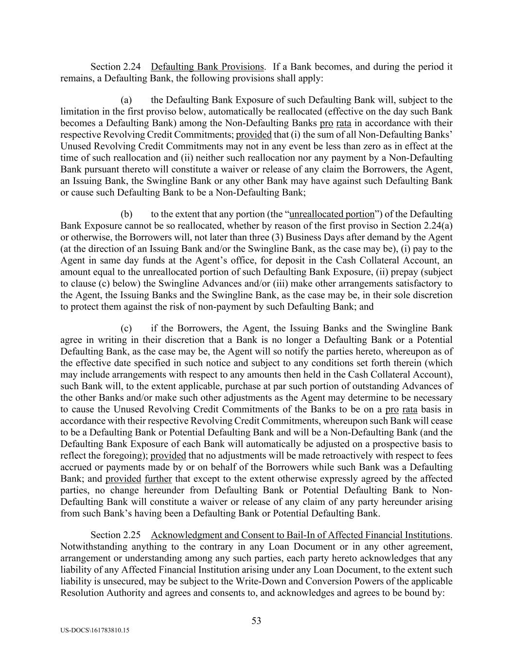 53 US-DOCS\161783810.15 Section 2.24 Defaulting Bank Provisions. If a Bank becomes, and during the period it remains, a Defaulting Bank, the following provisions shall apply: (a) the Defaulting Bank Exposure of such Defaulting Bank will, subject to the limitation in the first proviso below, automatically be reallocated (effective on the day such Bank becomes a Defaulting Bank) among the Non-Defaulting Banks pro rata in accordance with their respective Revolving Credit Commitments; provided that (i) the sum of all Non-Defaulting Banks’ Unused Revolving Credit Commitments may not in any event be less than zero as in effect at the time of such reallocation and (ii) neither such reallocation nor any payment by a Non-Defaulting Bank pursuant thereto will constitute a waiver or release of any claim the Borrowers, the Agent, an Issuing Bank, the Swingline Bank or any other Bank may have against such Defaulting Bank or cause such Defaulting Bank to be a Non-Defaulting Bank; (b) to the extent that any portion (the “unreallocated portion”) of the Defaulting Bank Exposure cannot be so reallocated, whether by reason of the first proviso in Section 2.24(a) or otherwise, the Borrowers will, not later than three (3) Business Days after demand by the Agent (at the direction of an Issuing Bank and/or the Swingline Bank, as the case may be), (i) pay to the Agent in same day funds at the Agent’s office, for deposit in the Cash Collateral Account, an amount equal to the unreallocated portion of such Defaulting Bank Exposure, (ii) prepay (subject to clause (c) below) the Swingline Advances and/or (iii) make other arrangements satisfactory to the Agent, the Issuing Banks and the Swingline Bank, as the case may be, in their sole discretion to protect them against the risk of non-payment by such Defaulting Bank; and (c) if the Borrowers, the Agent, the Issuing Banks and the Swingline Bank agree in writing in their discretion that a Bank is no longer a Defaulting Bank or a Potential Defaulting Bank, as the case may be, the Agent will so notify the parties hereto, whereupon as of the effective date specified in such notice and subject to any conditions set forth therein (which may include arrangements with respect to any amounts then held in the Cash Collateral Account), such Bank will, to the extent applicable, purchase at par such portion of outstanding Advances of the other Banks and/or make such other adjustments as the Agent may determine to be necessary to cause the Unused Revolving Credit Commitments of the Banks to be on a pro rata basis in accordance with their respective Revolving Credit Commitments, whereupon such Bank will cease to be a Defaulting Bank or Potential Defaulting Bank and will be a Non-Defaulting Bank (and the Defaulting Bank Exposure of each Bank will automatically be adjusted on a prospective basis to reflect the foregoing); provided that no adjustments will be made retroactively with respect to fees accrued or payments made by or on behalf of the Borrowers while such Bank was a Defaulting Bank; and provided further that except to the extent otherwise expressly agreed by the affected parties, no change hereunder from Defaulting Bank or Potential Defaulting Bank to Non- Defaulting Bank will constitute a waiver or release of any claim of any party hereunder arising from such Bank’s having been a Defaulting Bank or Potential Defaulting Bank. Section 2.25 Acknowledgment and Consent to Bail-In of Affected Financial Institutions. Notwithstanding anything to the contrary in any Loan Document or in any other agreement, arrangement or understanding among any such parties, each party hereto acknowledges that any liability of any Affected Financial Institution arising under any Loan Document, to the extent such liability is unsecured, may be subject to the Write-Down and Conversion Powers of the applicable Resolution Authority and agrees and consents to, and acknowledges and agrees to be bound by:
