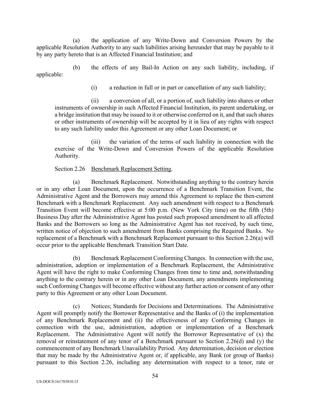 54 US-DOCS\161783810.15 (a) the application of any Write-Down and Conversion Powers by the applicable Resolution Authority to any such liabilities arising hereunder that may be payable to it by any party hereto that is an Affected Financial Institution; and (b) the effects of any Bail-In Action on any such liability, including, if applicable: (i) a reduction in full or in part or cancellation of any such liability; (ii) a conversion of all, or a portion of, such liability into shares or other instruments of ownership in such Affected Financial Institution, its parent undertaking, or a bridge institution that may be issued to it or otherwise conferred on it, and that such shares or other instruments of ownership will be accepted by it in lieu of any rights with respect to any such liability under this Agreement or any other Loan Document; or (iii) the variation of the terms of such liability in connection with the exercise of the Write-Down and Conversion Powers of the applicable Resolution Authority. Section 2.26 Benchmark Replacement Setting. (a) Benchmark Replacement. Notwithstanding anything to the contrary herein or in any other Loan Document, upon the occurrence of a Benchmark Transition Event, the Administrative Agent and the Borrowers may amend this Agreement to replace the then-current Benchmark with a Benchmark Replacement. Any such amendment with respect to a Benchmark Transition Event will become effective at 5:00 p.m. (New York City time) on the fifth (5th) Business Day after the Administrative Agent has posted such proposed amendment to all affected Banks and the Borrowers so long as the Administrative Agent has not received, by such time, written notice of objection to such amendment from Banks comprising the Required Banks. No replacement of a Benchmark with a Benchmark Replacement pursuant to this Section 2.26(a) will occur prior to the applicable Benchmark Transition Start Date. (b) Benchmark Replacement Conforming Changes. In connection with the use, administration, adoption or implementation of a Benchmark Replacement, the Administrative Agent will have the right to make Conforming Changes from time to time and, notwithstanding anything to the contrary herein or in any other Loan Document, any amendments implementing such Conforming Changes will become effective without any further action or consent of any other party to this Agreement or any other Loan Document. (c) Notices; Standards for Decisions and Determinations. The Administrative Agent will promptly notify the Borrower Representative and the Banks of (i) the implementation of any Benchmark Replacement and (ii) the effectiveness of any Conforming Changes in connection with the use, administration, adoption or implementation of a Benchmark Replacement. The Administrative Agent will notify the Borrower Representative of (x) the removal or reinstatement of any tenor of a Benchmark pursuant to Section 2.26(d) and (y) the commencement of any Benchmark Unavailability Period. Any determination, decision or election that may be made by the Administrative Agent or, if applicable, any Bank (or group of Banks) pursuant to this Section 2.26, including any determination with respect to a tenor, rate or