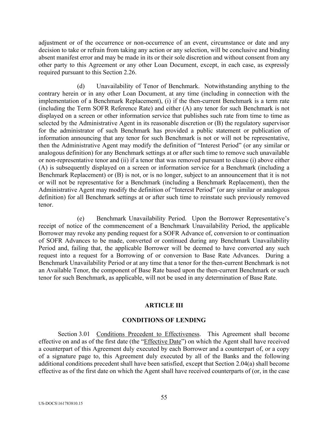 55 US-DOCS\161783810.15 adjustment or of the occurrence or non-occurrence of an event, circumstance or date and any decision to take or refrain from taking any action or any selection, will be conclusive and binding absent manifest error and may be made in its or their sole discretion and without consent from any other party to this Agreement or any other Loan Document, except, in each case, as expressly required pursuant to this Section 2.26. (d) Unavailability of Tenor of Benchmark. Notwithstanding anything to the contrary herein or in any other Loan Document, at any time (including in connection with the implementation of a Benchmark Replacement), (i) if the then-current Benchmark is a term rate (including the Term SOFR Reference Rate) and either (A) any tenor for such Benchmark is not displayed on a screen or other information service that publishes such rate from time to time as selected by the Administrative Agent in its reasonable discretion or (B) the regulatory supervisor for the administrator of such Benchmark has provided a public statement or publication of information announcing that any tenor for such Benchmark is not or will not be representative, then the Administrative Agent may modify the definition of “Interest Period” (or any similar or analogous definition) for any Benchmark settings at or after such time to remove such unavailable or non-representative tenor and (ii) if a tenor that was removed pursuant to clause (i) above either (A) is subsequently displayed on a screen or information service for a Benchmark (including a Benchmark Replacement) or (B) is not, or is no longer, subject to an announcement that it is not or will not be representative for a Benchmark (including a Benchmark Replacement), then the Administrative Agent may modify the definition of “Interest Period” (or any similar or analogous definition) for all Benchmark settings at or after such time to reinstate such previously removed tenor. (e) Benchmark Unavailability Period. Upon the Borrower Representative’s receipt of notice of the commencement of a Benchmark Unavailability Period, the applicable Borrower may revoke any pending request for a SOFR Advance of, conversion to or continuation of SOFR Advances to be made, converted or continued during any Benchmark Unavailability Period and, failing that, the applicable Borrower will be deemed to have converted any such request into a request for a Borrowing of or conversion to Base Rate Advances. During a Benchmark Unavailability Period or at any time that a tenor for the then-current Benchmark is not an Available Tenor, the component of Base Rate based upon the then-current Benchmark or such tenor for such Benchmark, as applicable, will not be used in any determination of Base Rate. ARTICLE III CONDITIONS OF LENDING Section 3.01 Conditions Precedent to Effectiveness. This Agreement shall become effective on and as of the first date (the “Effective Date”) on which the Agent shall have received a counterpart of this Agreement duly executed by each Borrower and a counterpart of, or a copy of a signature page to, this Agreement duly executed by all of the Banks and the following additional conditions precedent shall have been satisfied, except that Section 2.04(a) shall become effective as of the first date on which the Agent shall have received counterparts of (or, in the case