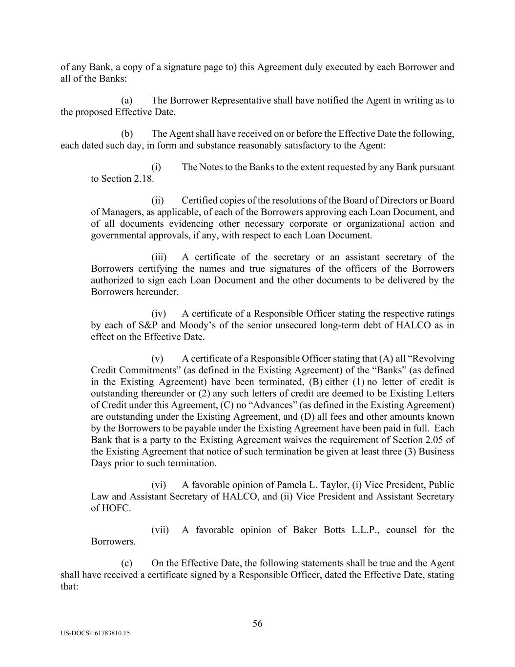 56 US-DOCS\161783810.15 of any Bank, a copy of a signature page to) this Agreement duly executed by each Borrower and all of the Banks: (a) The Borrower Representative shall have notified the Agent in writing as to the proposed Effective Date. (b) The Agent shall have received on or before the Effective Date the following, each dated such day, in form and substance reasonably satisfactory to the Agent: (i) The Notes to the Banks to the extent requested by any Bank pursuant to Section 2.18. (ii) Certified copies of the resolutions of the Board of Directors or Board of Managers, as applicable, of each of the Borrowers approving each Loan Document, and of all documents evidencing other necessary corporate or organizational action and governmental approvals, if any, with respect to each Loan Document. (iii) A certificate of the secretary or an assistant secretary of the Borrowers certifying the names and true signatures of the officers of the Borrowers authorized to sign each Loan Document and the other documents to be delivered by the Borrowers hereunder. (iv) A certificate of a Responsible Officer stating the respective ratings by each of S&P and Moody’s of the senior unsecured long-term debt of HALCO as in effect on the Effective Date. (v) A certificate of a Responsible Officer stating that (A) all “Revolving Credit Commitments” (as defined in the Existing Agreement) of the “Banks” (as defined in the Existing Agreement) have been terminated, (B) either (1) no letter of credit is outstanding thereunder or (2) any such letters of credit are deemed to be Existing Letters of Credit under this Agreement, (C) no “Advances” (as defined in the Existing Agreement) are outstanding under the Existing Agreement, and (D) all fees and other amounts known by the Borrowers to be payable under the Existing Agreement have been paid in full. Each Bank that is a party to the Existing Agreement waives the requirement of Section 2.05 of the Existing Agreement that notice of such termination be given at least three (3) Business Days prior to such termination. (vi) A favorable opinion of Pamela L. Taylor, (i) Vice President, Public Law and Assistant Secretary of HALCO, and (ii) Vice President and Assistant Secretary of HOFC. (vii) A favorable opinion of Baker Botts L.L.P., counsel for the Borrowers. (c) On the Effective Date, the following statements shall be true and the Agent shall have received a certificate signed by a Responsible Officer, dated the Effective Date, stating that: