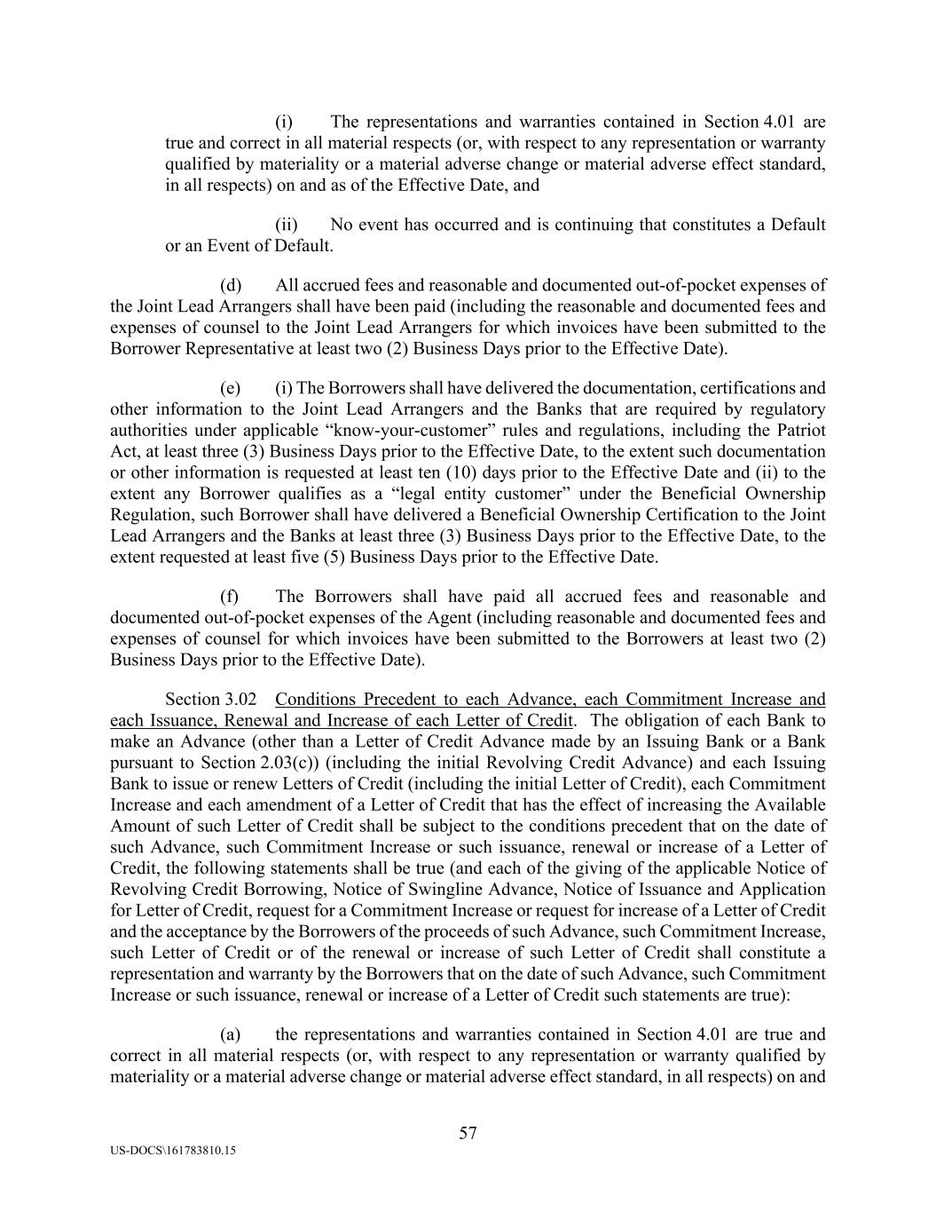 57 US-DOCS\161783810.15 (i) The representations and warranties contained in Section 4.01 are true and correct in all material respects (or, with respect to any representation or warranty qualified by materiality or a material adverse change or material adverse effect standard, in all respects) on and as of the Effective Date, and (ii) No event has occurred and is continuing that constitutes a Default or an Event of Default. (d) All accrued fees and reasonable and documented out-of-pocket expenses of the Joint Lead Arrangers shall have been paid (including the reasonable and documented fees and expenses of counsel to the Joint Lead Arrangers for which invoices have been submitted to the Borrower Representative at least two (2) Business Days prior to the Effective Date). (e) (i) The Borrowers shall have delivered the documentation, certifications and other information to the Joint Lead Arrangers and the Banks that are required by regulatory authorities under applicable “know-your-customer” rules and regulations, including the Patriot Act, at least three (3) Business Days prior to the Effective Date, to the extent such documentation or other information is requested at least ten (10) days prior to the Effective Date and (ii) to the extent any Borrower qualifies as a “legal entity customer” under the Beneficial Ownership Regulation, such Borrower shall have delivered a Beneficial Ownership Certification to the Joint Lead Arrangers and the Banks at least three (3) Business Days prior to the Effective Date, to the extent requested at least five (5) Business Days prior to the Effective Date. (f) The Borrowers shall have paid all accrued fees and reasonable and documented out-of-pocket expenses of the Agent (including reasonable and documented fees and expenses of counsel for which invoices have been submitted to the Borrowers at least two (2) Business Days prior to the Effective Date). Section 3.02 Conditions Precedent to each Advance, each Commitment Increase and each Issuance, Renewal and Increase of each Letter of Credit. The obligation of each Bank to make an Advance (other than a Letter of Credit Advance made by an Issuing Bank or a Bank pursuant to Section 2.03(c)) (including the initial Revolving Credit Advance) and each Issuing Bank to issue or renew Letters of Credit (including the initial Letter of Credit), each Commitment Increase and each amendment of a Letter of Credit that has the effect of increasing the Available Amount of such Letter of Credit shall be subject to the conditions precedent that on the date of such Advance, such Commitment Increase or such issuance, renewal or increase of a Letter of Credit, the following statements shall be true (and each of the giving of the applicable Notice of Revolving Credit Borrowing, Notice of Swingline Advance, Notice of Issuance and Application for Letter of Credit, request for a Commitment Increase or request for increase of a Letter of Credit and the acceptance by the Borrowers of the proceeds of such Advance, such Commitment Increase, such Letter of Credit or of the renewal or increase of such Letter of Credit shall constitute a representation and warranty by the Borrowers that on the date of such Advance, such Commitment Increase or such issuance, renewal or increase of a Letter of Credit such statements are true): (a) the representations and warranties contained in Section 4.01 are true and correct in all material respects (or, with respect to any representation or warranty qualified by materiality or a material adverse change or material adverse effect standard, in all respects) on and