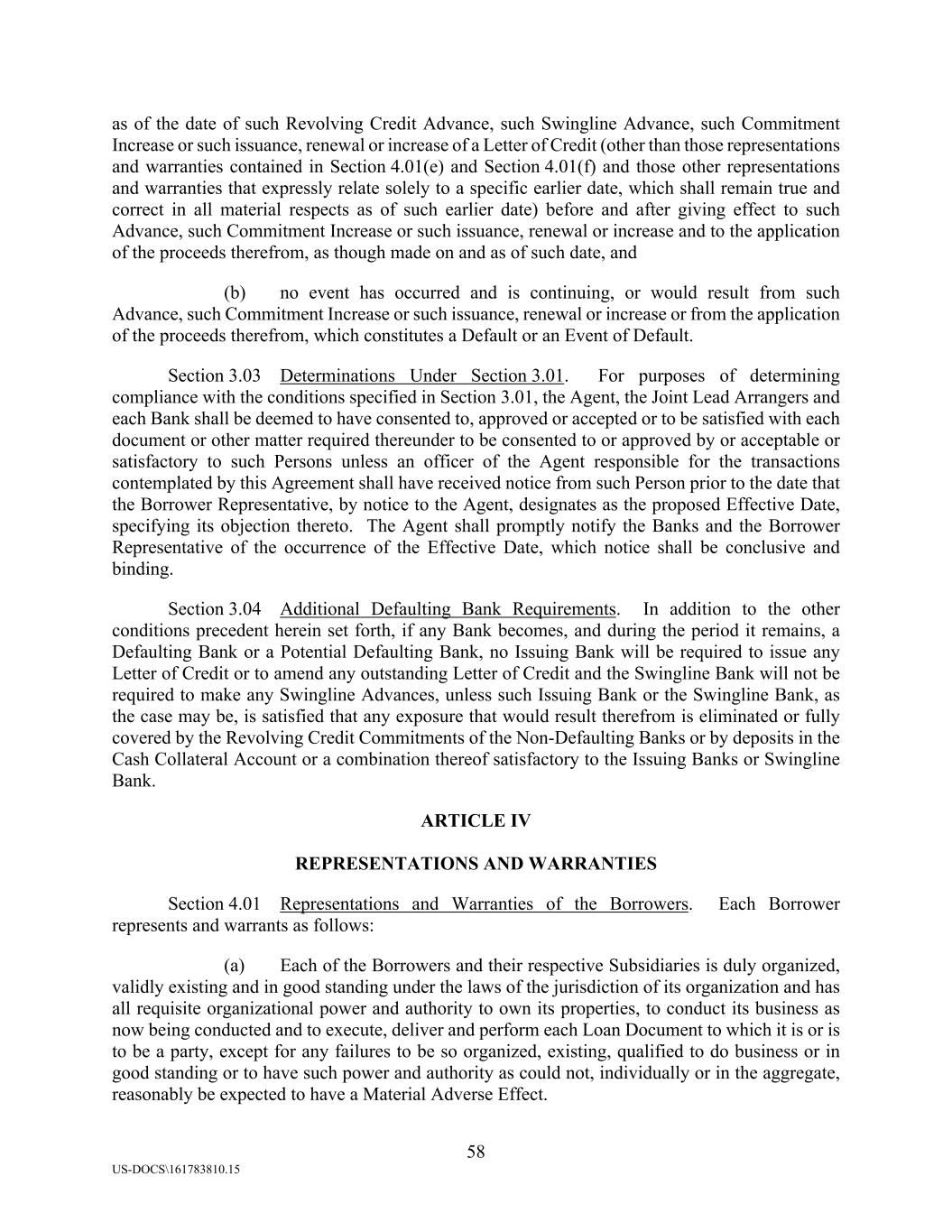 58 US-DOCS\161783810.15 as of the date of such Revolving Credit Advance, such Swingline Advance, such Commitment Increase or such issuance, renewal or increase of a Letter of Credit (other than those representations and warranties contained in Section 4.01(e) and Section 4.01(f) and those other representations and warranties that expressly relate solely to a specific earlier date, which shall remain true and correct in all material respects as of such earlier date) before and after giving effect to such Advance, such Commitment Increase or such issuance, renewal or increase and to the application of the proceeds therefrom, as though made on and as of such date, and (b) no event has occurred and is continuing, or would result from such Advance, such Commitment Increase or such issuance, renewal or increase or from the application of the proceeds therefrom, which constitutes a Default or an Event of Default. Section 3.03 Determinations Under Section 3.01. For purposes of determining compliance with the conditions specified in Section 3.01, the Agent, the Joint Lead Arrangers and each Bank shall be deemed to have consented to, approved or accepted or to be satisfied with each document or other matter required thereunder to be consented to or approved by or acceptable or satisfactory to such Persons unless an officer of the Agent responsible for the transactions contemplated by this Agreement shall have received notice from such Person prior to the date that the Borrower Representative, by notice to the Agent, designates as the proposed Effective Date, specifying its objection thereto. The Agent shall promptly notify the Banks and the Borrower Representative of the occurrence of the Effective Date, which notice shall be conclusive and binding. Section 3.04 Additional Defaulting Bank Requirements. In addition to the other conditions precedent herein set forth, if any Bank becomes, and during the period it remains, a Defaulting Bank or a Potential Defaulting Bank, no Issuing Bank will be required to issue any Letter of Credit or to amend any outstanding Letter of Credit and the Swingline Bank will not be required to make any Swingline Advances, unless such Issuing Bank or the Swingline Bank, as the case may be, is satisfied that any exposure that would result therefrom is eliminated or fully covered by the Revolving Credit Commitments of the Non-Defaulting Banks or by deposits in the Cash Collateral Account or a combination thereof satisfactory to the Issuing Banks or Swingline Bank. ARTICLE IV REPRESENTATIONS AND WARRANTIES Section 4.01 Representations and Warranties of the Borrowers. Each Borrower represents and warrants as follows: (a) Each of the Borrowers and their respective Subsidiaries is duly organized, validly existing and in good standing under the laws of the jurisdiction of its organization and has all requisite organizational power and authority to own its properties, to conduct its business as now being conducted and to execute, deliver and perform each Loan Document to which it is or is to be a party, except for any failures to be so organized, existing, qualified to do business or in good standing or to have such power and authority as could not, individually or in the aggregate, reasonably be expected to have a Material Adverse Effect.