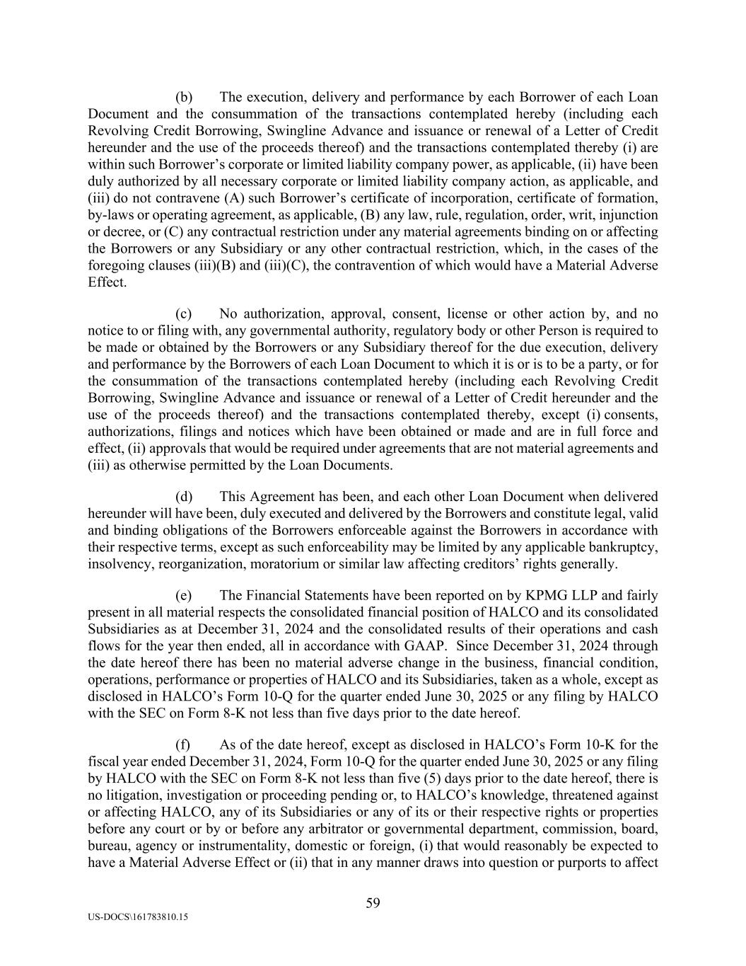 59 US-DOCS\161783810.15 (b) The execution, delivery and performance by each Borrower of each Loan Document and the consummation of the transactions contemplated hereby (including each Revolving Credit Borrowing, Swingline Advance and issuance or renewal of a Letter of Credit hereunder and the use of the proceeds thereof) and the transactions contemplated thereby (i) are within such Borrower’s corporate or limited liability company power, as applicable, (ii) have been duly authorized by all necessary corporate or limited liability company action, as applicable, and (iii) do not contravene (A) such Borrower’s certificate of incorporation, certificate of formation, by-laws or operating agreement, as applicable, (B) any law, rule, regulation, order, writ, injunction or decree, or (C) any contractual restriction under any material agreements binding on or affecting the Borrowers or any Subsidiary or any other contractual restriction, which, in the cases of the foregoing clauses (iii)(B) and (iii)(C), the contravention of which would have a Material Adverse Effect. (c) No authorization, approval, consent, license or other action by, and no notice to or filing with, any governmental authority, regulatory body or other Person is required to be made or obtained by the Borrowers or any Subsidiary thereof for the due execution, delivery and performance by the Borrowers of each Loan Document to which it is or is to be a party, or for the consummation of the transactions contemplated hereby (including each Revolving Credit Borrowing, Swingline Advance and issuance or renewal of a Letter of Credit hereunder and the use of the proceeds thereof) and the transactions contemplated thereby, except (i) consents, authorizations, filings and notices which have been obtained or made and are in full force and effect, (ii) approvals that would be required under agreements that are not material agreements and (iii) as otherwise permitted by the Loan Documents. (d) This Agreement has been, and each other Loan Document when delivered hereunder will have been, duly executed and delivered by the Borrowers and constitute legal, valid and binding obligations of the Borrowers enforceable against the Borrowers in accordance with their respective terms, except as such enforceability may be limited by any applicable bankruptcy, insolvency, reorganization, moratorium or similar law affecting creditors’ rights generally. (e) The Financial Statements have been reported on by KPMG LLP and fairly present in all material respects the consolidated financial position of HALCO and its consolidated Subsidiaries as at December 31, 2024 and the consolidated results of their operations and cash flows for the year then ended, all in accordance with GAAP. Since December 31, 2024 through the date hereof there has been no material adverse change in the business, financial condition, operations, performance or properties of HALCO and its Subsidiaries, taken as a whole, except as disclosed in HALCO’s Form 10-Q for the quarter ended June 30, 2025 or any filing by HALCO with the SEC on Form 8-K not less than five days prior to the date hereof. (f) As of the date hereof, except as disclosed in HALCO’s Form 10-K for the fiscal year ended December 31, 2024, Form 10-Q for the quarter ended June 30, 2025 or any filing by HALCO with the SEC on Form 8-K not less than five (5) days prior to the date hereof, there is no litigation, investigation or proceeding pending or, to HALCO’s knowledge, threatened against or affecting HALCO, any of its Subsidiaries or any of its or their respective rights or properties before any court or by or before any arbitrator or governmental department, commission, board, bureau, agency or instrumentality, domestic or foreign, (i) that would reasonably be expected to have a Material Adverse Effect or (ii) that in any manner draws into question or purports to affect