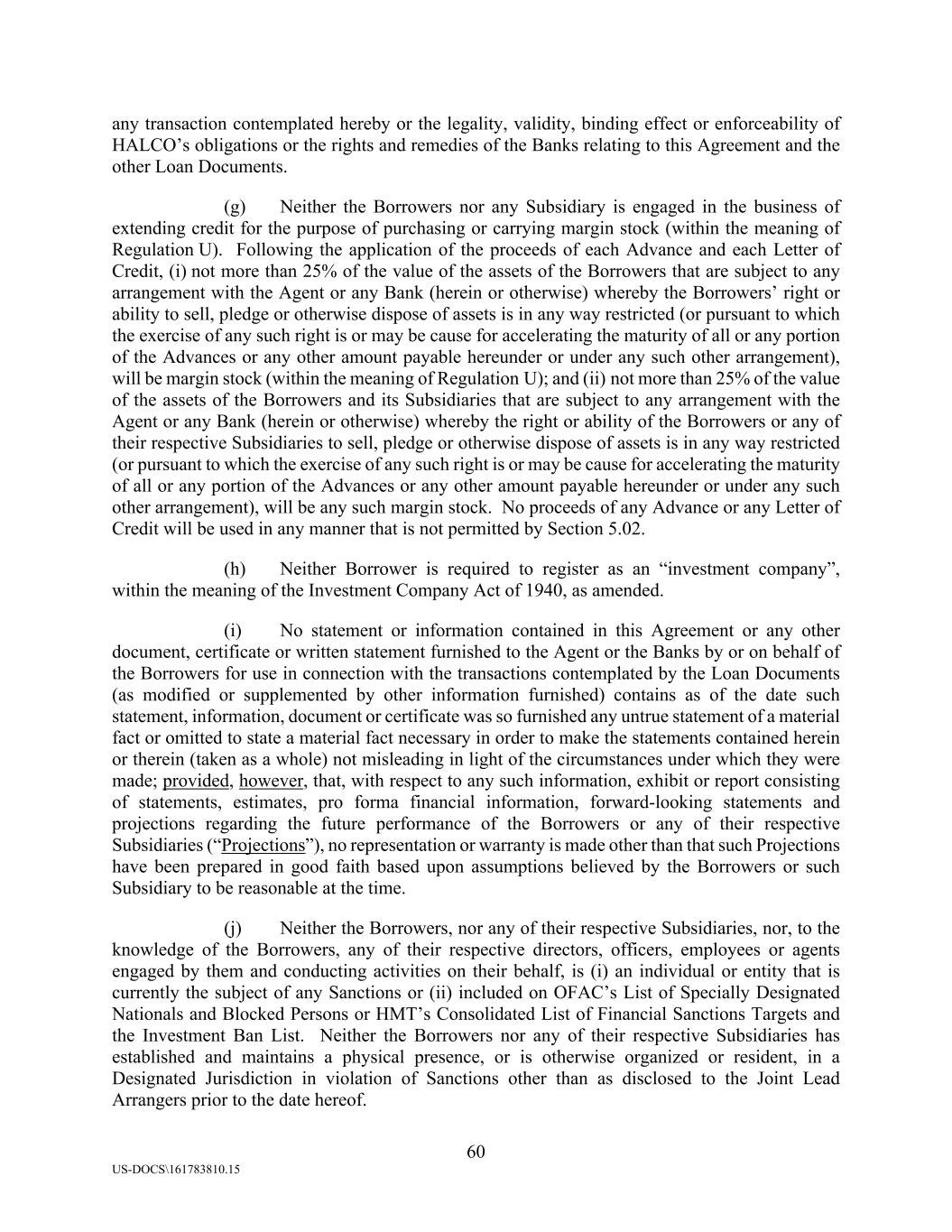 60 US-DOCS\161783810.15 any transaction contemplated hereby or the legality, validity, binding effect or enforceability of HALCO’s obligations or the rights and remedies of the Banks relating to this Agreement and the other Loan Documents. (g) Neither the Borrowers nor any Subsidiary is engaged in the business of extending credit for the purpose of purchasing or carrying margin stock (within the meaning of Regulation U). Following the application of the proceeds of each Advance and each Letter of Credit, (i) not more than 25% of the value of the assets of the Borrowers that are subject to any arrangement with the Agent or any Bank (herein or otherwise) whereby the Borrowers’ right or ability to sell, pledge or otherwise dispose of assets is in any way restricted (or pursuant to which the exercise of any such right is or may be cause for accelerating the maturity of all or any portion of the Advances or any other amount payable hereunder or under any such other arrangement), will be margin stock (within the meaning of Regulation U); and (ii) not more than 25% of the value of the assets of the Borrowers and its Subsidiaries that are subject to any arrangement with the Agent or any Bank (herein or otherwise) whereby the right or ability of the Borrowers or any of their respective Subsidiaries to sell, pledge or otherwise dispose of assets is in any way restricted (or pursuant to which the exercise of any such right is or may be cause for accelerating the maturity of all or any portion of the Advances or any other amount payable hereunder or under any such other arrangement), will be any such margin stock. No proceeds of any Advance or any Letter of Credit will be used in any manner that is not permitted by Section 5.02. (h) Neither Borrower is required to register as an “investment company”, within the meaning of the Investment Company Act of 1940, as amended. (i) No statement or information contained in this Agreement or any other document, certificate or written statement furnished to the Agent or the Banks by or on behalf of the Borrowers for use in connection with the transactions contemplated by the Loan Documents (as modified or supplemented by other information furnished) contains as of the date such statement, information, document or certificate was so furnished any untrue statement of a material fact or omitted to state a material fact necessary in order to make the statements contained herein or therein (taken as a whole) not misleading in light of the circumstances under which they were made; provided, however, that, with respect to any such information, exhibit or report consisting of statements, estimates, pro forma financial information, forward-looking statements and projections regarding the future performance of the Borrowers or any of their respective Subsidiaries (“Projections”), no representation or warranty is made other than that such Projections have been prepared in good faith based upon assumptions believed by the Borrowers or such Subsidiary to be reasonable at the time. (j) Neither the Borrowers, nor any of their respective Subsidiaries, nor, to the knowledge of the Borrowers, any of their respective directors, officers, employees or agents engaged by them and conducting activities on their behalf, is (i) an individual or entity that is currently the subject of any Sanctions or (ii) included on OFAC’s List of Specially Designated Nationals and Blocked Persons or HMT’s Consolidated List of Financial Sanctions Targets and the Investment Ban List. Neither the Borrowers nor any of their respective Subsidiaries has established and maintains a physical presence, or is otherwise organized or resident, in a Designated Jurisdiction in violation of Sanctions other than as disclosed to the Joint Lead Arrangers prior to the date hereof.