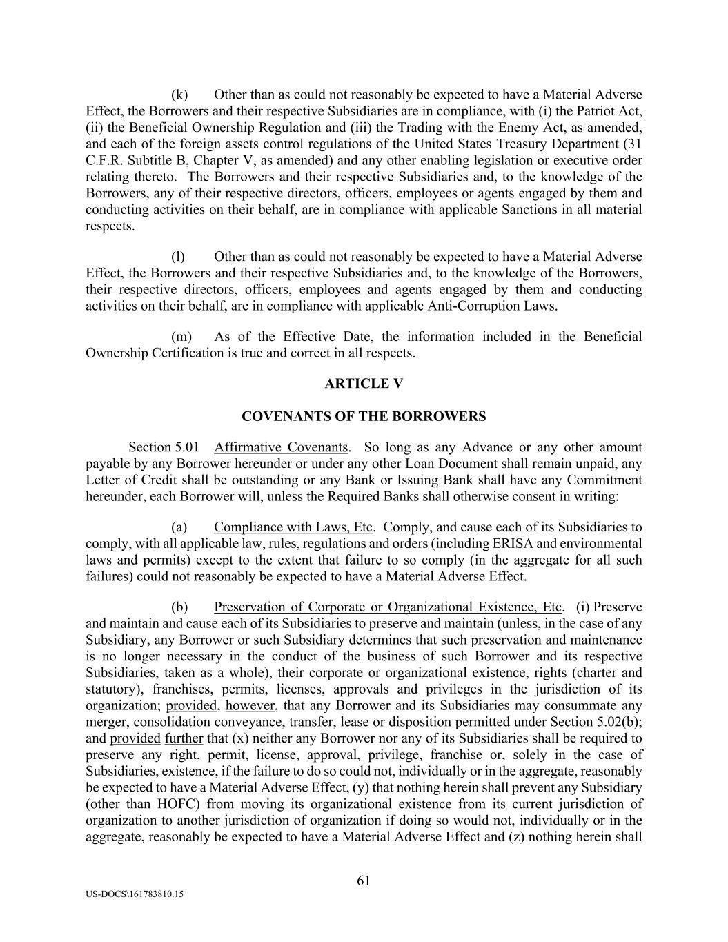 61 US-DOCS\161783810.15 (k) Other than as could not reasonably be expected to have a Material Adverse Effect, the Borrowers and their respective Subsidiaries are in compliance, with (i) the Patriot Act, (ii) the Beneficial Ownership Regulation and (iii) the Trading with the Enemy Act, as amended, and each of the foreign assets control regulations of the United States Treasury Department (31 C.F.R. Subtitle B, Chapter V, as amended) and any other enabling legislation or executive order relating thereto. The Borrowers and their respective Subsidiaries and, to the knowledge of the Borrowers, any of their respective directors, officers, employees or agents engaged by them and conducting activities on their behalf, are in compliance with applicable Sanctions in all material respects. (l) Other than as could not reasonably be expected to have a Material Adverse Effect, the Borrowers and their respective Subsidiaries and, to the knowledge of the Borrowers, their respective directors, officers, employees and agents engaged by them and conducting activities on their behalf, are in compliance with applicable Anti-Corruption Laws. (m) As of the Effective Date, the information included in the Beneficial Ownership Certification is true and correct in all respects. ARTICLE V COVENANTS OF THE BORROWERS Section 5.01 Affirmative Covenants. So long as any Advance or any other amount payable by any Borrower hereunder or under any other Loan Document shall remain unpaid, any Letter of Credit shall be outstanding or any Bank or Issuing Bank shall have any Commitment hereunder, each Borrower will, unless the Required Banks shall otherwise consent in writing: (a) Compliance with Laws, Etc. Comply, and cause each of its Subsidiaries to comply, with all applicable law, rules, regulations and orders (including ERISA and environmental laws and permits) except to the extent that failure to so comply (in the aggregate for all such failures) could not reasonably be expected to have a Material Adverse Effect. (b) Preservation of Corporate or Organizational Existence, Etc. (i) Preserve and maintain and cause each of its Subsidiaries to preserve and maintain (unless, in the case of any Subsidiary, any Borrower or such Subsidiary determines that such preservation and maintenance is no longer necessary in the conduct of the business of such Borrower and its respective Subsidiaries, taken as a whole), their corporate or organizational existence, rights (charter and statutory), franchises, permits, licenses, approvals and privileges in the jurisdiction of its organization; provided, however, that any Borrower and its Subsidiaries may consummate any merger, consolidation conveyance, transfer, lease or disposition permitted under Section 5.02(b); and provided further that (x) neither any Borrower nor any of its Subsidiaries shall be required to preserve any right, permit, license, approval, privilege, franchise or, solely in the case of Subsidiaries, existence, if the failure to do so could not, individually or in the aggregate, reasonably be expected to have a Material Adverse Effect, (y) that nothing herein shall prevent any Subsidiary (other than HOFC) from moving its organizational existence from its current jurisdiction of organization to another jurisdiction of organization if doing so would not, individually or in the aggregate, reasonably be expected to have a Material Adverse Effect and (z) nothing herein shall
