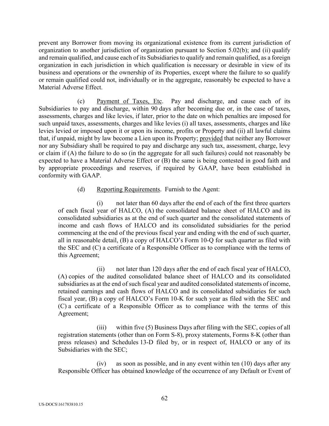 62 US-DOCS\161783810.15 prevent any Borrower from moving its organizational existence from its current jurisdiction of organization to another jurisdiction of organization pursuant to Section 5.02(b); and (ii) qualify and remain qualified, and cause each of its Subsidiaries to qualify and remain qualified, as a foreign organization in each jurisdiction in which qualification is necessary or desirable in view of its business and operations or the ownership of its Properties, except where the failure to so qualify or remain qualified could not, individually or in the aggregate, reasonably be expected to have a Material Adverse Effect. (c) Payment of Taxes, Etc. Pay and discharge, and cause each of its Subsidiaries to pay and discharge, within 90 days after becoming due or, in the case of taxes, assessments, charges and like levies, if later, prior to the date on which penalties are imposed for such unpaid taxes, assessments, charges and like levies (i) all taxes, assessments, charges and like levies levied or imposed upon it or upon its income, profits or Property and (ii) all lawful claims that, if unpaid, might by law become a Lien upon its Property; provided that neither any Borrower nor any Subsidiary shall be required to pay and discharge any such tax, assessment, charge, levy or claim if (A) the failure to do so (in the aggregate for all such failures) could not reasonably be expected to have a Material Adverse Effect or (B) the same is being contested in good faith and by appropriate proceedings and reserves, if required by GAAP, have been established in conformity with GAAP. (d) Reporting Requirements. Furnish to the Agent: (i) not later than 60 days after the end of each of the first three quarters of each fiscal year of HALCO, (A) the consolidated balance sheet of HALCO and its consolidated subsidiaries as at the end of such quarter and the consolidated statements of income and cash flows of HALCO and its consolidated subsidiaries for the period commencing at the end of the previous fiscal year and ending with the end of such quarter, all in reasonable detail, (B) a copy of HALCO’s Form 10-Q for such quarter as filed with the SEC and (C) a certificate of a Responsible Officer as to compliance with the terms of this Agreement; (ii) not later than 120 days after the end of each fiscal year of HALCO, (A) copies of the audited consolidated balance sheet of HALCO and its consolidated subsidiaries as at the end of such fiscal year and audited consolidated statements of income, retained earnings and cash flows of HALCO and its consolidated subsidiaries for such fiscal year, (B) a copy of HALCO’s Form 10-K for such year as filed with the SEC and (C) a certificate of a Responsible Officer as to compliance with the terms of this Agreement; (iii) within five (5) Business Days after filing with the SEC, copies of all registration statements (other than on Form S-8), proxy statements, Forms 8-K (other than press releases) and Schedules 13-D filed by, or in respect of, HALCO or any of its Subsidiaries with the SEC; (iv) as soon as possible, and in any event within ten (10) days after any Responsible Officer has obtained knowledge of the occurrence of any Default or Event of