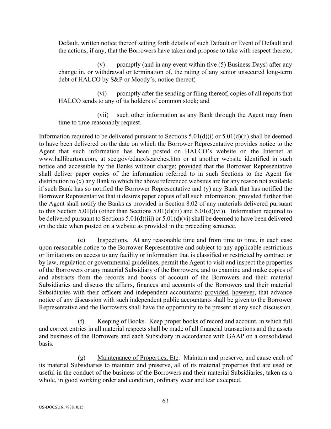 63 US-DOCS\161783810.15 Default, written notice thereof setting forth details of such Default or Event of Default and the actions, if any, that the Borrowers have taken and propose to take with respect thereto; (v) promptly (and in any event within five (5) Business Days) after any change in, or withdrawal or termination of, the rating of any senior unsecured long-term debt of HALCO by S&P or Moody’s, notice thereof; (vi) promptly after the sending or filing thereof, copies of all reports that HALCO sends to any of its holders of common stock; and (vii) such other information as any Bank through the Agent may from time to time reasonably request. Information required to be delivered pursuant to Sections 5.01(d)(i) or 5.01(d)(ii) shall be deemed to have been delivered on the date on which the Borrower Representative provides notice to the Agent that such information has been posted on HALCO’s website on the Internet at www.halliburton.com, at sec.gov/edaux/searches.htm or at another website identified in such notice and accessible by the Banks without charge; provided that the Borrower Representative shall deliver paper copies of the information referred to in such Sections to the Agent for distribution to (x) any Bank to which the above referenced websites are for any reason not available if such Bank has so notified the Borrower Representative and (y) any Bank that has notified the Borrower Representative that it desires paper copies of all such information; provided further that the Agent shall notify the Banks as provided in Section 8.02 of any materials delivered pursuant to this Section 5.01(d) (other than Sections 5.01(d)(iii) and 5.01(d)(vi)). Information required to be delivered pursuant to Sections 5.01(d)(iii) or 5.01(d)(vi) shall be deemed to have been delivered on the date when posted on a website as provided in the preceding sentence. (e) Inspections. At any reasonable time and from time to time, in each case upon reasonable notice to the Borrower Representative and subject to any applicable restrictions or limitations on access to any facility or information that is classified or restricted by contract or by law, regulation or governmental guidelines, permit the Agent to visit and inspect the properties of the Borrowers or any material Subsidiary of the Borrowers, and to examine and make copies of and abstracts from the records and books of account of the Borrowers and their material Subsidiaries and discuss the affairs, finances and accounts of the Borrowers and their material Subsidiaries with their officers and independent accountants; provided, however, that advance notice of any discussion with such independent public accountants shall be given to the Borrower Representative and the Borrowers shall have the opportunity to be present at any such discussion. (f) Keeping of Books. Keep proper books of record and account, in which full and correct entries in all material respects shall be made of all financial transactions and the assets and business of the Borrowers and each Subsidiary in accordance with GAAP on a consolidated basis. (g) Maintenance of Properties, Etc. Maintain and preserve, and cause each of its material Subsidiaries to maintain and preserve, all of its material properties that are used or useful in the conduct of the business of the Borrowers and their material Subsidiaries, taken as a whole, in good working order and condition, ordinary wear and tear excepted.