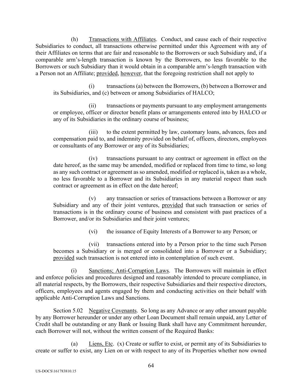 64 US-DOCS\161783810.15 (h) Transactions with Affiliates. Conduct, and cause each of their respective Subsidiaries to conduct, all transactions otherwise permitted under this Agreement with any of their Affiliates on terms that are fair and reasonable to the Borrowers or such Subsidiary and, if a comparable arm’s-length transaction is known by the Borrowers, no less favorable to the Borrowers or such Subsidiary than it would obtain in a comparable arm’s-length transaction with a Person not an Affiliate; provided, however, that the foregoing restriction shall not apply to (i) transactions (a) between the Borrowers, (b) between a Borrower and its Subsidiaries, and (c) between or among Subsidiaries of HALCO; (ii) transactions or payments pursuant to any employment arrangements or employee, officer or director benefit plans or arrangements entered into by HALCO or any of its Subsidiaries in the ordinary course of business; (iii) to the extent permitted by law, customary loans, advances, fees and compensation paid to, and indemnity provided on behalf of, officers, directors, employees or consultants of any Borrower or any of its Subsidiaries; (iv) transactions pursuant to any contract or agreement in effect on the date hereof, as the same may be amended, modified or replaced from time to time, so long as any such contract or agreement as so amended, modified or replaced is, taken as a whole, no less favorable to a Borrower and its Subsidiaries in any material respect than such contract or agreement as in effect on the date hereof; (v) any transaction or series of transactions between a Borrower or any Subsidiary and any of their joint ventures, provided that such transaction or series of transactions is in the ordinary course of business and consistent with past practices of a Borrower, and/or its Subsidiaries and their joint ventures; (vi) the issuance of Equity Interests of a Borrower to any Person; or (vii) transactions entered into by a Person prior to the time such Person becomes a Subsidiary or is merged or consolidated into a Borrower or a Subsidiary; provided such transaction is not entered into in contemplation of such event. (i) Sanctions; Anti-Corruption Laws. The Borrowers will maintain in effect and enforce policies and procedures designed and reasonably intended to procure compliance, in all material respects, by the Borrowers, their respective Subsidiaries and their respective directors, officers, employees and agents engaged by them and conducting activities on their behalf with applicable Anti-Corruption Laws and Sanctions. Section 5.02 Negative Covenants. So long as any Advance or any other amount payable by any Borrower hereunder or under any other Loan Document shall remain unpaid, any Letter of Credit shall be outstanding or any Bank or Issuing Bank shall have any Commitment hereunder, each Borrower will not, without the written consent of the Required Banks: (a) Liens, Etc. (x) Create or suffer to exist, or permit any of its Subsidiaries to create or suffer to exist, any Lien on or with respect to any of its Properties whether now owned