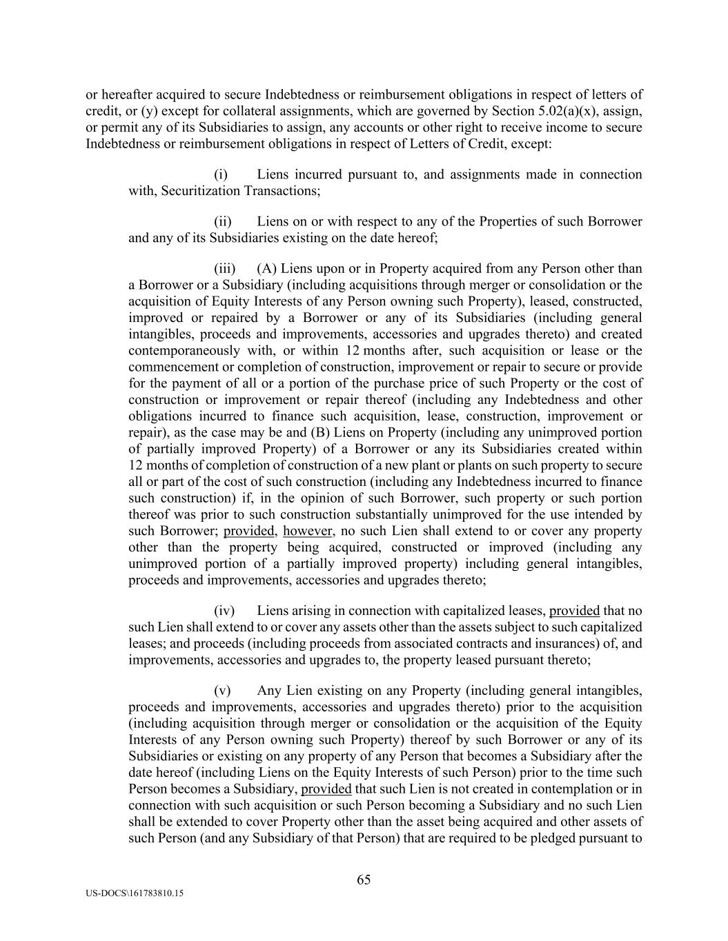 65 US-DOCS\161783810.15 or hereafter acquired to secure Indebtedness or reimbursement obligations in respect of letters of credit, or (y) except for collateral assignments, which are governed by Section 5.02(a)(x), assign, or permit any of its Subsidiaries to assign, any accounts or other right to receive income to secure Indebtedness or reimbursement obligations in respect of Letters of Credit, except: (i) Liens incurred pursuant to, and assignments made in connection with, Securitization Transactions; (ii) Liens on or with respect to any of the Properties of such Borrower and any of its Subsidiaries existing on the date hereof; (iii) (A) Liens upon or in Property acquired from any Person other than a Borrower or a Subsidiary (including acquisitions through merger or consolidation or the acquisition of Equity Interests of any Person owning such Property), leased, constructed, improved or repaired by a Borrower or any of its Subsidiaries (including general intangibles, proceeds and improvements, accessories and upgrades thereto) and created contemporaneously with, or within 12 months after, such acquisition or lease or the commencement or completion of construction, improvement or repair to secure or provide for the payment of all or a portion of the purchase price of such Property or the cost of construction or improvement or repair thereof (including any Indebtedness and other obligations incurred to finance such acquisition, lease, construction, improvement or repair), as the case may be and (B) Liens on Property (including any unimproved portion of partially improved Property) of a Borrower or any its Subsidiaries created within 12 months of completion of construction of a new plant or plants on such property to secure all or part of the cost of such construction (including any Indebtedness incurred to finance such construction) if, in the opinion of such Borrower, such property or such portion thereof was prior to such construction substantially unimproved for the use intended by such Borrower; provided, however, no such Lien shall extend to or cover any property other than the property being acquired, constructed or improved (including any unimproved portion of a partially improved property) including general intangibles, proceeds and improvements, accessories and upgrades thereto; (iv) Liens arising in connection with capitalized leases, provided that no such Lien shall extend to or cover any assets other than the assets subject to such capitalized leases; and proceeds (including proceeds from associated contracts and insurances) of, and improvements, accessories and upgrades to, the property leased pursuant thereto; (v) Any Lien existing on any Property (including general intangibles, proceeds and improvements, accessories and upgrades thereto) prior to the acquisition (including acquisition through merger or consolidation or the acquisition of the Equity Interests of any Person owning such Property) thereof by such Borrower or any of its Subsidiaries or existing on any property of any Person that becomes a Subsidiary after the date hereof (including Liens on the Equity Interests of such Person) prior to the time such Person becomes a Subsidiary, provided that such Lien is not created in contemplation or in connection with such acquisition or such Person becoming a Subsidiary and no such Lien shall be extended to cover Property other than the asset being acquired and other assets of such Person (and any Subsidiary of that Person) that are required to be pledged pursuant to