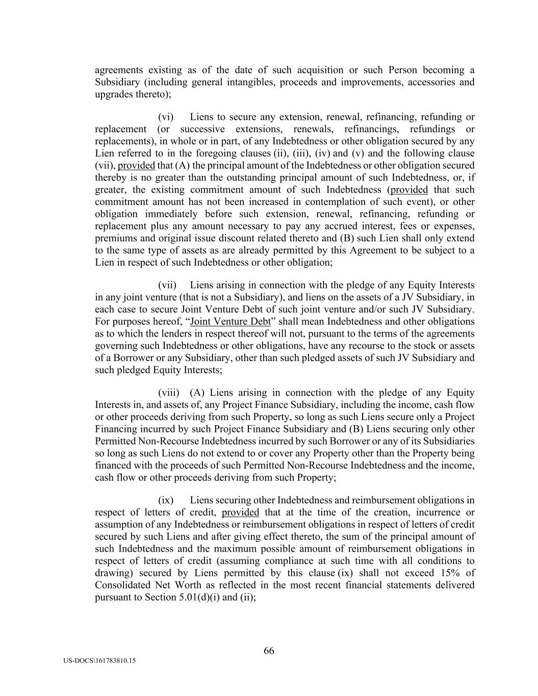 66 US-DOCS\161783810.15 agreements existing as of the date of such acquisition or such Person becoming a Subsidiary (including general intangibles, proceeds and improvements, accessories and upgrades thereto); (vi) Liens to secure any extension, renewal, refinancing, refunding or replacement (or successive extensions, renewals, refinancings, refundings or replacements), in whole or in part, of any Indebtedness or other obligation secured by any Lien referred to in the foregoing clauses (ii), (iii), (iv) and (v) and the following clause (vii), provided that (A) the principal amount of the Indebtedness or other obligation secured thereby is no greater than the outstanding principal amount of such Indebtedness, or, if greater, the existing commitment amount of such Indebtedness (provided that such commitment amount has not been increased in contemplation of such event), or other obligation immediately before such extension, renewal, refinancing, refunding or replacement plus any amount necessary to pay any accrued interest, fees or expenses, premiums and original issue discount related thereto and (B) such Lien shall only extend to the same type of assets as are already permitted by this Agreement to be subject to a Lien in respect of such Indebtedness or other obligation; (vii) Liens arising in connection with the pledge of any Equity Interests in any joint venture (that is not a Subsidiary), and liens on the assets of a JV Subsidiary, in each case to secure Joint Venture Debt of such joint venture and/or such JV Subsidiary. For purposes hereof, “Joint Venture Debt” shall mean Indebtedness and other obligations as to which the lenders in respect thereof will not, pursuant to the terms of the agreements governing such Indebtedness or other obligations, have any recourse to the stock or assets of a Borrower or any Subsidiary, other than such pledged assets of such JV Subsidiary and such pledged Equity Interests; (viii) (A) Liens arising in connection with the pledge of any Equity Interests in, and assets of, any Project Finance Subsidiary, including the income, cash flow or other proceeds deriving from such Property, so long as such Liens secure only a Project Financing incurred by such Project Finance Subsidiary and (B) Liens securing only other Permitted Non-Recourse Indebtedness incurred by such Borrower or any of its Subsidiaries so long as such Liens do not extend to or cover any Property other than the Property being financed with the proceeds of such Permitted Non-Recourse Indebtedness and the income, cash flow or other proceeds deriving from such Property; (ix) Liens securing other Indebtedness and reimbursement obligations in respect of letters of credit, provided that at the time of the creation, incurrence or assumption of any Indebtedness or reimbursement obligations in respect of letters of credit secured by such Liens and after giving effect thereto, the sum of the principal amount of such Indebtedness and the maximum possible amount of reimbursement obligations in respect of letters of credit (assuming compliance at such time with all conditions to drawing) secured by Liens permitted by this clause (ix) shall not exceed 15% of Consolidated Net Worth as reflected in the most recent financial statements delivered pursuant to Section 5.01(d)(i) and (ii);