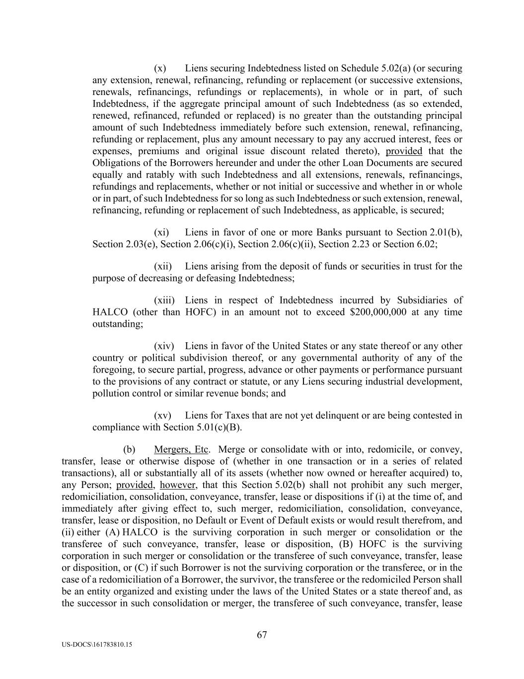 67 US-DOCS\161783810.15 (x) Liens securing Indebtedness listed on Schedule 5.02(a) (or securing any extension, renewal, refinancing, refunding or replacement (or successive extensions, renewals, refinancings, refundings or replacements), in whole or in part, of such Indebtedness, if the aggregate principal amount of such Indebtedness (as so extended, renewed, refinanced, refunded or replaced) is no greater than the outstanding principal amount of such Indebtedness immediately before such extension, renewal, refinancing, refunding or replacement, plus any amount necessary to pay any accrued interest, fees or expenses, premiums and original issue discount related thereto), provided that the Obligations of the Borrowers hereunder and under the other Loan Documents are secured equally and ratably with such Indebtedness and all extensions, renewals, refinancings, refundings and replacements, whether or not initial or successive and whether in or whole or in part, of such Indebtedness for so long as such Indebtedness or such extension, renewal, refinancing, refunding or replacement of such Indebtedness, as applicable, is secured; (xi) Liens in favor of one or more Banks pursuant to Section 2.01(b), Section 2.03(e), Section 2.06(c)(i), Section 2.06(c)(ii), Section 2.23 or Section 6.02; (xii) Liens arising from the deposit of funds or securities in trust for the purpose of decreasing or defeasing Indebtedness; (xiii) Liens in respect of Indebtedness incurred by Subsidiaries of HALCO (other than HOFC) in an amount not to exceed $200,000,000 at any time outstanding; (xiv) Liens in favor of the United States or any state thereof or any other country or political subdivision thereof, or any governmental authority of any of the foregoing, to secure partial, progress, advance or other payments or performance pursuant to the provisions of any contract or statute, or any Liens securing industrial development, pollution control or similar revenue bonds; and (xv) Liens for Taxes that are not yet delinquent or are being contested in compliance with Section 5.01(c)(B). (b) Mergers, Etc. Merge or consolidate with or into, redomicile, or convey, transfer, lease or otherwise dispose of (whether in one transaction or in a series of related transactions), all or substantially all of its assets (whether now owned or hereafter acquired) to, any Person; provided, however, that this Section 5.02(b) shall not prohibit any such merger, redomiciliation, consolidation, conveyance, transfer, lease or dispositions if (i) at the time of, and immediately after giving effect to, such merger, redomiciliation, consolidation, conveyance, transfer, lease or disposition, no Default or Event of Default exists or would result therefrom, and (ii) either (A) HALCO is the surviving corporation in such merger or consolidation or the transferee of such conveyance, transfer, lease or disposition, (B) HOFC is the surviving corporation in such merger or consolidation or the transferee of such conveyance, transfer, lease or disposition, or (C) if such Borrower is not the surviving corporation or the transferee, or in the case of a redomiciliation of a Borrower, the survivor, the transferee or the redomiciled Person shall be an entity organized and existing under the laws of the United States or a state thereof and, as the successor in such consolidation or merger, the transferee of such conveyance, transfer, lease