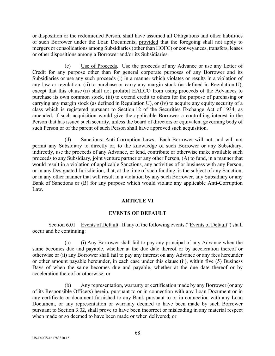 68 US-DOCS\161783810.15 or disposition or the redomiciled Person, shall have assumed all Obligations and other liabilities of such Borrower under the Loan Documents; provided that the foregoing shall not apply to mergers or consolidations among Subsidiaries (other than HOFC) or conveyances, transfers, leases or other dispositions among a Borrower and/or its Subsidiaries. (c) Use of Proceeds. Use the proceeds of any Advance or use any Letter of Credit for any purpose other than for general corporate purposes of any Borrower and its Subsidiaries or use any such proceeds (i) in a manner which violates or results in a violation of any law or regulation, (ii) to purchase or carry any margin stock (as defined in Regulation U), except that this clause (ii) shall not prohibit HALCO from using proceeds of the Advances to purchase its own common stock, (iii) to extend credit to others for the purpose of purchasing or carrying any margin stock (as defined in Regulation U), or (iv) to acquire any equity security of a class which is registered pursuant to Section 12 of the Securities Exchange Act of 1934, as amended, if such acquisition would give the applicable Borrower a controlling interest in the Person that has issued such security, unless the board of directors or equivalent governing body of such Person or of the parent of such Person shall have approved such acquisition. (d) Sanctions; Anti-Corruption Laws. Each Borrower will not, and will not permit any Subsidiary to directly or, to the knowledge of such Borrower or any Subsidiary, indirectly, use the proceeds of any Advance, or lend, contribute or otherwise make available such proceeds to any Subsidiary, joint venture partner or any other Person, (A) to fund, in a manner that would result in a violation of applicable Sanctions, any activities of or business with any Person, or in any Designated Jurisdiction, that, at the time of such funding, is the subject of any Sanction, or in any other manner that will result in a violation by any such Borrower, any Subsidiary or any Bank of Sanctions or (B) for any purpose which would violate any applicable Anti-Corruption Law. ARTICLE VI EVENTS OF DEFAULT Section 6.01 Events of Default. If any of the following events (“Events of Default”) shall occur and be continuing: (a) (i) Any Borrower shall fail to pay any principal of any Advance when the same becomes due and payable, whether at the due date thereof or by acceleration thereof or otherwise or (ii) any Borrower shall fail to pay any interest on any Advance or any fees hereunder or other amount payable hereunder, in each case under this clause (ii), within five (5) Business Days of when the same becomes due and payable, whether at the due date thereof or by acceleration thereof or otherwise; or (b) Any representation, warranty or certification made by any Borrower (or any of its Responsible Officers) herein, pursuant to or in connection with any Loan Document or in any certificate or document furnished to any Bank pursuant to or in connection with any Loan Document, or any representation or warranty deemed to have been made by such Borrower pursuant to Section 3.02, shall prove to have been incorrect or misleading in any material respect when made or so deemed to have been made or when delivered; or