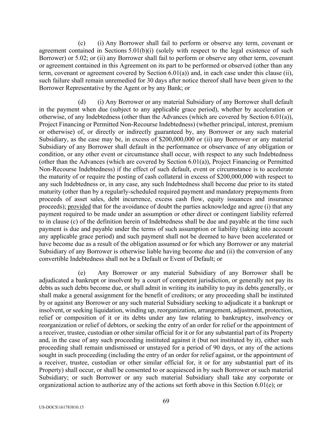 69 US-DOCS\161783810.15 (c) (i) Any Borrower shall fail to perform or observe any term, covenant or agreement contained in Sections 5.01(b)(i) (solely with respect to the legal existence of such Borrower) or 5.02; or (ii) any Borrower shall fail to perform or observe any other term, covenant or agreement contained in this Agreement on its part to be performed or observed (other than any term, covenant or agreement covered by Section 6.01(a)) and, in each case under this clause (ii), such failure shall remain unremedied for 30 days after notice thereof shall have been given to the Borrower Representative by the Agent or by any Bank; or (d) (i) Any Borrower or any material Subsidiary of any Borrower shall default in the payment when due (subject to any applicable grace period), whether by acceleration or otherwise, of any Indebtedness (other than the Advances (which are covered by Section 6.01(a)), Project Financing or Permitted Non-Recourse Indebtedness) (whether principal, interest, premium or otherwise) of, or directly or indirectly guaranteed by, any Borrower or any such material Subsidiary, as the case may be, in excess of $200,000,000 or (ii) any Borrower or any material Subsidiary of any Borrower shall default in the performance or observance of any obligation or condition, or any other event or circumstance shall occur, with respect to any such Indebtedness (other than the Advances (which are covered by Section 6.01(a)), Project Financing or Permitted Non-Recourse Indebtedness) if the effect of such default, event or circumstance is to accelerate the maturity of or require the posting of cash collateral in excess of $200,000,000 with respect to any such Indebtedness or, in any case, any such Indebtedness shall become due prior to its stated maturity (other than by a regularly-scheduled required payment and mandatory prepayments from proceeds of asset sales, debt incurrence, excess cash flow, equity issuances and insurance proceeds); provided that for the avoidance of doubt the parties acknowledge and agree (i) that any payment required to be made under an assumption or other direct or contingent liability referred to in clause (c) of the definition herein of Indebtedness shall be due and payable at the time such payment is due and payable under the terms of such assumption or liability (taking into account any applicable grace period) and such payment shall not be deemed to have been accelerated or have become due as a result of the obligation assumed or for which any Borrower or any material Subsidiary of any Borrower is otherwise liable having become due and (ii) the conversion of any convertible Indebtedness shall not be a Default or Event of Default; or (e) Any Borrower or any material Subsidiary of any Borrower shall be adjudicated a bankrupt or insolvent by a court of competent jurisdiction, or generally not pay its debts as such debts become due, or shall admit in writing its inability to pay its debts generally, or shall make a general assignment for the benefit of creditors; or any proceeding shall be instituted by or against any Borrower or any such material Subsidiary seeking to adjudicate it a bankrupt or insolvent, or seeking liquidation, winding up, reorganization, arrangement, adjustment, protection, relief or composition of it or its debts under any law relating to bankruptcy, insolvency or reorganization or relief of debtors, or seeking the entry of an order for relief or the appointment of a receiver, trustee, custodian or other similar official for it or for any substantial part of its Property and, in the case of any such proceeding instituted against it (but not instituted by it), either such proceeding shall remain undismissed or unstayed for a period of 90 days, or any of the actions sought in such proceeding (including the entry of an order for relief against, or the appointment of a receiver, trustee, custodian or other similar official for, it or for any substantial part of its Property) shall occur, or shall be consented to or acquiesced in by such Borrower or such material Subsidiary; or such Borrower or any such material Subsidiary shall take any corporate or organizational action to authorize any of the actions set forth above in this Section 6.01(e); or