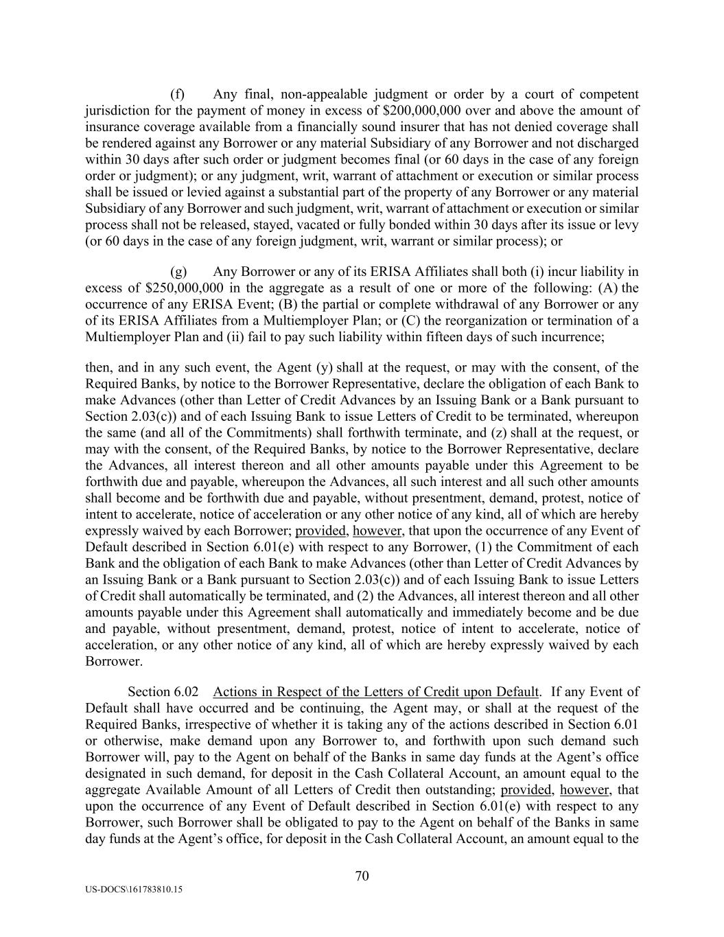 70 US-DOCS\161783810.15 (f) Any final, non-appealable judgment or order by a court of competent jurisdiction for the payment of money in excess of $200,000,000 over and above the amount of insurance coverage available from a financially sound insurer that has not denied coverage shall be rendered against any Borrower or any material Subsidiary of any Borrower and not discharged within 30 days after such order or judgment becomes final (or 60 days in the case of any foreign order or judgment); or any judgment, writ, warrant of attachment or execution or similar process shall be issued or levied against a substantial part of the property of any Borrower or any material Subsidiary of any Borrower and such judgment, writ, warrant of attachment or execution or similar process shall not be released, stayed, vacated or fully bonded within 30 days after its issue or levy (or 60 days in the case of any foreign judgment, writ, warrant or similar process); or (g) Any Borrower or any of its ERISA Affiliates shall both (i) incur liability in excess of $250,000,000 in the aggregate as a result of one or more of the following: (A) the occurrence of any ERISA Event; (B) the partial or complete withdrawal of any Borrower or any of its ERISA Affiliates from a Multiemployer Plan; or (C) the reorganization or termination of a Multiemployer Plan and (ii) fail to pay such liability within fifteen days of such incurrence; then, and in any such event, the Agent (y) shall at the request, or may with the consent, of the Required Banks, by notice to the Borrower Representative, declare the obligation of each Bank to make Advances (other than Letter of Credit Advances by an Issuing Bank or a Bank pursuant to Section 2.03(c)) and of each Issuing Bank to issue Letters of Credit to be terminated, whereupon the same (and all of the Commitments) shall forthwith terminate, and (z) shall at the request, or may with the consent, of the Required Banks, by notice to the Borrower Representative, declare the Advances, all interest thereon and all other amounts payable under this Agreement to be forthwith due and payable, whereupon the Advances, all such interest and all such other amounts shall become and be forthwith due and payable, without presentment, demand, protest, notice of intent to accelerate, notice of acceleration or any other notice of any kind, all of which are hereby expressly waived by each Borrower; provided, however, that upon the occurrence of any Event of Default described in Section 6.01(e) with respect to any Borrower, (1) the Commitment of each Bank and the obligation of each Bank to make Advances (other than Letter of Credit Advances by an Issuing Bank or a Bank pursuant to Section 2.03(c)) and of each Issuing Bank to issue Letters of Credit shall automatically be terminated, and (2) the Advances, all interest thereon and all other amounts payable under this Agreement shall automatically and immediately become and be due and payable, without presentment, demand, protest, notice of intent to accelerate, notice of acceleration, or any other notice of any kind, all of which are hereby expressly waived by each Borrower. Section 6.02 Actions in Respect of the Letters of Credit upon Default. If any Event of Default shall have occurred and be continuing, the Agent may, or shall at the request of the Required Banks, irrespective of whether it is taking any of the actions described in Section 6.01 or otherwise, make demand upon any Borrower to, and forthwith upon such demand such Borrower will, pay to the Agent on behalf of the Banks in same day funds at the Agent’s office designated in such demand, for deposit in the Cash Collateral Account, an amount equal to the aggregate Available Amount of all Letters of Credit then outstanding; provided, however, that upon the occurrence of any Event of Default described in Section 6.01(e) with respect to any Borrower, such Borrower shall be obligated to pay to the Agent on behalf of the Banks in same day funds at the Agent’s office, for deposit in the Cash Collateral Account, an amount equal to the