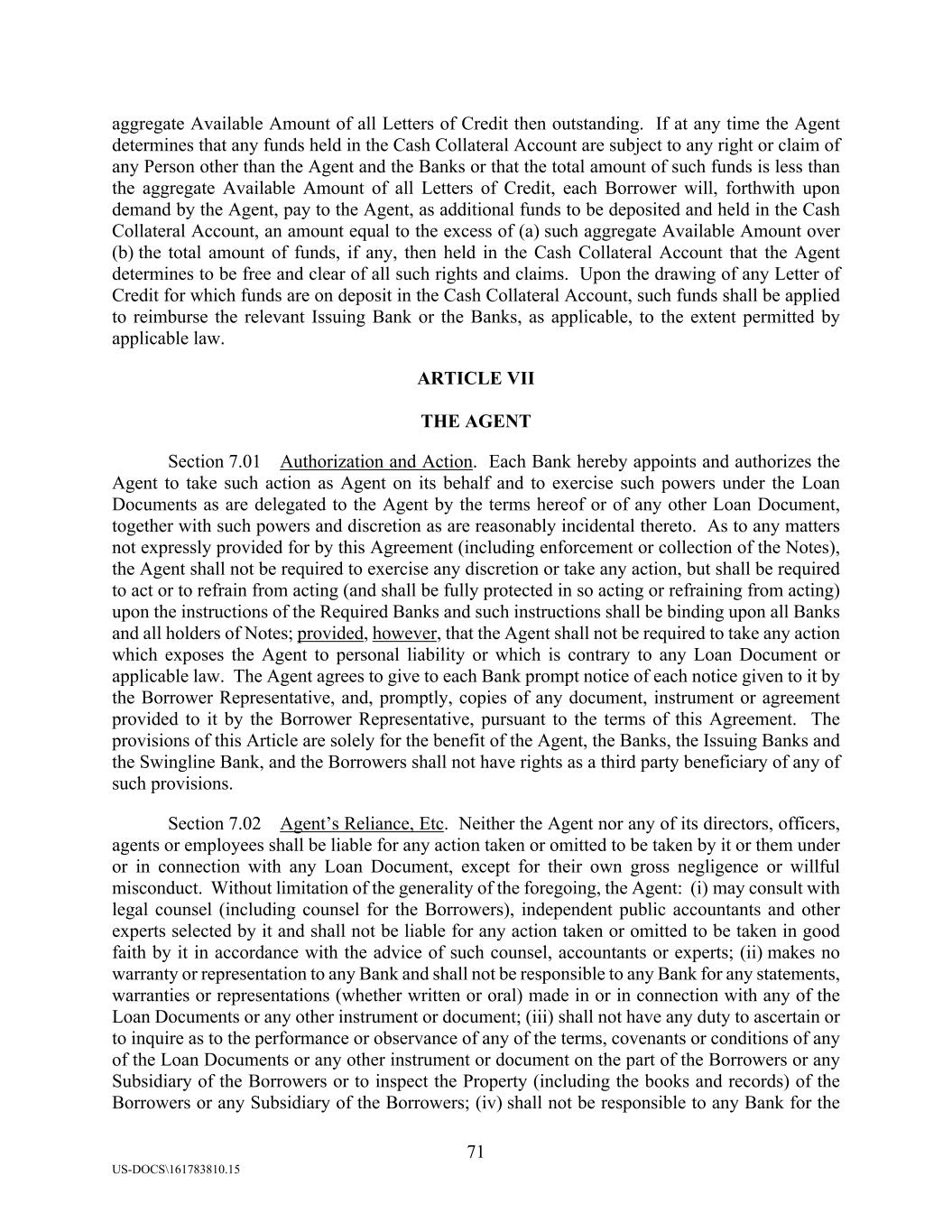 71 US-DOCS\161783810.15 aggregate Available Amount of all Letters of Credit then outstanding. If at any time the Agent determines that any funds held in the Cash Collateral Account are subject to any right or claim of any Person other than the Agent and the Banks or that the total amount of such funds is less than the aggregate Available Amount of all Letters of Credit, each Borrower will, forthwith upon demand by the Agent, pay to the Agent, as additional funds to be deposited and held in the Cash Collateral Account, an amount equal to the excess of (a) such aggregate Available Amount over (b) the total amount of funds, if any, then held in the Cash Collateral Account that the Agent determines to be free and clear of all such rights and claims. Upon the drawing of any Letter of Credit for which funds are on deposit in the Cash Collateral Account, such funds shall be applied to reimburse the relevant Issuing Bank or the Banks, as applicable, to the extent permitted by applicable law. ARTICLE VII THE AGENT Section 7.01 Authorization and Action. Each Bank hereby appoints and authorizes the Agent to take such action as Agent on its behalf and to exercise such powers under the Loan Documents as are delegated to the Agent by the terms hereof or of any other Loan Document, together with such powers and discretion as are reasonably incidental thereto. As to any matters not expressly provided for by this Agreement (including enforcement or collection of the Notes), the Agent shall not be required to exercise any discretion or take any action, but shall be required to act or to refrain from acting (and shall be fully protected in so acting or refraining from acting) upon the instructions of the Required Banks and such instructions shall be binding upon all Banks and all holders of Notes; provided, however, that the Agent shall not be required to take any action which exposes the Agent to personal liability or which is contrary to any Loan Document or applicable law. The Agent agrees to give to each Bank prompt notice of each notice given to it by the Borrower Representative, and, promptly, copies of any document, instrument or agreement provided to it by the Borrower Representative, pursuant to the terms of this Agreement. The provisions of this Article are solely for the benefit of the Agent, the Banks, the Issuing Banks and the Swingline Bank, and the Borrowers shall not have rights as a third party beneficiary of any of such provisions. Section 7.02 Agent’s Reliance, Etc. Neither the Agent nor any of its directors, officers, agents or employees shall be liable for any action taken or omitted to be taken by it or them under or in connection with any Loan Document, except for their own gross negligence or willful misconduct. Without limitation of the generality of the foregoing, the Agent: (i) may consult with legal counsel (including counsel for the Borrowers), independent public accountants and other experts selected by it and shall not be liable for any action taken or omitted to be taken in good faith by it in accordance with the advice of such counsel, accountants or experts; (ii) makes no warranty or representation to any Bank and shall not be responsible to any Bank for any statements, warranties or representations (whether written or oral) made in or in connection with any of the Loan Documents or any other instrument or document; (iii) shall not have any duty to ascertain or to inquire as to the performance or observance of any of the terms, covenants or conditions of any of the Loan Documents or any other instrument or document on the part of the Borrowers or any Subsidiary of the Borrowers or to inspect the Property (including the books and records) of the Borrowers or any Subsidiary of the Borrowers; (iv) shall not be responsible to any Bank for the