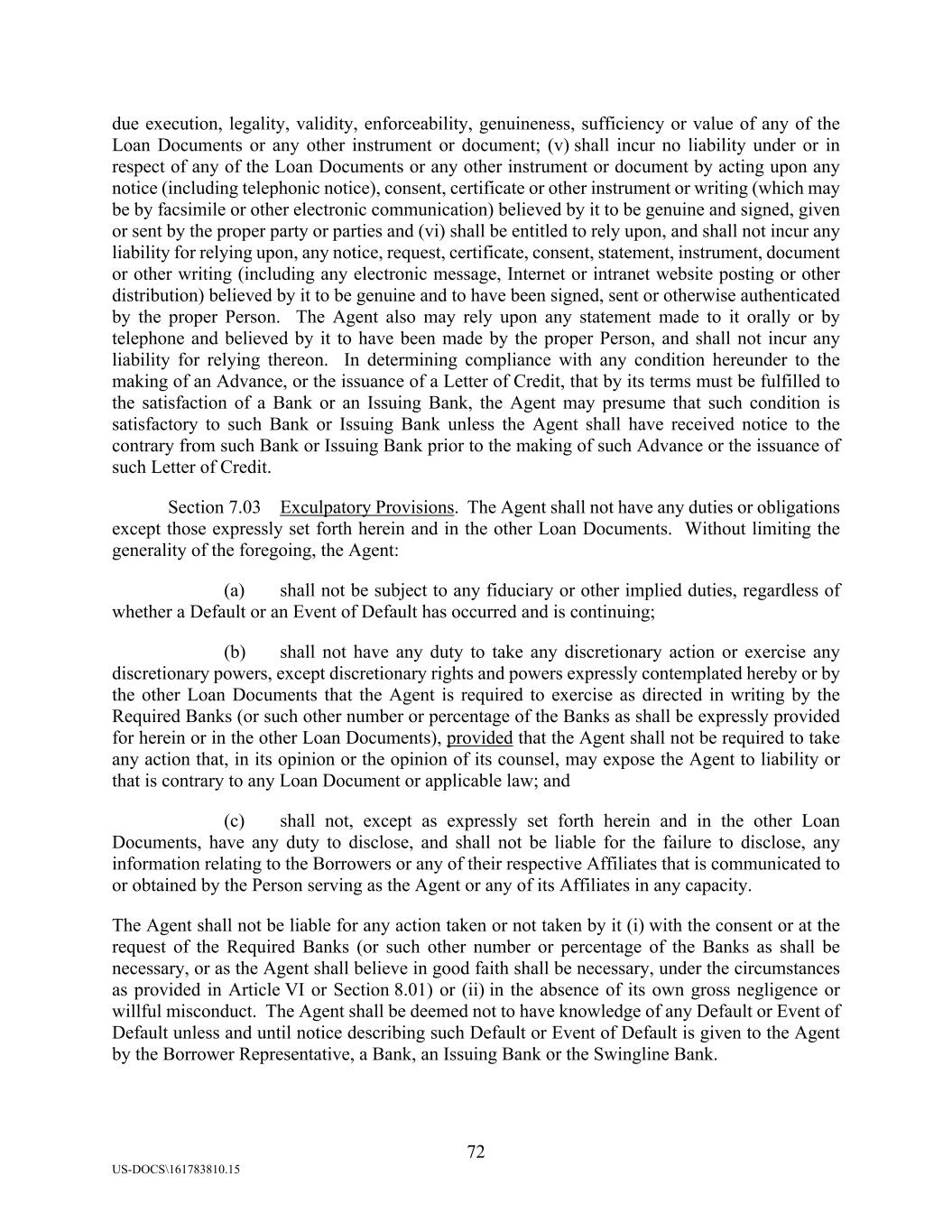 72 US-DOCS\161783810.15 due execution, legality, validity, enforceability, genuineness, sufficiency or value of any of the Loan Documents or any other instrument or document; (v) shall incur no liability under or in respect of any of the Loan Documents or any other instrument or document by acting upon any notice (including telephonic notice), consent, certificate or other instrument or writing (which may be by facsimile or other electronic communication) believed by it to be genuine and signed, given or sent by the proper party or parties and (vi) shall be entitled to rely upon, and shall not incur any liability for relying upon, any notice, request, certificate, consent, statement, instrument, document or other writing (including any electronic message, Internet or intranet website posting or other distribution) believed by it to be genuine and to have been signed, sent or otherwise authenticated by the proper Person. The Agent also may rely upon any statement made to it orally or by telephone and believed by it to have been made by the proper Person, and shall not incur any liability for relying thereon. In determining compliance with any condition hereunder to the making of an Advance, or the issuance of a Letter of Credit, that by its terms must be fulfilled to the satisfaction of a Bank or an Issuing Bank, the Agent may presume that such condition is satisfactory to such Bank or Issuing Bank unless the Agent shall have received notice to the contrary from such Bank or Issuing Bank prior to the making of such Advance or the issuance of such Letter of Credit. Section 7.03 Exculpatory Provisions. The Agent shall not have any duties or obligations except those expressly set forth herein and in the other Loan Documents. Without limiting the generality of the foregoing, the Agent: (a) shall not be subject to any fiduciary or other implied duties, regardless of whether a Default or an Event of Default has occurred and is continuing; (b) shall not have any duty to take any discretionary action or exercise any discretionary powers, except discretionary rights and powers expressly contemplated hereby or by the other Loan Documents that the Agent is required to exercise as directed in writing by the Required Banks (or such other number or percentage of the Banks as shall be expressly provided for herein or in the other Loan Documents), provided that the Agent shall not be required to take any action that, in its opinion or the opinion of its counsel, may expose the Agent to liability or that is contrary to any Loan Document or applicable law; and (c) shall not, except as expressly set forth herein and in the other Loan Documents, have any duty to disclose, and shall not be liable for the failure to disclose, any information relating to the Borrowers or any of their respective Affiliates that is communicated to or obtained by the Person serving as the Agent or any of its Affiliates in any capacity. The Agent shall not be liable for any action taken or not taken by it (i) with the consent or at the request of the Required Banks (or such other number or percentage of the Banks as shall be necessary, or as the Agent shall believe in good faith shall be necessary, under the circumstances as provided in Article VI or Section 8.01) or (ii) in the absence of its own gross negligence or willful misconduct. The Agent shall be deemed not to have knowledge of any Default or Event of Default unless and until notice describing such Default or Event of Default is given to the Agent by the Borrower Representative, a Bank, an Issuing Bank or the Swingline Bank.