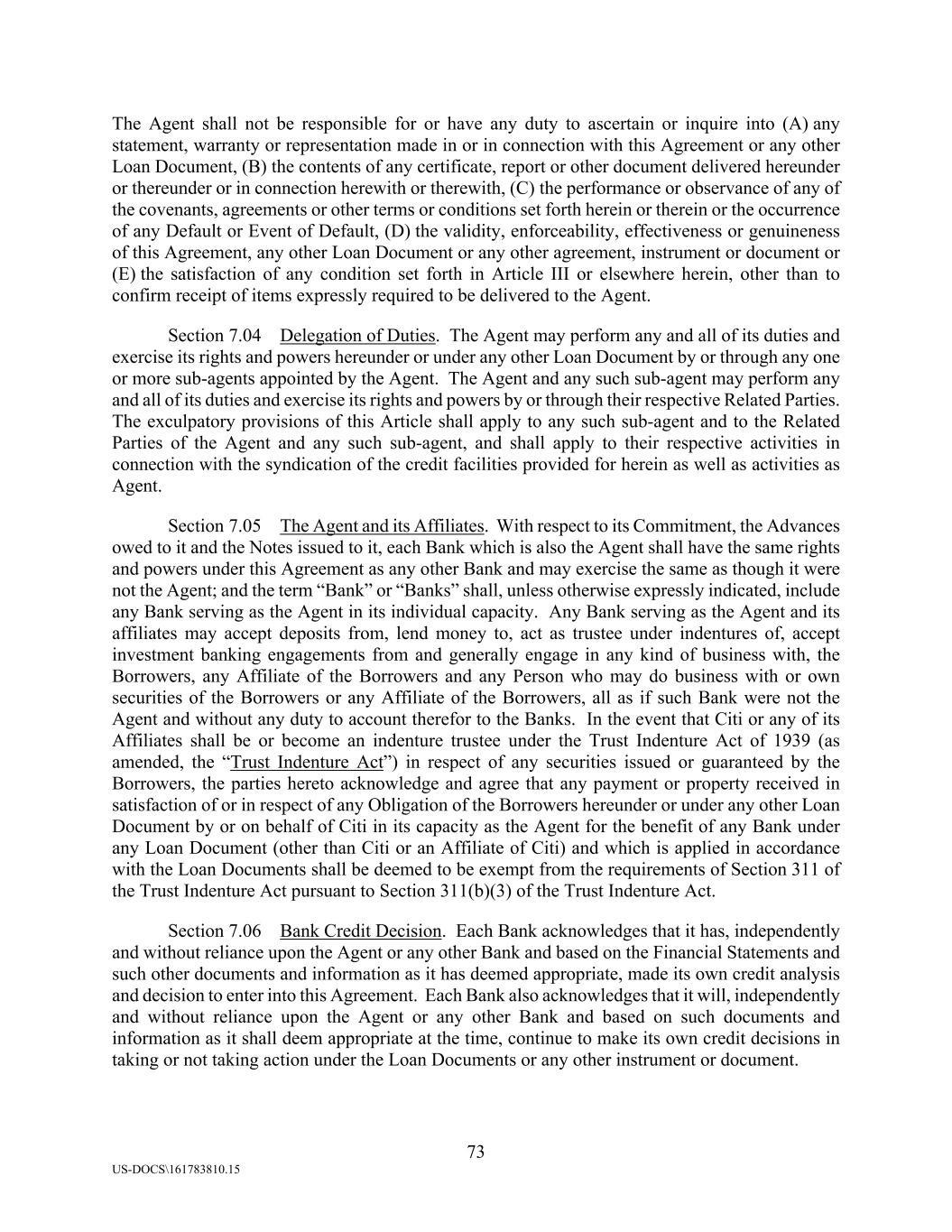73 US-DOCS\161783810.15 The Agent shall not be responsible for or have any duty to ascertain or inquire into (A) any statement, warranty or representation made in or in connection with this Agreement or any other Loan Document, (B) the contents of any certificate, report or other document delivered hereunder or thereunder or in connection herewith or therewith, (C) the performance or observance of any of the covenants, agreements or other terms or conditions set forth herein or therein or the occurrence of any Default or Event of Default, (D) the validity, enforceability, effectiveness or genuineness of this Agreement, any other Loan Document or any other agreement, instrument or document or (E) the satisfaction of any condition set forth in Article III or elsewhere herein, other than to confirm receipt of items expressly required to be delivered to the Agent. Section 7.04 Delegation of Duties. The Agent may perform any and all of its duties and exercise its rights and powers hereunder or under any other Loan Document by or through any one or more sub-agents appointed by the Agent. The Agent and any such sub-agent may perform any and all of its duties and exercise its rights and powers by or through their respective Related Parties. The exculpatory provisions of this Article shall apply to any such sub-agent and to the Related Parties of the Agent and any such sub-agent, and shall apply to their respective activities in connection with the syndication of the credit facilities provided for herein as well as activities as Agent. Section 7.05 The Agent and its Affiliates. With respect to its Commitment, the Advances owed to it and the Notes issued to it, each Bank which is also the Agent shall have the same rights and powers under this Agreement as any other Bank and may exercise the same as though it were not the Agent; and the term “Bank” or “Banks” shall, unless otherwise expressly indicated, include any Bank serving as the Agent in its individual capacity. Any Bank serving as the Agent and its affiliates may accept deposits from, lend money to, act as trustee under indentures of, accept investment banking engagements from and generally engage in any kind of business with, the Borrowers, any Affiliate of the Borrowers and any Person who may do business with or own securities of the Borrowers or any Affiliate of the Borrowers, all as if such Bank were not the Agent and without any duty to account therefor to the Banks. In the event that Citi or any of its Affiliates shall be or become an indenture trustee under the Trust Indenture Act of 1939 (as amended, the “Trust Indenture Act”) in respect of any securities issued or guaranteed by the Borrowers, the parties hereto acknowledge and agree that any payment or property received in satisfaction of or in respect of any Obligation of the Borrowers hereunder or under any other Loan Document by or on behalf of Citi in its capacity as the Agent for the benefit of any Bank under any Loan Document (other than Citi or an Affiliate of Citi) and which is applied in accordance with the Loan Documents shall be deemed to be exempt from the requirements of Section 311 of the Trust Indenture Act pursuant to Section 311(b)(3) of the Trust Indenture Act. Section 7.06 Bank Credit Decision. Each Bank acknowledges that it has, independently and without reliance upon the Agent or any other Bank and based on the Financial Statements and such other documents and information as it has deemed appropriate, made its own credit analysis and decision to enter into this Agreement. Each Bank also acknowledges that it will, independently and without reliance upon the Agent or any other Bank and based on such documents and information as it shall deem appropriate at the time, continue to make its own credit decisions in taking or not taking action under the Loan Documents or any other instrument or document.