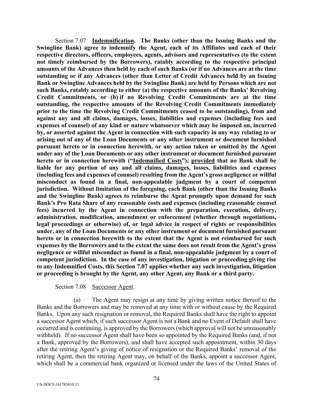 74 US-DOCS\161783810.15 Section 7.07 Indemnification. The Banks (other than the Issuing Banks and the Swingline Bank) agree to indemnify the Agent, each of its Affiliates and each of their respective directors, officers, employees, agents, advisors and representatives (to the extent not timely reimbursed by the Borrowers), ratably according to the respective principal amounts of the Advances then held by each of such Banks (or if no Advances are at the time outstanding or if any Advances (other than Letter of Credit Advances held by an Issuing Bank or Swingline Advances held by the Swingline Bank) are held by Persons which are not such Banks, ratably according to either (a) the respective amounts of the Banks’ Revolving Credit Commitments, or (b) if no Revolving Credit Commitments are at the time outstanding, the respective amounts of the Revolving Credit Commitments immediately prior to the time the Revolving Credit Commitments ceased to be outstanding), from and against any and all claims, damages, losses, liabilities and expenses (including fees and expenses of counsel) of any kind or nature whatsoever which may be imposed on, incurred by, or asserted against the Agent in connection with such capacity in any way relating to or arising out of any of the Loan Documents or any other instrument or document furnished pursuant hereto or in connection herewith, or any action taken or omitted by the Agent under any of the Loan Documents or any other instrument or document furnished pursuant hereto or in connection herewith (“Indemnified Costs”); provided that no Bank shall be liable for any portion of any and all claims, damages, losses, liabilities and expenses (including fees and expenses of counsel) resulting from the Agent’s gross negligence or willful misconduct as found in a final, non-appealable judgment by a court of competent jurisdiction. Without limitation of the foregoing, each Bank (other than the Issuing Banks and the Swingline Bank) agrees to reimburse the Agent promptly upon demand for such Bank’s Pro Rata Share of any reasonable costs and expenses (including reasonable counsel fees) incurred by the Agent in connection with the preparation, execution, delivery, administration, modification, amendment or enforcement (whether through negotiations, legal proceedings or otherwise) of, or legal advice in respect of rights or responsibilities under, any of the Loan Documents or any other instrument or document furnished pursuant hereto or in connection herewith to the extent that the Agent is not reimbursed for such expenses by the Borrowers and to the extent the same does not result from the Agent’s gross negligence or willful misconduct as found in a final, non-appealable judgment by a court of competent jurisdiction. In the case of any investigation, litigation or proceeding giving rise to any Indemnified Costs, this Section 7.07 applies whether any such investigation, litigation or proceeding is brought by the Agent, any other Agent, any Bank or a third party. Section 7.08 Successor Agent. (a) The Agent may resign at any time by giving written notice thereof to the Banks and the Borrowers and may be removed at any time with or without cause by the Required Banks. Upon any such resignation or removal, the Required Banks shall have the right to appoint a successor Agent which, if such successor Agent is not a Bank and no Event of Default shall have occurred and is continuing, is approved by the Borrowers (which approval will not be unreasonably withheld). If no successor Agent shall have been so appointed by the Required Banks (and, if not a Bank, approved by the Borrowers), and shall have accepted such appointment, within 30 days after the retiring Agent’s giving of notice of resignation or the Required Banks’ removal of the retiring Agent, then the retiring Agent may, on behalf of the Banks, appoint a successor Agent, which shall be a commercial bank organized or licensed under the laws of the United States of