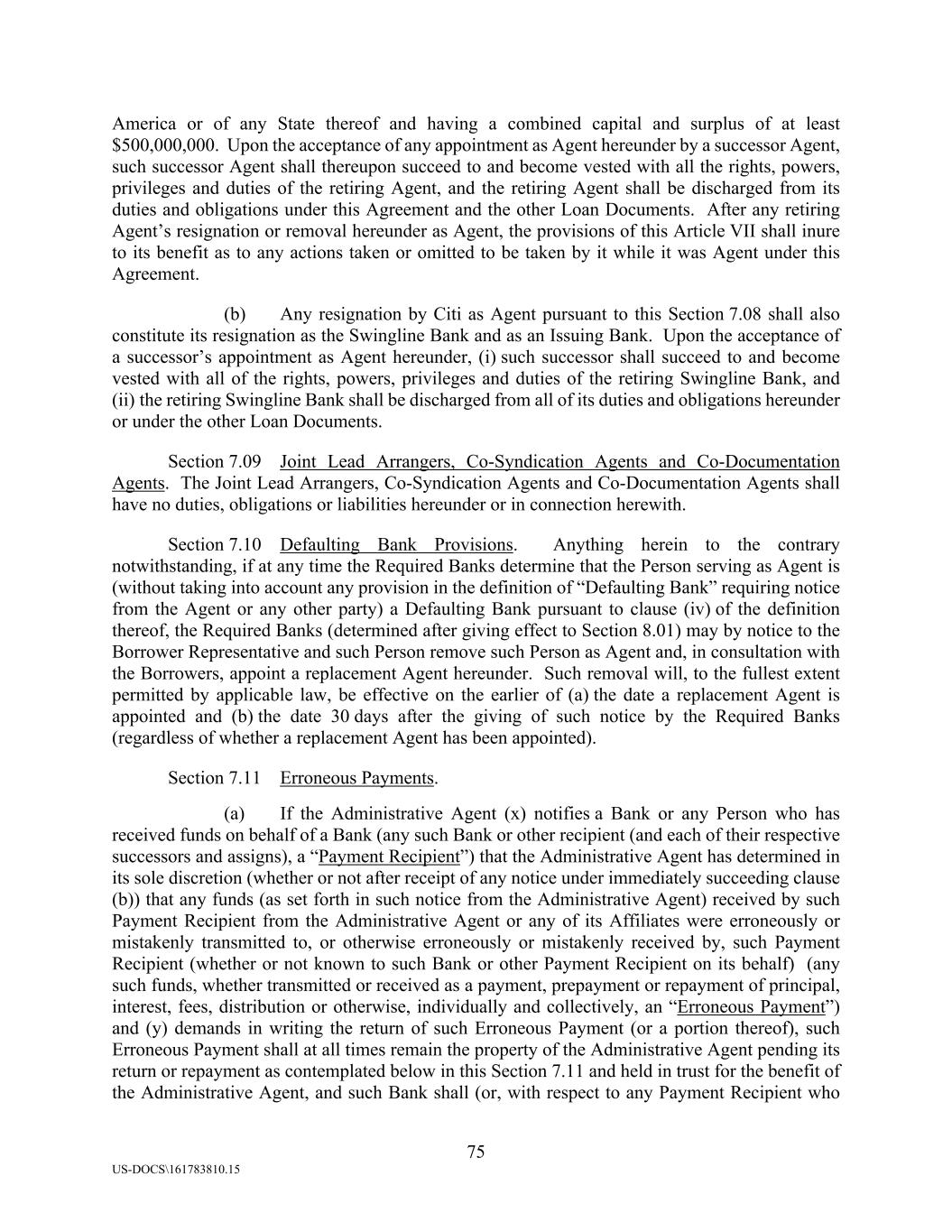 75 US-DOCS\161783810.15 America or of any State thereof and having a combined capital and surplus of at least $500,000,000. Upon the acceptance of any appointment as Agent hereunder by a successor Agent, such successor Agent shall thereupon succeed to and become vested with all the rights, powers, privileges and duties of the retiring Agent, and the retiring Agent shall be discharged from its duties and obligations under this Agreement and the other Loan Documents. After any retiring Agent’s resignation or removal hereunder as Agent, the provisions of this Article VII shall inure to its benefit as to any actions taken or omitted to be taken by it while it was Agent under this Agreement. (b) Any resignation by Citi as Agent pursuant to this Section 7.08 shall also constitute its resignation as the Swingline Bank and as an Issuing Bank. Upon the acceptance of a successor’s appointment as Agent hereunder, (i) such successor shall succeed to and become vested with all of the rights, powers, privileges and duties of the retiring Swingline Bank, and (ii) the retiring Swingline Bank shall be discharged from all of its duties and obligations hereunder or under the other Loan Documents. Section 7.09 Joint Lead Arrangers, Co-Syndication Agents and Co-Documentation Agents. The Joint Lead Arrangers, Co-Syndication Agents and Co-Documentation Agents shall have no duties, obligations or liabilities hereunder or in connection herewith. Section 7.10 Defaulting Bank Provisions. Anything herein to the contrary notwithstanding, if at any time the Required Banks determine that the Person serving as Agent is (without taking into account any provision in the definition of “Defaulting Bank” requiring notice from the Agent or any other party) a Defaulting Bank pursuant to clause (iv) of the definition thereof, the Required Banks (determined after giving effect to Section 8.01) may by notice to the Borrower Representative and such Person remove such Person as Agent and, in consultation with the Borrowers, appoint a replacement Agent hereunder. Such removal will, to the fullest extent permitted by applicable law, be effective on the earlier of (a) the date a replacement Agent is appointed and (b) the date 30 days after the giving of such notice by the Required Banks (regardless of whether a replacement Agent has been appointed). Section 7.11 Erroneous Payments. (a) If the Administrative Agent (x) notifies a Bank or any Person who has received funds on behalf of a Bank (any such Bank or other recipient (and each of their respective successors and assigns), a “Payment Recipient”) that the Administrative Agent has determined in its sole discretion (whether or not after receipt of any notice under immediately succeeding clause (b)) that any funds (as set forth in such notice from the Administrative Agent) received by such Payment Recipient from the Administrative Agent or any of its Affiliates were erroneously or mistakenly transmitted to, or otherwise erroneously or mistakenly received by, such Payment Recipient (whether or not known to such Bank or other Payment Recipient on its behalf) (any such funds, whether transmitted or received as a payment, prepayment or repayment of principal, interest, fees, distribution or otherwise, individually and collectively, an “Erroneous Payment”) and (y) demands in writing the return of such Erroneous Payment (or a portion thereof), such Erroneous Payment shall at all times remain the property of the Administrative Agent pending its return or repayment as contemplated below in this Section 7.11 and held in trust for the benefit of the Administrative Agent, and such Bank shall (or, with respect to any Payment Recipient who
