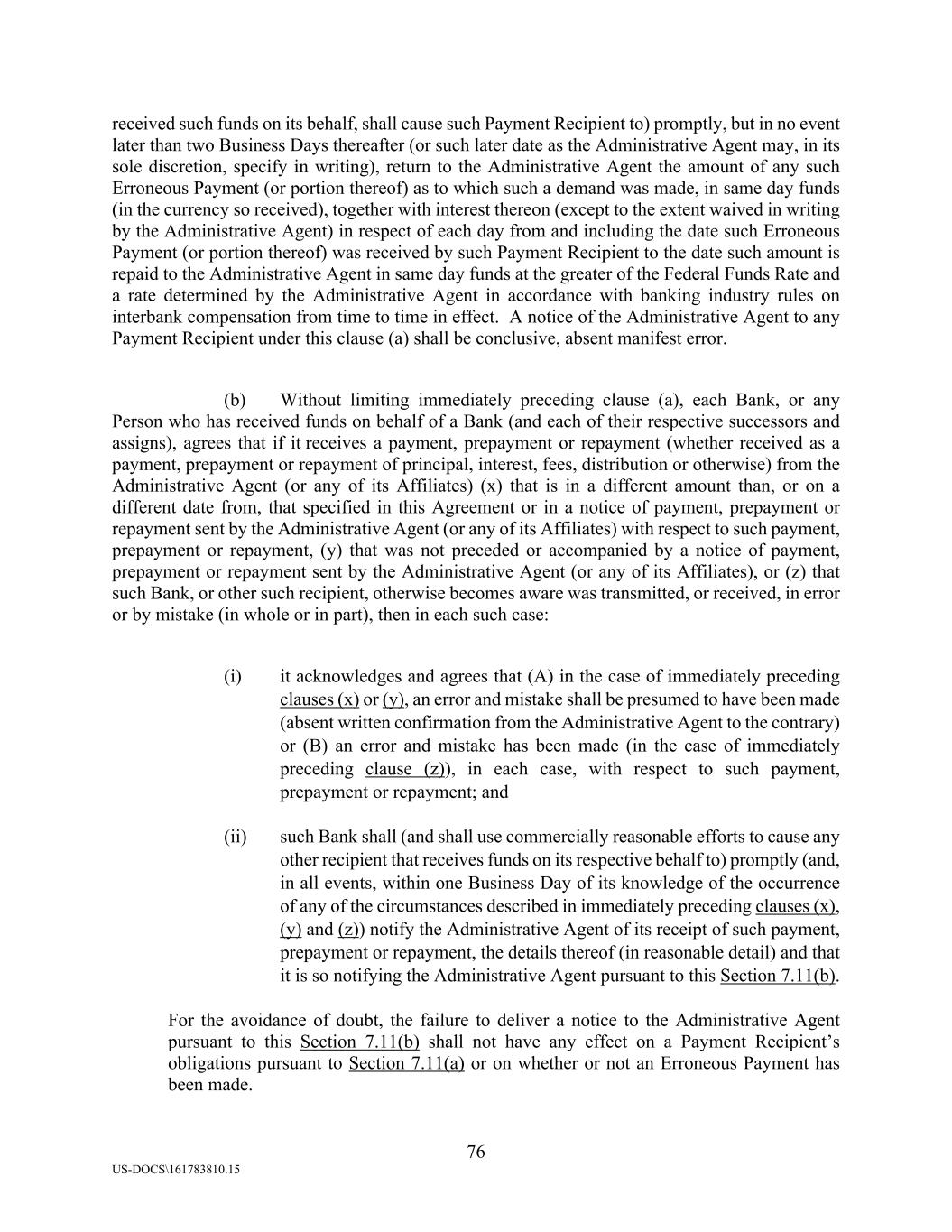 76 US-DOCS\161783810.15 received such funds on its behalf, shall cause such Payment Recipient to) promptly, but in no event later than two Business Days thereafter (or such later date as the Administrative Agent may, in its sole discretion, specify in writing), return to the Administrative Agent the amount of any such Erroneous Payment (or portion thereof) as to which such a demand was made, in same day funds (in the currency so received), together with interest thereon (except to the extent waived in writing by the Administrative Agent) in respect of each day from and including the date such Erroneous Payment (or portion thereof) was received by such Payment Recipient to the date such amount is repaid to the Administrative Agent in same day funds at the greater of the Federal Funds Rate and a rate determined by the Administrative Agent in accordance with banking industry rules on interbank compensation from time to time in effect. A notice of the Administrative Agent to any Payment Recipient under this clause (a) shall be conclusive, absent manifest error. (b) Without limiting immediately preceding clause (a), each Bank, or any Person who has received funds on behalf of a Bank (and each of their respective successors and assigns), agrees that if it receives a payment, prepayment or repayment (whether received as a payment, prepayment or repayment of principal, interest, fees, distribution or otherwise) from the Administrative Agent (or any of its Affiliates) (x) that is in a different amount than, or on a different date from, that specified in this Agreement or in a notice of payment, prepayment or repayment sent by the Administrative Agent (or any of its Affiliates) with respect to such payment, prepayment or repayment, (y) that was not preceded or accompanied by a notice of payment, prepayment or repayment sent by the Administrative Agent (or any of its Affiliates), or (z) that such Bank, or other such recipient, otherwise becomes aware was transmitted, or received, in error or by mistake (in whole or in part), then in each such case: (i) it acknowledges and agrees that (A) in the case of immediately preceding clauses (x) or (y), an error and mistake shall be presumed to have been made (absent written confirmation from the Administrative Agent to the contrary) or (B) an error and mistake has been made (in the case of immediately preceding clause (z)), in each case, with respect to such payment, prepayment or repayment; and (ii) such Bank shall (and shall use commercially reasonable efforts to cause any other recipient that receives funds on its respective behalf to) promptly (and, in all events, within one Business Day of its knowledge of the occurrence of any of the circumstances described in immediately preceding clauses (x), (y) and (z)) notify the Administrative Agent of its receipt of such payment, prepayment or repayment, the details thereof (in reasonable detail) and that it is so notifying the Administrative Agent pursuant to this Section 7.11(b). For the avoidance of doubt, the failure to deliver a notice to the Administrative Agent pursuant to this Section 7.11(b) shall not have any effect on a Payment Recipient’s obligations pursuant to Section 7.11(a) or on whether or not an Erroneous Payment has been made.