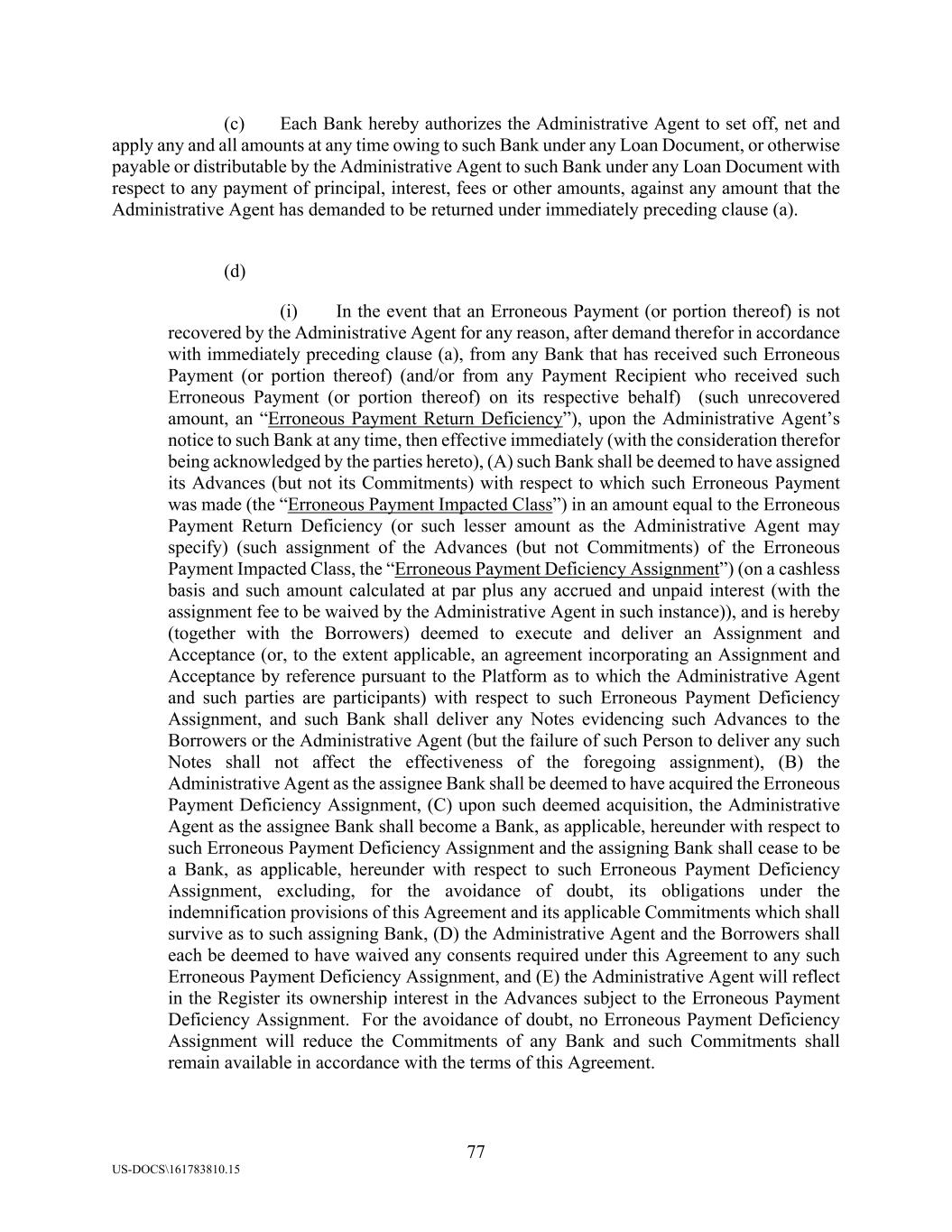 77 US-DOCS\161783810.15 (c) Each Bank hereby authorizes the Administrative Agent to set off, net and apply any and all amounts at any time owing to such Bank under any Loan Document, or otherwise payable or distributable by the Administrative Agent to such Bank under any Loan Document with respect to any payment of principal, interest, fees or other amounts, against any amount that the Administrative Agent has demanded to be returned under immediately preceding clause (a). (d) (i) In the event that an Erroneous Payment (or portion thereof) is not recovered by the Administrative Agent for any reason, after demand therefor in accordance with immediately preceding clause (a), from any Bank that has received such Erroneous Payment (or portion thereof) (and/or from any Payment Recipient who received such Erroneous Payment (or portion thereof) on its respective behalf) (such unrecovered amount, an “Erroneous Payment Return Deficiency”), upon the Administrative Agent’s notice to such Bank at any time, then effective immediately (with the consideration therefor being acknowledged by the parties hereto), (A) such Bank shall be deemed to have assigned its Advances (but not its Commitments) with respect to which such Erroneous Payment was made (the “Erroneous Payment Impacted Class”) in an amount equal to the Erroneous Payment Return Deficiency (or such lesser amount as the Administrative Agent may specify) (such assignment of the Advances (but not Commitments) of the Erroneous Payment Impacted Class, the “Erroneous Payment Deficiency Assignment”) (on a cashless basis and such amount calculated at par plus any accrued and unpaid interest (with the assignment fee to be waived by the Administrative Agent in such instance)), and is hereby (together with the Borrowers) deemed to execute and deliver an Assignment and Acceptance (or, to the extent applicable, an agreement incorporating an Assignment and Acceptance by reference pursuant to the Platform as to which the Administrative Agent and such parties are participants) with respect to such Erroneous Payment Deficiency Assignment, and such Bank shall deliver any Notes evidencing such Advances to the Borrowers or the Administrative Agent (but the failure of such Person to deliver any such Notes shall not affect the effectiveness of the foregoing assignment), (B) the Administrative Agent as the assignee Bank shall be deemed to have acquired the Erroneous Payment Deficiency Assignment, (C) upon such deemed acquisition, the Administrative Agent as the assignee Bank shall become a Bank, as applicable, hereunder with respect to such Erroneous Payment Deficiency Assignment and the assigning Bank shall cease to be a Bank, as applicable, hereunder with respect to such Erroneous Payment Deficiency Assignment, excluding, for the avoidance of doubt, its obligations under the indemnification provisions of this Agreement and its applicable Commitments which shall survive as to such assigning Bank, (D) the Administrative Agent and the Borrowers shall each be deemed to have waived any consents required under this Agreement to any such Erroneous Payment Deficiency Assignment, and (E) the Administrative Agent will reflect in the Register its ownership interest in the Advances subject to the Erroneous Payment Deficiency Assignment. For the avoidance of doubt, no Erroneous Payment Deficiency Assignment will reduce the Commitments of any Bank and such Commitments shall remain available in accordance with the terms of this Agreement.