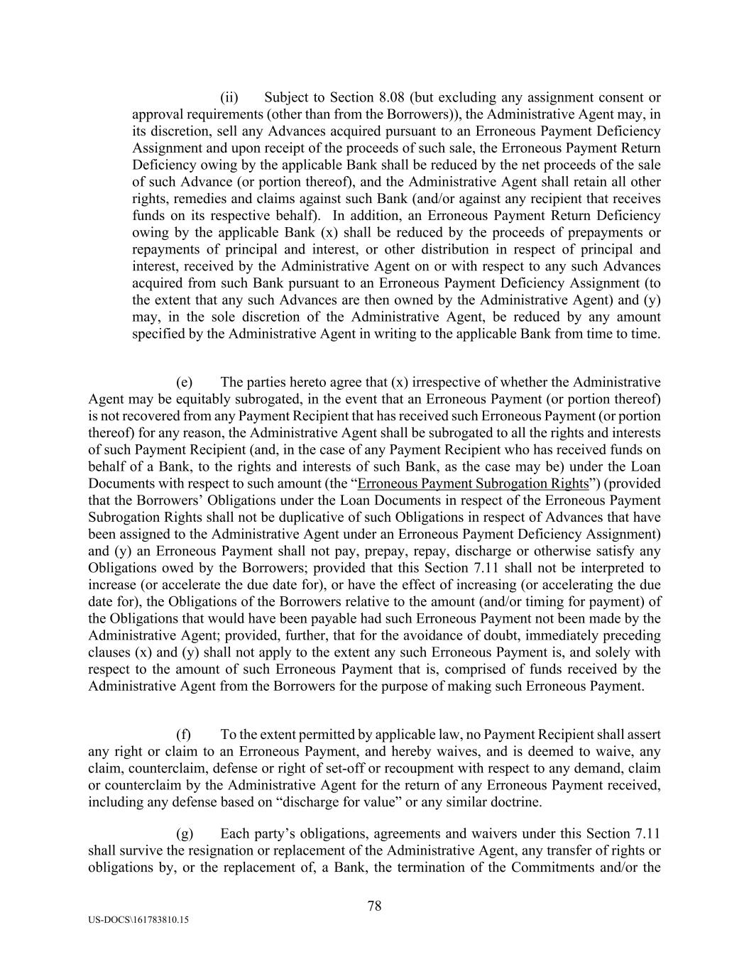 78 US-DOCS\161783810.15 (ii) Subject to Section 8.08 (but excluding any assignment consent or approval requirements (other than from the Borrowers)), the Administrative Agent may, in its discretion, sell any Advances acquired pursuant to an Erroneous Payment Deficiency Assignment and upon receipt of the proceeds of such sale, the Erroneous Payment Return Deficiency owing by the applicable Bank shall be reduced by the net proceeds of the sale of such Advance (or portion thereof), and the Administrative Agent shall retain all other rights, remedies and claims against such Bank (and/or against any recipient that receives funds on its respective behalf). In addition, an Erroneous Payment Return Deficiency owing by the applicable Bank (x) shall be reduced by the proceeds of prepayments or repayments of principal and interest, or other distribution in respect of principal and interest, received by the Administrative Agent on or with respect to any such Advances acquired from such Bank pursuant to an Erroneous Payment Deficiency Assignment (to the extent that any such Advances are then owned by the Administrative Agent) and (y) may, in the sole discretion of the Administrative Agent, be reduced by any amount specified by the Administrative Agent in writing to the applicable Bank from time to time. (e) The parties hereto agree that (x) irrespective of whether the Administrative Agent may be equitably subrogated, in the event that an Erroneous Payment (or portion thereof) is not recovered from any Payment Recipient that has received such Erroneous Payment (or portion thereof) for any reason, the Administrative Agent shall be subrogated to all the rights and interests of such Payment Recipient (and, in the case of any Payment Recipient who has received funds on behalf of a Bank, to the rights and interests of such Bank, as the case may be) under the Loan Documents with respect to such amount (the “Erroneous Payment Subrogation Rights”) (provided that the Borrowers’ Obligations under the Loan Documents in respect of the Erroneous Payment Subrogation Rights shall not be duplicative of such Obligations in respect of Advances that have been assigned to the Administrative Agent under an Erroneous Payment Deficiency Assignment) and (y) an Erroneous Payment shall not pay, prepay, repay, discharge or otherwise satisfy any Obligations owed by the Borrowers; provided that this Section 7.11 shall not be interpreted to increase (or accelerate the due date for), or have the effect of increasing (or accelerating the due date for), the Obligations of the Borrowers relative to the amount (and/or timing for payment) of the Obligations that would have been payable had such Erroneous Payment not been made by the Administrative Agent; provided, further, that for the avoidance of doubt, immediately preceding clauses (x) and (y) shall not apply to the extent any such Erroneous Payment is, and solely with respect to the amount of such Erroneous Payment that is, comprised of funds received by the Administrative Agent from the Borrowers for the purpose of making such Erroneous Payment. (f) To the extent permitted by applicable law, no Payment Recipient shall assert any right or claim to an Erroneous Payment, and hereby waives, and is deemed to waive, any claim, counterclaim, defense or right of set-off or recoupment with respect to any demand, claim or counterclaim by the Administrative Agent for the return of any Erroneous Payment received, including any defense based on “discharge for value” or any similar doctrine. (g) Each party’s obligations, agreements and waivers under this Section 7.11 shall survive the resignation or replacement of the Administrative Agent, any transfer of rights or obligations by, or the replacement of, a Bank, the termination of the Commitments and/or the