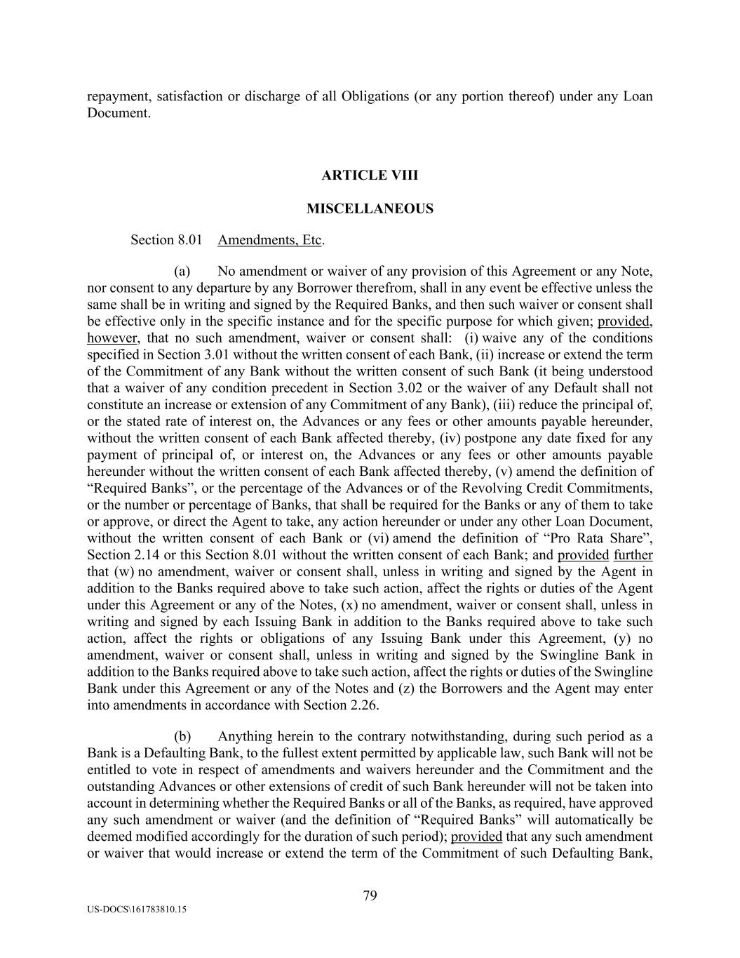 79 US-DOCS\161783810.15 repayment, satisfaction or discharge of all Obligations (or any portion thereof) under any Loan Document. ARTICLE VIII MISCELLANEOUS Section 8.01 Amendments, Etc. (a) No amendment or waiver of any provision of this Agreement or any Note, nor consent to any departure by any Borrower therefrom, shall in any event be effective unless the same shall be in writing and signed by the Required Banks, and then such waiver or consent shall be effective only in the specific instance and for the specific purpose for which given; provided, however, that no such amendment, waiver or consent shall: (i) waive any of the conditions specified in Section 3.01 without the written consent of each Bank, (ii) increase or extend the term of the Commitment of any Bank without the written consent of such Bank (it being understood that a waiver of any condition precedent in Section 3.02 or the waiver of any Default shall not constitute an increase or extension of any Commitment of any Bank), (iii) reduce the principal of, or the stated rate of interest on, the Advances or any fees or other amounts payable hereunder, without the written consent of each Bank affected thereby, (iv) postpone any date fixed for any payment of principal of, or interest on, the Advances or any fees or other amounts payable hereunder without the written consent of each Bank affected thereby, (v) amend the definition of “Required Banks”, or the percentage of the Advances or of the Revolving Credit Commitments, or the number or percentage of Banks, that shall be required for the Banks or any of them to take or approve, or direct the Agent to take, any action hereunder or under any other Loan Document, without the written consent of each Bank or (vi) amend the definition of “Pro Rata Share”, Section 2.14 or this Section 8.01 without the written consent of each Bank; and provided further that (w) no amendment, waiver or consent shall, unless in writing and signed by the Agent in addition to the Banks required above to take such action, affect the rights or duties of the Agent under this Agreement or any of the Notes, (x) no amendment, waiver or consent shall, unless in writing and signed by each Issuing Bank in addition to the Banks required above to take such action, affect the rights or obligations of any Issuing Bank under this Agreement, (y) no amendment, waiver or consent shall, unless in writing and signed by the Swingline Bank in addition to the Banks required above to take such action, affect the rights or duties of the Swingline Bank under this Agreement or any of the Notes and (z) the Borrowers and the Agent may enter into amendments in accordance with Section 2.26. (b) Anything herein to the contrary notwithstanding, during such period as a Bank is a Defaulting Bank, to the fullest extent permitted by applicable law, such Bank will not be entitled to vote in respect of amendments and waivers hereunder and the Commitment and the outstanding Advances or other extensions of credit of such Bank hereunder will not be taken into account in determining whether the Required Banks or all of the Banks, as required, have approved any such amendment or waiver (and the definition of “Required Banks” will automatically be deemed modified accordingly for the duration of such period); provided that any such amendment or waiver that would increase or extend the term of the Commitment of such Defaulting Bank,