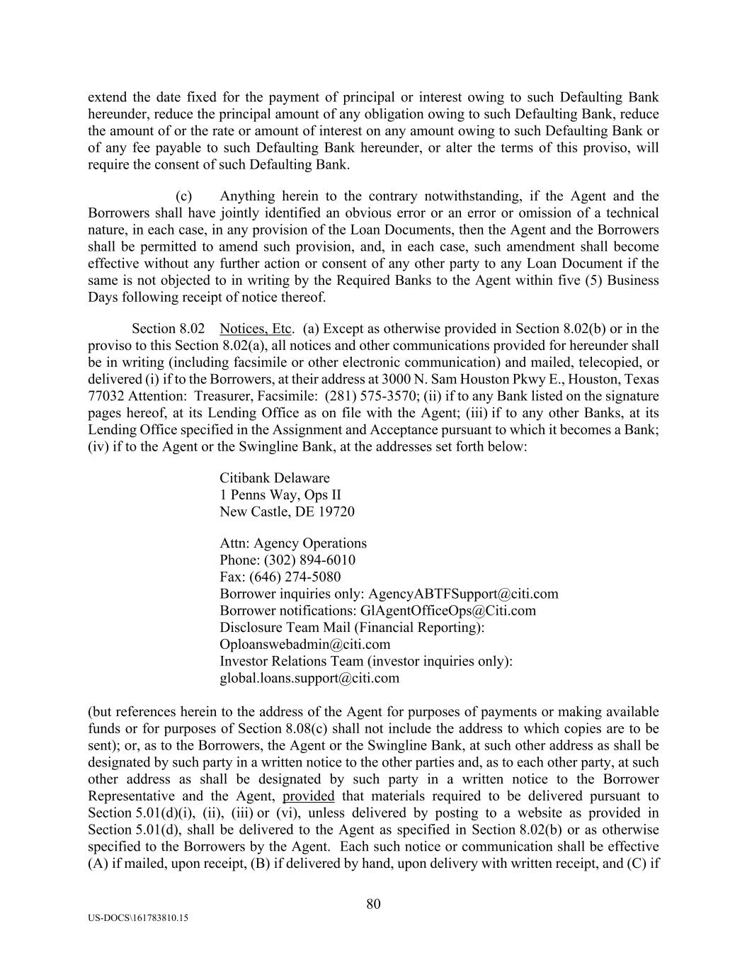 80 US-DOCS\161783810.15 extend the date fixed for the payment of principal or interest owing to such Defaulting Bank hereunder, reduce the principal amount of any obligation owing to such Defaulting Bank, reduce the amount of or the rate or amount of interest on any amount owing to such Defaulting Bank or of any fee payable to such Defaulting Bank hereunder, or alter the terms of this proviso, will require the consent of such Defaulting Bank. (c) Anything herein to the contrary notwithstanding, if the Agent and the Borrowers shall have jointly identified an obvious error or an error or omission of a technical nature, in each case, in any provision of the Loan Documents, then the Agent and the Borrowers shall be permitted to amend such provision, and, in each case, such amendment shall become effective without any further action or consent of any other party to any Loan Document if the same is not objected to in writing by the Required Banks to the Agent within five (5) Business Days following receipt of notice thereof. Section 8.02 Notices, Etc. (a) Except as otherwise provided in Section 8.02(b) or in the proviso to this Section 8.02(a), all notices and other communications provided for hereunder shall be in writing (including facsimile or other electronic communication) and mailed, telecopied, or delivered (i) if to the Borrowers, at their address at 3000 N. Sam Houston Pkwy E., Houston, Texas 77032 Attention: Treasurer, Facsimile: (281) 575-3570; (ii) if to any Bank listed on the signature pages hereof, at its Lending Office as on file with the Agent; (iii) if to any other Banks, at its Lending Office specified in the Assignment and Acceptance pursuant to which it becomes a Bank; (iv) if to the Agent or the Swingline Bank, at the addresses set forth below: Citibank Delaware 1 Penns Way, Ops II New Castle, DE 19720 Attn: Agency Operations Phone: (302) 894-6010 Fax: (646) 274-5080 Borrower inquiries only: AgencyABTFSupport@citi.com Borrower notifications: GlAgentOfficeOps@Citi.com Disclosure Team Mail (Financial Reporting): Oploanswebadmin@citi.com Investor Relations Team (investor inquiries only): global.loans.support@citi.com (but references herein to the address of the Agent for purposes of payments or making available funds or for purposes of Section 8.08(c) shall not include the address to which copies are to be sent); or, as to the Borrowers, the Agent or the Swingline Bank, at such other address as shall be designated by such party in a written notice to the other parties and, as to each other party, at such other address as shall be designated by such party in a written notice to the Borrower Representative and the Agent, provided that materials required to be delivered pursuant to Section 5.01(d)(i), (ii), (iii) or (vi), unless delivered by posting to a website as provided in Section 5.01(d), shall be delivered to the Agent as specified in Section 8.02(b) or as otherwise specified to the Borrowers by the Agent. Each such notice or communication shall be effective (A) if mailed, upon receipt, (B) if delivered by hand, upon delivery with written receipt, and (C) if