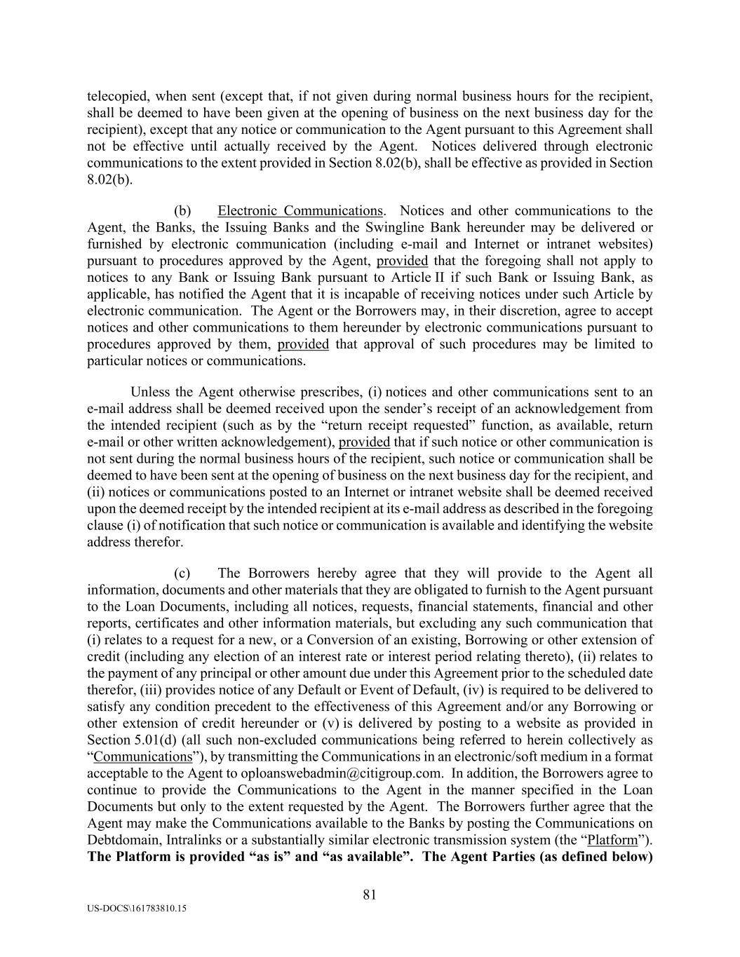 81 US-DOCS\161783810.15 telecopied, when sent (except that, if not given during normal business hours for the recipient, shall be deemed to have been given at the opening of business on the next business day for the recipient), except that any notice or communication to the Agent pursuant to this Agreement shall not be effective until actually received by the Agent. Notices delivered through electronic communications to the extent provided in Section 8.02(b), shall be effective as provided in Section 8.02(b). (b) Electronic Communications. Notices and other communications to the Agent, the Banks, the Issuing Banks and the Swingline Bank hereunder may be delivered or furnished by electronic communication (including e-mail and Internet or intranet websites) pursuant to procedures approved by the Agent, provided that the foregoing shall not apply to notices to any Bank or Issuing Bank pursuant to Article II if such Bank or Issuing Bank, as applicable, has notified the Agent that it is incapable of receiving notices under such Article by electronic communication. The Agent or the Borrowers may, in their discretion, agree to accept notices and other communications to them hereunder by electronic communications pursuant to procedures approved by them, provided that approval of such procedures may be limited to particular notices or communications. Unless the Agent otherwise prescribes, (i) notices and other communications sent to an e-mail address shall be deemed received upon the sender’s receipt of an acknowledgement from the intended recipient (such as by the “return receipt requested” function, as available, return e-mail or other written acknowledgement), provided that if such notice or other communication is not sent during the normal business hours of the recipient, such notice or communication shall be deemed to have been sent at the opening of business on the next business day for the recipient, and (ii) notices or communications posted to an Internet or intranet website shall be deemed received upon the deemed receipt by the intended recipient at its e-mail address as described in the foregoing clause (i) of notification that such notice or communication is available and identifying the website address therefor. (c) The Borrowers hereby agree that they will provide to the Agent all information, documents and other materials that they are obligated to furnish to the Agent pursuant to the Loan Documents, including all notices, requests, financial statements, financial and other reports, certificates and other information materials, but excluding any such communication that (i) relates to a request for a new, or a Conversion of an existing, Borrowing or other extension of credit (including any election of an interest rate or interest period relating thereto), (ii) relates to the payment of any principal or other amount due under this Agreement prior to the scheduled date therefor, (iii) provides notice of any Default or Event of Default, (iv) is required to be delivered to satisfy any condition precedent to the effectiveness of this Agreement and/or any Borrowing or other extension of credit hereunder or (v) is delivered by posting to a website as provided in Section 5.01(d) (all such non-excluded communications being referred to herein collectively as “Communications”), by transmitting the Communications in an electronic/soft medium in a format acceptable to the Agent to oploanswebadmin@citigroup.com. In addition, the Borrowers agree to continue to provide the Communications to the Agent in the manner specified in the Loan Documents but only to the extent requested by the Agent. The Borrowers further agree that the Agent may make the Communications available to the Banks by posting the Communications on Debtdomain, Intralinks or a substantially similar electronic transmission system (the “Platform”). The Platform is provided “as is” and “as available”. The Agent Parties (as defined below)