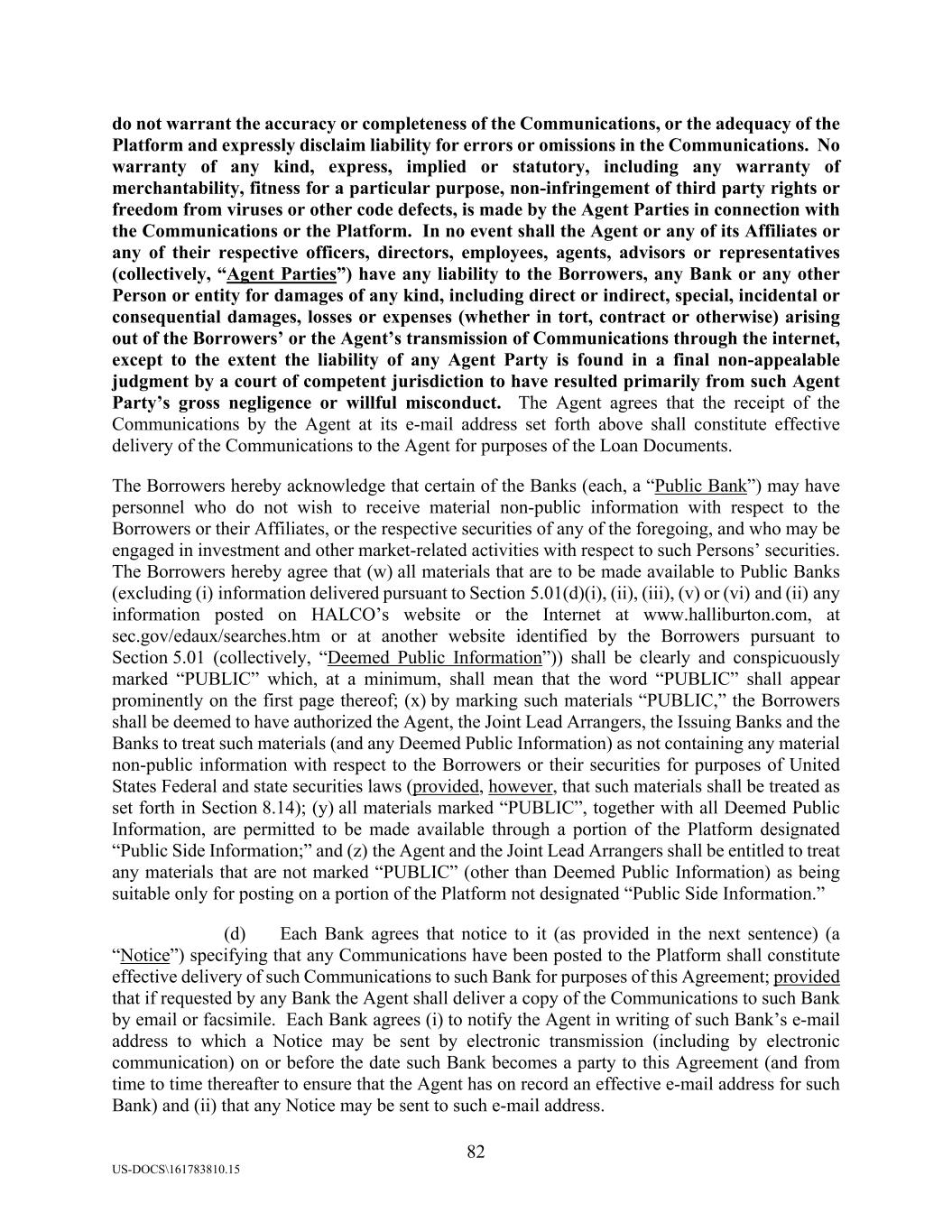 82 US-DOCS\161783810.15 do not warrant the accuracy or completeness of the Communications, or the adequacy of the Platform and expressly disclaim liability for errors or omissions in the Communications. No warranty of any kind, express, implied or statutory, including any warranty of merchantability, fitness for a particular purpose, non-infringement of third party rights or freedom from viruses or other code defects, is made by the Agent Parties in connection with the Communications or the Platform. In no event shall the Agent or any of its Affiliates or any of their respective officers, directors, employees, agents, advisors or representatives (collectively, “Agent Parties”) have any liability to the Borrowers, any Bank or any other Person or entity for damages of any kind, including direct or indirect, special, incidental or consequential damages, losses or expenses (whether in tort, contract or otherwise) arising out of the Borrowers’ or the Agent’s transmission of Communications through the internet, except to the extent the liability of any Agent Party is found in a final non-appealable judgment by a court of competent jurisdiction to have resulted primarily from such Agent Party’s gross negligence or willful misconduct. The Agent agrees that the receipt of the Communications by the Agent at its e-mail address set forth above shall constitute effective delivery of the Communications to the Agent for purposes of the Loan Documents. The Borrowers hereby acknowledge that certain of the Banks (each, a “Public Bank”) may have personnel who do not wish to receive material non-public information with respect to the Borrowers or their Affiliates, or the respective securities of any of the foregoing, and who may be engaged in investment and other market-related activities with respect to such Persons’ securities. The Borrowers hereby agree that (w) all materials that are to be made available to Public Banks (excluding (i) information delivered pursuant to Section 5.01(d)(i), (ii), (iii), (v) or (vi) and (ii) any information posted on HALCO’s website or the Internet at www.halliburton.com, at sec.gov/edaux/searches.htm or at another website identified by the Borrowers pursuant to Section 5.01 (collectively, “Deemed Public Information”)) shall be clearly and conspicuously marked “PUBLIC” which, at a minimum, shall mean that the word “PUBLIC” shall appear prominently on the first page thereof; (x) by marking such materials “PUBLIC,” the Borrowers shall be deemed to have authorized the Agent, the Joint Lead Arrangers, the Issuing Banks and the Banks to treat such materials (and any Deemed Public Information) as not containing any material non-public information with respect to the Borrowers or their securities for purposes of United States Federal and state securities laws (provided, however, that such materials shall be treated as set forth in Section 8.14); (y) all materials marked “PUBLIC”, together with all Deemed Public Information, are permitted to be made available through a portion of the Platform designated “Public Side Information;” and (z) the Agent and the Joint Lead Arrangers shall be entitled to treat any materials that are not marked “PUBLIC” (other than Deemed Public Information) as being suitable only for posting on a portion of the Platform not designated “Public Side Information.” (d) Each Bank agrees that notice to it (as provided in the next sentence) (a “Notice”) specifying that any Communications have been posted to the Platform shall constitute effective delivery of such Communications to such Bank for purposes of this Agreement; provided that if requested by any Bank the Agent shall deliver a copy of the Communications to such Bank by email or facsimile. Each Bank agrees (i) to notify the Agent in writing of such Bank’s e-mail address to which a Notice may be sent by electronic transmission (including by electronic communication) on or before the date such Bank becomes a party to this Agreement (and from time to time thereafter to ensure that the Agent has on record an effective e-mail address for such Bank) and (ii) that any Notice may be sent to such e-mail address.