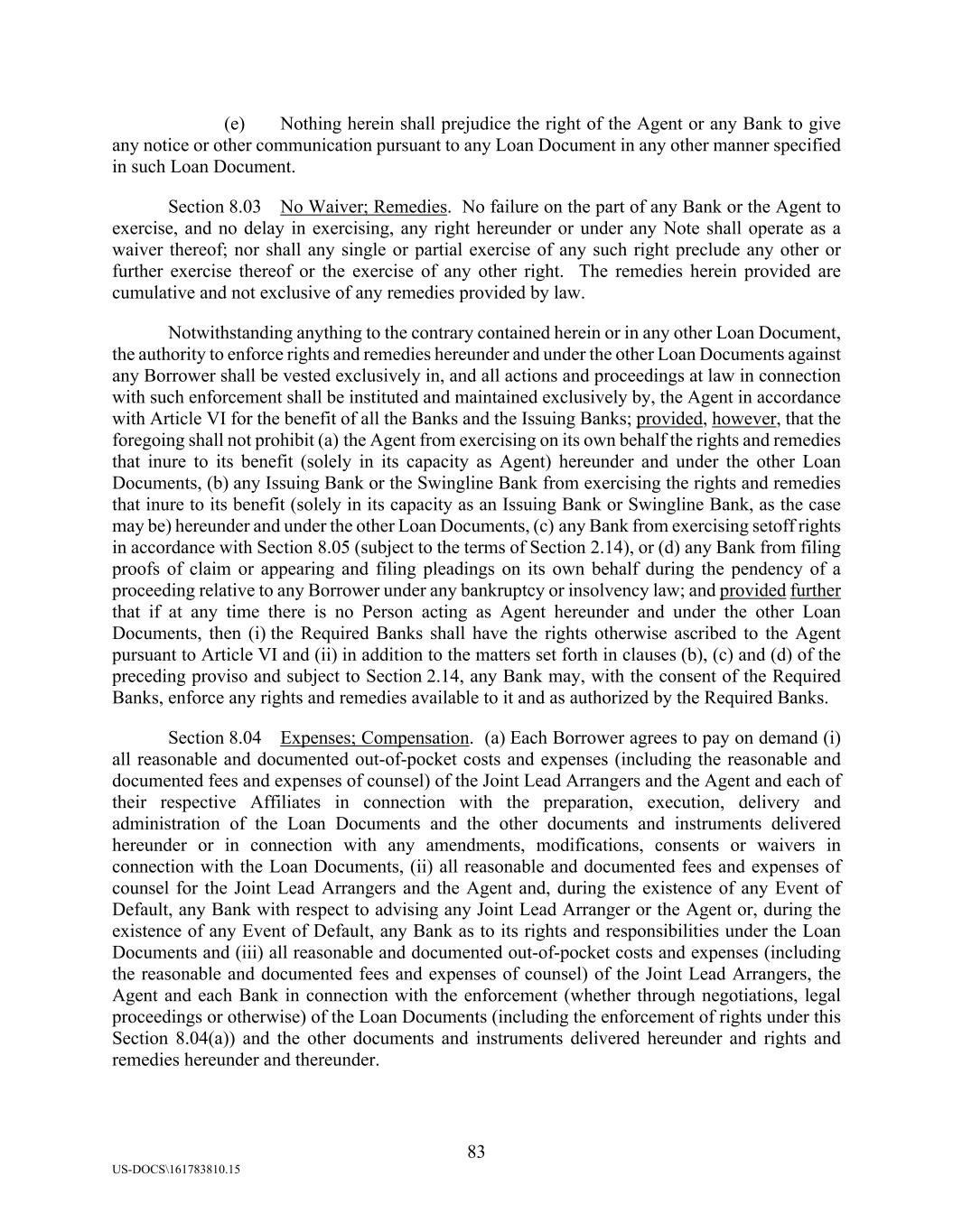 83 US-DOCS\161783810.15 (e) Nothing herein shall prejudice the right of the Agent or any Bank to give any notice or other communication pursuant to any Loan Document in any other manner specified in such Loan Document. Section 8.03 No Waiver; Remedies. No failure on the part of any Bank or the Agent to exercise, and no delay in exercising, any right hereunder or under any Note shall operate as a waiver thereof; nor shall any single or partial exercise of any such right preclude any other or further exercise thereof or the exercise of any other right. The remedies herein provided are cumulative and not exclusive of any remedies provided by law. Notwithstanding anything to the contrary contained herein or in any other Loan Document, the authority to enforce rights and remedies hereunder and under the other Loan Documents against any Borrower shall be vested exclusively in, and all actions and proceedings at law in connection with such enforcement shall be instituted and maintained exclusively by, the Agent in accordance with Article VI for the benefit of all the Banks and the Issuing Banks; provided, however, that the foregoing shall not prohibit (a) the Agent from exercising on its own behalf the rights and remedies that inure to its benefit (solely in its capacity as Agent) hereunder and under the other Loan Documents, (b) any Issuing Bank or the Swingline Bank from exercising the rights and remedies that inure to its benefit (solely in its capacity as an Issuing Bank or Swingline Bank, as the case may be) hereunder and under the other Loan Documents, (c) any Bank from exercising setoff rights in accordance with Section 8.05 (subject to the terms of Section 2.14), or (d) any Bank from filing proofs of claim or appearing and filing pleadings on its own behalf during the pendency of a proceeding relative to any Borrower under any bankruptcy or insolvency law; and provided further that if at any time there is no Person acting as Agent hereunder and under the other Loan Documents, then (i) the Required Banks shall have the rights otherwise ascribed to the Agent pursuant to Article VI and (ii) in addition to the matters set forth in clauses (b), (c) and (d) of the preceding proviso and subject to Section 2.14, any Bank may, with the consent of the Required Banks, enforce any rights and remedies available to it and as authorized by the Required Banks. Section 8.04 Expenses; Compensation. (a) Each Borrower agrees to pay on demand (i) all reasonable and documented out-of-pocket costs and expenses (including the reasonable and documented fees and expenses of counsel) of the Joint Lead Arrangers and the Agent and each of their respective Affiliates in connection with the preparation, execution, delivery and administration of the Loan Documents and the other documents and instruments delivered hereunder or in connection with any amendments, modifications, consents or waivers in connection with the Loan Documents, (ii) all reasonable and documented fees and expenses of counsel for the Joint Lead Arrangers and the Agent and, during the existence of any Event of Default, any Bank with respect to advising any Joint Lead Arranger or the Agent or, during the existence of any Event of Default, any Bank as to its rights and responsibilities under the Loan Documents and (iii) all reasonable and documented out-of-pocket costs and expenses (including the reasonable and documented fees and expenses of counsel) of the Joint Lead Arrangers, the Agent and each Bank in connection with the enforcement (whether through negotiations, legal proceedings or otherwise) of the Loan Documents (including the enforcement of rights under this Section 8.04(a)) and the other documents and instruments delivered hereunder and rights and remedies hereunder and thereunder.