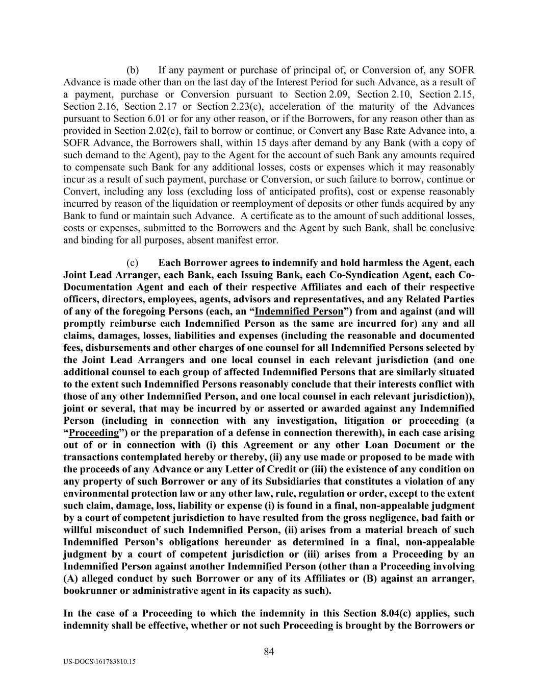 84 US-DOCS\161783810.15 (b) If any payment or purchase of principal of, or Conversion of, any SOFR Advance is made other than on the last day of the Interest Period for such Advance, as a result of a payment, purchase or Conversion pursuant to Section 2.09, Section 2.10, Section 2.15, Section 2.16, Section 2.17 or Section 2.23(c), acceleration of the maturity of the Advances pursuant to Section 6.01 or for any other reason, or if the Borrowers, for any reason other than as provided in Section 2.02(c), fail to borrow or continue, or Convert any Base Rate Advance into, a SOFR Advance, the Borrowers shall, within 15 days after demand by any Bank (with a copy of such demand to the Agent), pay to the Agent for the account of such Bank any amounts required to compensate such Bank for any additional losses, costs or expenses which it may reasonably incur as a result of such payment, purchase or Conversion, or such failure to borrow, continue or Convert, including any loss (excluding loss of anticipated profits), cost or expense reasonably incurred by reason of the liquidation or reemployment of deposits or other funds acquired by any Bank to fund or maintain such Advance. A certificate as to the amount of such additional losses, costs or expenses, submitted to the Borrowers and the Agent by such Bank, shall be conclusive and binding for all purposes, absent manifest error. (c) Each Borrower agrees to indemnify and hold harmless the Agent, each Joint Lead Arranger, each Bank, each Issuing Bank, each Co-Syndication Agent, each Co- Documentation Agent and each of their respective Affiliates and each of their respective officers, directors, employees, agents, advisors and representatives, and any Related Parties of any of the foregoing Persons (each, an “Indemnified Person”) from and against (and will promptly reimburse each Indemnified Person as the same are incurred for) any and all claims, damages, losses, liabilities and expenses (including the reasonable and documented fees, disbursements and other charges of one counsel for all Indemnified Persons selected by the Joint Lead Arrangers and one local counsel in each relevant jurisdiction (and one additional counsel to each group of affected Indemnified Persons that are similarly situated to the extent such Indemnified Persons reasonably conclude that their interests conflict with those of any other Indemnified Person, and one local counsel in each relevant jurisdiction)), joint or several, that may be incurred by or asserted or awarded against any Indemnified Person (including in connection with any investigation, litigation or proceeding (a “Proceeding”) or the preparation of a defense in connection therewith), in each case arising out of or in connection with (i) this Agreement or any other Loan Document or the transactions contemplated hereby or thereby, (ii) any use made or proposed to be made with the proceeds of any Advance or any Letter of Credit or (iii) the existence of any condition on any property of such Borrower or any of its Subsidiaries that constitutes a violation of any environmental protection law or any other law, rule, regulation or order, except to the extent such claim, damage, loss, liability or expense (i) is found in a final, non-appealable judgment by a court of competent jurisdiction to have resulted from the gross negligence, bad faith or willful misconduct of such Indemnified Person, (ii) arises from a material breach of such Indemnified Person’s obligations hereunder as determined in a final, non-appealable judgment by a court of competent jurisdiction or (iii) arises from a Proceeding by an Indemnified Person against another Indemnified Person (other than a Proceeding involving (A) alleged conduct by such Borrower or any of its Affiliates or (B) against an arranger, bookrunner or administrative agent in its capacity as such). In the case of a Proceeding to which the indemnity in this Section 8.04(c) applies, such indemnity shall be effective, whether or not such Proceeding is brought by the Borrowers or