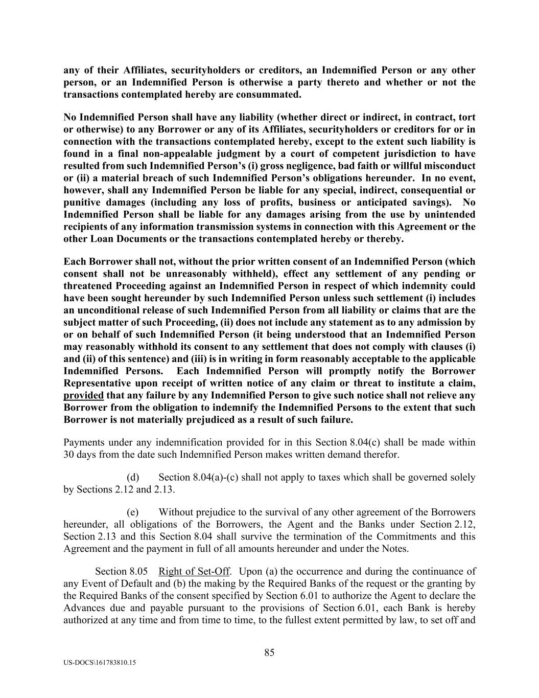 85 US-DOCS\161783810.15 any of their Affiliates, securityholders or creditors, an Indemnified Person or any other person, or an Indemnified Person is otherwise a party thereto and whether or not the transactions contemplated hereby are consummated. No Indemnified Person shall have any liability (whether direct or indirect, in contract, tort or otherwise) to any Borrower or any of its Affiliates, securityholders or creditors for or in connection with the transactions contemplated hereby, except to the extent such liability is found in a final non-appealable judgment by a court of competent jurisdiction to have resulted from such Indemnified Person’s (i) gross negligence, bad faith or willful misconduct or (ii) a material breach of such Indemnified Person’s obligations hereunder. In no event, however, shall any Indemnified Person be liable for any special, indirect, consequential or punitive damages (including any loss of profits, business or anticipated savings). No Indemnified Person shall be liable for any damages arising from the use by unintended recipients of any information transmission systems in connection with this Agreement or the other Loan Documents or the transactions contemplated hereby or thereby. Each Borrower shall not, without the prior written consent of an Indemnified Person (which consent shall not be unreasonably withheld), effect any settlement of any pending or threatened Proceeding against an Indemnified Person in respect of which indemnity could have been sought hereunder by such Indemnified Person unless such settlement (i) includes an unconditional release of such Indemnified Person from all liability or claims that are the subject matter of such Proceeding, (ii) does not include any statement as to any admission by or on behalf of such Indemnified Person (it being understood that an Indemnified Person may reasonably withhold its consent to any settlement that does not comply with clauses (i) and (ii) of this sentence) and (iii) is in writing in form reasonably acceptable to the applicable Indemnified Persons. Each Indemnified Person will promptly notify the Borrower Representative upon receipt of written notice of any claim or threat to institute a claim, provided that any failure by any Indemnified Person to give such notice shall not relieve any Borrower from the obligation to indemnify the Indemnified Persons to the extent that such Borrower is not materially prejudiced as a result of such failure. Payments under any indemnification provided for in this Section 8.04(c) shall be made within 30 days from the date such Indemnified Person makes written demand therefor. (d) Section 8.04(a)-(c) shall not apply to taxes which shall be governed solely by Sections 2.12 and 2.13. (e) Without prejudice to the survival of any other agreement of the Borrowers hereunder, all obligations of the Borrowers, the Agent and the Banks under Section 2.12, Section 2.13 and this Section 8.04 shall survive the termination of the Commitments and this Agreement and the payment in full of all amounts hereunder and under the Notes. Section 8.05 Right of Set-Off. Upon (a) the occurrence and during the continuance of any Event of Default and (b) the making by the Required Banks of the request or the granting by the Required Banks of the consent specified by Section 6.01 to authorize the Agent to declare the Advances due and payable pursuant to the provisions of Section 6.01, each Bank is hereby authorized at any time and from time to time, to the fullest extent permitted by law, to set off and