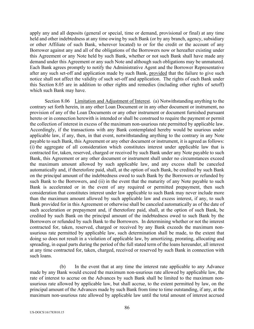 86 US-DOCS\161783810.15 apply any and all deposits (general or special, time or demand, provisional or final) at any time held and other indebtedness at any time owing by such Bank (or by any branch, agency, subsidiary or other Affiliate of such Bank, wherever located) to or for the credit or the account of any Borrower against any and all of the obligations of the Borrowers now or hereafter existing under this Agreement or any Note held by such Bank, whether or not such Bank shall have made any demand under this Agreement or any such Note and although such obligations may be unmatured. Each Bank agrees promptly to notify the Administrative Agent and the Borrower Representative after any such set-off and application made by such Bank, provided that the failure to give such notice shall not affect the validity of such set-off and application. The rights of each Bank under this Section 8.05 are in addition to other rights and remedies (including other rights of setoff) which such Bank may have. Section 8.06 Limitation and Adjustment of Interest. (a) Notwithstanding anything to the contrary set forth herein, in any other Loan Document or in any other document or instrument, no provision of any of the Loan Documents or any other instrument or document furnished pursuant hereto or in connection herewith is intended or shall be construed to require the payment or permit the collection of interest in excess of the maximum non-usurious rate permitted by applicable law. Accordingly, if the transactions with any Bank contemplated hereby would be usurious under applicable law, if any, then, in that event, notwithstanding anything to the contrary in any Note payable to such Bank, this Agreement or any other document or instrument, it is agreed as follows: (i) the aggregate of all consideration which constitutes interest under applicable law that is contracted for, taken, reserved, charged or received by such Bank under any Note payable to such Bank, this Agreement or any other document or instrument shall under no circumstances exceed the maximum amount allowed by such applicable law, and any excess shall be canceled automatically and, if theretofore paid, shall, at the option of such Bank, be credited by such Bank on the principal amount of the indebtedness owed to such Bank by the Borrowers or refunded by such Bank to the Borrowers, and (ii) in the event that the maturity of any Note payable to such Bank is accelerated or in the event of any required or permitted prepayment, then such consideration that constitutes interest under law applicable to such Bank may never include more than the maximum amount allowed by such applicable law and excess interest, if any, to such Bank provided for in this Agreement or otherwise shall be canceled automatically as of the date of such acceleration or prepayment and, if theretofore paid, shall, at the option of such Bank, be credited by such Bank on the principal amount of the indebtedness owed to such Bank by the Borrowers or refunded by such Bank to the Borrowers. In determining whether or not the interest contracted for, taken, reserved, charged or received by any Bank exceeds the maximum non- usurious rate permitted by applicable law, such determination shall be made, to the extent that doing so does not result in a violation of applicable law, by amortizing, prorating, allocating and spreading, in equal parts during the period of the full stated term of the loans hereunder, all interest at any time contracted for, taken, charged, received or reserved by such Bank in connection with such loans. (b) In the event that at any time the interest rate applicable to any Advance made by any Bank would exceed the maximum non-usurious rate allowed by applicable law, the rate of interest to accrue on the Advances by such Bank shall be limited to the maximum non- usurious rate allowed by applicable law, but shall accrue, to the extent permitted by law, on the principal amount of the Advances made by such Bank from time to time outstanding, if any, at the maximum non-usurious rate allowed by applicable law until the total amount of interest accrued
