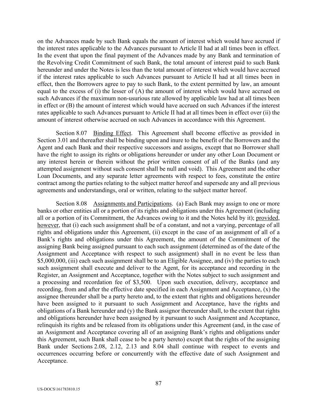 87 US-DOCS\161783810.15 on the Advances made by such Bank equals the amount of interest which would have accrued if the interest rates applicable to the Advances pursuant to Article II had at all times been in effect. In the event that upon the final payment of the Advances made by any Bank and termination of the Revolving Credit Commitment of such Bank, the total amount of interest paid to such Bank hereunder and under the Notes is less than the total amount of interest which would have accrued if the interest rates applicable to such Advances pursuant to Article II had at all times been in effect, then the Borrowers agree to pay to such Bank, to the extent permitted by law, an amount equal to the excess of (i) the lesser of (A) the amount of interest which would have accrued on such Advances if the maximum non-usurious rate allowed by applicable law had at all times been in effect or (B) the amount of interest which would have accrued on such Advances if the interest rates applicable to such Advances pursuant to Article II had at all times been in effect over (ii) the amount of interest otherwise accrued on such Advances in accordance with this Agreement. Section 8.07 Binding Effect. This Agreement shall become effective as provided in Section 3.01 and thereafter shall be binding upon and inure to the benefit of the Borrowers and the Agent and each Bank and their respective successors and assigns, except that no Borrower shall have the right to assign its rights or obligations hereunder or under any other Loan Document or any interest herein or therein without the prior written consent of all of the Banks (and any attempted assignment without such consent shall be null and void). This Agreement and the other Loan Documents, and any separate letter agreements with respect to fees, constitute the entire contract among the parties relating to the subject matter hereof and supersede any and all previous agreements and understandings, oral or written, relating to the subject matter hereof. Section 8.08 Assignments and Participations. (a) Each Bank may assign to one or more banks or other entities all or a portion of its rights and obligations under this Agreement (including all or a portion of its Commitment, the Advances owing to it and the Notes held by it); provided, however, that (i) each such assignment shall be of a constant, and not a varying, percentage of all rights and obligations under this Agreement, (ii) except in the case of an assignment of all of a Bank’s rights and obligations under this Agreement, the amount of the Commitment of the assigning Bank being assigned pursuant to each such assignment (determined as of the date of the Assignment and Acceptance with respect to such assignment) shall in no event be less than $5,000,000, (iii) each such assignment shall be to an Eligible Assignee, and (iv) the parties to each such assignment shall execute and deliver to the Agent, for its acceptance and recording in the Register, an Assignment and Acceptance, together with the Notes subject to such assignment and a processing and recordation fee of $3,500. Upon such execution, delivery, acceptance and recording, from and after the effective date specified in each Assignment and Acceptance, (x) the assignee thereunder shall be a party hereto and, to the extent that rights and obligations hereunder have been assigned to it pursuant to such Assignment and Acceptance, have the rights and obligations of a Bank hereunder and (y) the Bank assignor thereunder shall, to the extent that rights and obligations hereunder have been assigned by it pursuant to such Assignment and Acceptance, relinquish its rights and be released from its obligations under this Agreement (and, in the case of an Assignment and Acceptance covering all of an assigning Bank’s rights and obligations under this Agreement, such Bank shall cease to be a party hereto) except that the rights of the assigning Bank under Sections 2.08, 2.12, 2.13 and 8.04 shall continue with respect to events and occurrences occurring before or concurrently with the effective date of such Assignment and Acceptance.