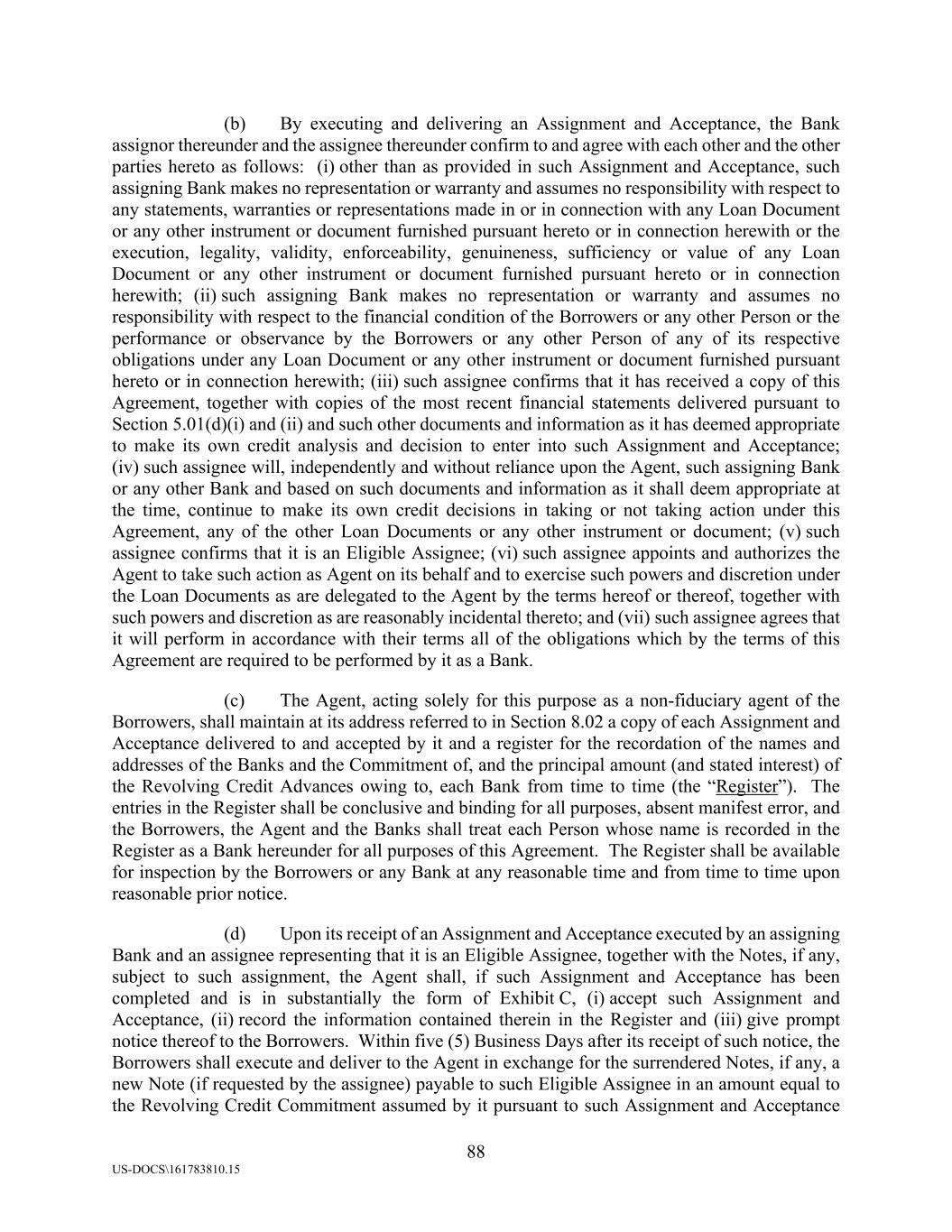 88 US-DOCS\161783810.15 (b) By executing and delivering an Assignment and Acceptance, the Bank assignor thereunder and the assignee thereunder confirm to and agree with each other and the other parties hereto as follows: (i) other than as provided in such Assignment and Acceptance, such assigning Bank makes no representation or warranty and assumes no responsibility with respect to any statements, warranties or representations made in or in connection with any Loan Document or any other instrument or document furnished pursuant hereto or in connection herewith or the execution, legality, validity, enforceability, genuineness, sufficiency or value of any Loan Document or any other instrument or document furnished pursuant hereto or in connection herewith; (ii) such assigning Bank makes no representation or warranty and assumes no responsibility with respect to the financial condition of the Borrowers or any other Person or the performance or observance by the Borrowers or any other Person of any of its respective obligations under any Loan Document or any other instrument or document furnished pursuant hereto or in connection herewith; (iii) such assignee confirms that it has received a copy of this Agreement, together with copies of the most recent financial statements delivered pursuant to Section 5.01(d)(i) and (ii) and such other documents and information as it has deemed appropriate to make its own credit analysis and decision to enter into such Assignment and Acceptance; (iv) such assignee will, independently and without reliance upon the Agent, such assigning Bank or any other Bank and based on such documents and information as it shall deem appropriate at the time, continue to make its own credit decisions in taking or not taking action under this Agreement, any of the other Loan Documents or any other instrument or document; (v) such assignee confirms that it is an Eligible Assignee; (vi) such assignee appoints and authorizes the Agent to take such action as Agent on its behalf and to exercise such powers and discretion under the Loan Documents as are delegated to the Agent by the terms hereof or thereof, together with such powers and discretion as are reasonably incidental thereto; and (vii) such assignee agrees that it will perform in accordance with their terms all of the obligations which by the terms of this Agreement are required to be performed by it as a Bank. (c) The Agent, acting solely for this purpose as a non-fiduciary agent of the Borrowers, shall maintain at its address referred to in Section 8.02 a copy of each Assignment and Acceptance delivered to and accepted by it and a register for the recordation of the names and addresses of the Banks and the Commitment of, and the principal amount (and stated interest) of the Revolving Credit Advances owing to, each Bank from time to time (the “Register”). The entries in the Register shall be conclusive and binding for all purposes, absent manifest error, and the Borrowers, the Agent and the Banks shall treat each Person whose name is recorded in the Register as a Bank hereunder for all purposes of this Agreement. The Register shall be available for inspection by the Borrowers or any Bank at any reasonable time and from time to time upon reasonable prior notice. (d) Upon its receipt of an Assignment and Acceptance executed by an assigning Bank and an assignee representing that it is an Eligible Assignee, together with the Notes, if any, subject to such assignment, the Agent shall, if such Assignment and Acceptance has been completed and is in substantially the form of Exhibit C, (i) accept such Assignment and Acceptance, (ii) record the information contained therein in the Register and (iii) give prompt notice thereof to the Borrowers. Within five (5) Business Days after its receipt of such notice, the Borrowers shall execute and deliver to the Agent in exchange for the surrendered Notes, if any, a new Note (if requested by the assignee) payable to such Eligible Assignee in an amount equal to the Revolving Credit Commitment assumed by it pursuant to such Assignment and Acceptance