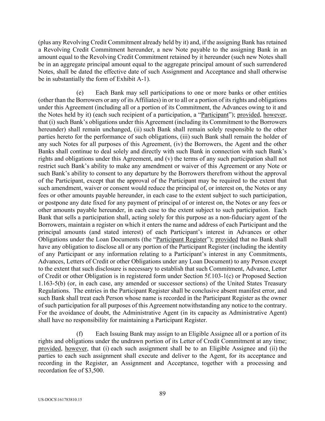 89 US-DOCS\161783810.15 (plus any Revolving Credit Commitment already held by it) and, if the assigning Bank has retained a Revolving Credit Commitment hereunder, a new Note payable to the assigning Bank in an amount equal to the Revolving Credit Commitment retained by it hereunder (such new Notes shall be in an aggregate principal amount equal to the aggregate principal amount of such surrendered Notes, shall be dated the effective date of such Assignment and Acceptance and shall otherwise be in substantially the form of Exhibit A-1). (e) Each Bank may sell participations to one or more banks or other entities (other than the Borrowers or any of its Affiliates) in or to all or a portion of its rights and obligations under this Agreement (including all or a portion of its Commitment, the Advances owing to it and the Notes held by it) (each such recipient of a participation, a “Participant”); provided, however, that (i) such Bank’s obligations under this Agreement (including its Commitment to the Borrowers hereunder) shall remain unchanged, (ii) such Bank shall remain solely responsible to the other parties hereto for the performance of such obligations, (iii) such Bank shall remain the holder of any such Notes for all purposes of this Agreement, (iv) the Borrowers, the Agent and the other Banks shall continue to deal solely and directly with such Bank in connection with such Bank’s rights and obligations under this Agreement, and (v) the terms of any such participation shall not restrict such Bank’s ability to make any amendment or waiver of this Agreement or any Note or such Bank’s ability to consent to any departure by the Borrowers therefrom without the approval of the Participant, except that the approval of the Participant may be required to the extent that such amendment, waiver or consent would reduce the principal of, or interest on, the Notes or any fees or other amounts payable hereunder, in each case to the extent subject to such participation, or postpone any date fixed for any payment of principal of or interest on, the Notes or any fees or other amounts payable hereunder, in each case to the extent subject to such participation. Each Bank that sells a participation shall, acting solely for this purpose as a non-fiduciary agent of the Borrowers, maintain a register on which it enters the name and address of each Participant and the principal amounts (and stated interest) of each Participant’s interest in Advances or other Obligations under the Loan Documents (the “Participant Register”); provided that no Bank shall have any obligation to disclose all or any portion of the Participant Register (including the identity of any Participant or any information relating to a Participant’s interest in any Commitments, Advances, Letters of Credit or other Obligations under any Loan Document) to any Person except to the extent that such disclosure is necessary to establish that such Commitment, Advance, Letter of Credit or other Obligation is in registered form under Section 5f.103-1(c) or Proposed Section 1.163-5(b) (or, in each case, any amended or successor sections) of the United States Treasury Regulations. The entries in the Participant Register shall be conclusive absent manifest error, and such Bank shall treat each Person whose name is recorded in the Participant Register as the owner of such participation for all purposes of this Agreement notwithstanding any notice to the contrary. For the avoidance of doubt, the Administrative Agent (in its capacity as Administrative Agent) shall have no responsibility for maintaining a Participant Register. (f) Each Issuing Bank may assign to an Eligible Assignee all or a portion of its rights and obligations under the undrawn portion of its Letter of Credit Commitment at any time; provided, however, that (i) each such assignment shall be to an Eligible Assignee and (ii) the parties to each such assignment shall execute and deliver to the Agent, for its acceptance and recording in the Register, an Assignment and Acceptance, together with a processing and recordation fee of $3,500.