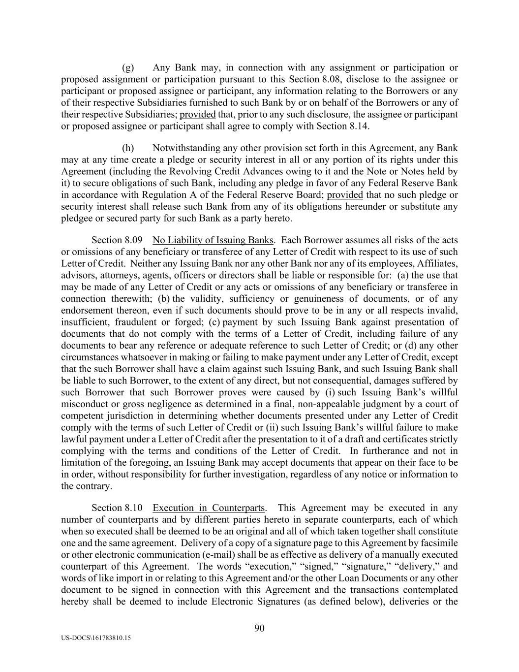 90 US-DOCS\161783810.15 (g) Any Bank may, in connection with any assignment or participation or proposed assignment or participation pursuant to this Section 8.08, disclose to the assignee or participant or proposed assignee or participant, any information relating to the Borrowers or any of their respective Subsidiaries furnished to such Bank by or on behalf of the Borrowers or any of their respective Subsidiaries; provided that, prior to any such disclosure, the assignee or participant or proposed assignee or participant shall agree to comply with Section 8.14. (h) Notwithstanding any other provision set forth in this Agreement, any Bank may at any time create a pledge or security interest in all or any portion of its rights under this Agreement (including the Revolving Credit Advances owing to it and the Note or Notes held by it) to secure obligations of such Bank, including any pledge in favor of any Federal Reserve Bank in accordance with Regulation A of the Federal Reserve Board; provided that no such pledge or security interest shall release such Bank from any of its obligations hereunder or substitute any pledgee or secured party for such Bank as a party hereto. Section 8.09 No Liability of Issuing Banks. Each Borrower assumes all risks of the acts or omissions of any beneficiary or transferee of any Letter of Credit with respect to its use of such Letter of Credit. Neither any Issuing Bank nor any other Bank nor any of its employees, Affiliates, advisors, attorneys, agents, officers or directors shall be liable or responsible for: (a) the use that may be made of any Letter of Credit or any acts or omissions of any beneficiary or transferee in connection therewith; (b) the validity, sufficiency or genuineness of documents, or of any endorsement thereon, even if such documents should prove to be in any or all respects invalid, insufficient, fraudulent or forged; (c) payment by such Issuing Bank against presentation of documents that do not comply with the terms of a Letter of Credit, including failure of any documents to bear any reference or adequate reference to such Letter of Credit; or (d) any other circumstances whatsoever in making or failing to make payment under any Letter of Credit, except that the such Borrower shall have a claim against such Issuing Bank, and such Issuing Bank shall be liable to such Borrower, to the extent of any direct, but not consequential, damages suffered by such Borrower that such Borrower proves were caused by (i) such Issuing Bank’s willful misconduct or gross negligence as determined in a final, non-appealable judgment by a court of competent jurisdiction in determining whether documents presented under any Letter of Credit comply with the terms of such Letter of Credit or (ii) such Issuing Bank’s willful failure to make lawful payment under a Letter of Credit after the presentation to it of a draft and certificates strictly complying with the terms and conditions of the Letter of Credit. In furtherance and not in limitation of the foregoing, an Issuing Bank may accept documents that appear on their face to be in order, without responsibility for further investigation, regardless of any notice or information to the contrary. Section 8.10 Execution in Counterparts. This Agreement may be executed in any number of counterparts and by different parties hereto in separate counterparts, each of which when so executed shall be deemed to be an original and all of which taken together shall constitute one and the same agreement. Delivery of a copy of a signature page to this Agreement by facsimile or other electronic communication (e-mail) shall be as effective as delivery of a manually executed counterpart of this Agreement. The words “execution,” “signed,” “signature,” “delivery,” and words of like import in or relating to this Agreement and/or the other Loan Documents or any other document to be signed in connection with this Agreement and the transactions contemplated hereby shall be deemed to include Electronic Signatures (as defined below), deliveries or the