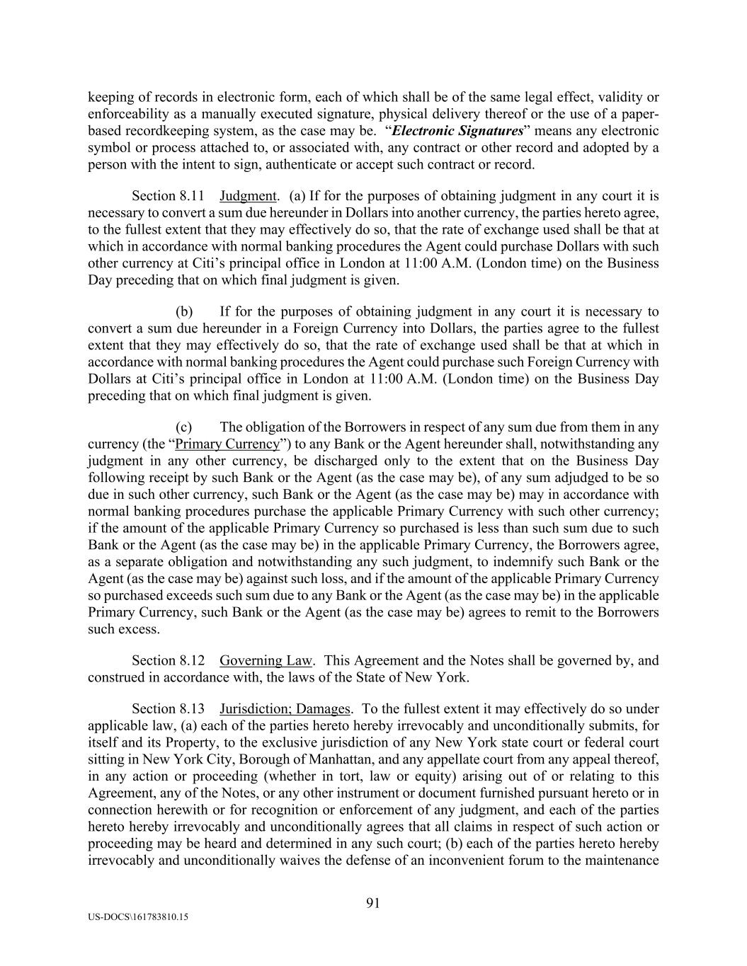 91 US-DOCS\161783810.15 keeping of records in electronic form, each of which shall be of the same legal effect, validity or enforceability as a manually executed signature, physical delivery thereof or the use of a paper- based recordkeeping system, as the case may be. “Electronic Signatures” means any electronic symbol or process attached to, or associated with, any contract or other record and adopted by a person with the intent to sign, authenticate or accept such contract or record. Section 8.11 Judgment. (a) If for the purposes of obtaining judgment in any court it is necessary to convert a sum due hereunder in Dollars into another currency, the parties hereto agree, to the fullest extent that they may effectively do so, that the rate of exchange used shall be that at which in accordance with normal banking procedures the Agent could purchase Dollars with such other currency at Citi’s principal office in London at 11:00 A.M. (London time) on the Business Day preceding that on which final judgment is given. (b) If for the purposes of obtaining judgment in any court it is necessary to convert a sum due hereunder in a Foreign Currency into Dollars, the parties agree to the fullest extent that they may effectively do so, that the rate of exchange used shall be that at which in accordance with normal banking procedures the Agent could purchase such Foreign Currency with Dollars at Citi’s principal office in London at 11:00 A.M. (London time) on the Business Day preceding that on which final judgment is given. (c) The obligation of the Borrowers in respect of any sum due from them in any currency (the “Primary Currency”) to any Bank or the Agent hereunder shall, notwithstanding any judgment in any other currency, be discharged only to the extent that on the Business Day following receipt by such Bank or the Agent (as the case may be), of any sum adjudged to be so due in such other currency, such Bank or the Agent (as the case may be) may in accordance with normal banking procedures purchase the applicable Primary Currency with such other currency; if the amount of the applicable Primary Currency so purchased is less than such sum due to such Bank or the Agent (as the case may be) in the applicable Primary Currency, the Borrowers agree, as a separate obligation and notwithstanding any such judgment, to indemnify such Bank or the Agent (as the case may be) against such loss, and if the amount of the applicable Primary Currency so purchased exceeds such sum due to any Bank or the Agent (as the case may be) in the applicable Primary Currency, such Bank or the Agent (as the case may be) agrees to remit to the Borrowers such excess. Section 8.12 Governing Law. This Agreement and the Notes shall be governed by, and construed in accordance with, the laws of the State of New York. Section 8.13 Jurisdiction; Damages. To the fullest extent it may effectively do so under applicable law, (a) each of the parties hereto hereby irrevocably and unconditionally submits, for itself and its Property, to the exclusive jurisdiction of any New York state court or federal court sitting in New York City, Borough of Manhattan, and any appellate court from any appeal thereof, in any action or proceeding (whether in tort, law or equity) arising out of or relating to this Agreement, any of the Notes, or any other instrument or document furnished pursuant hereto or in connection herewith or for recognition or enforcement of any judgment, and each of the parties hereto hereby irrevocably and unconditionally agrees that all claims in respect of such action or proceeding may be heard and determined in any such court; (b) each of the parties hereto hereby irrevocably and unconditionally waives the defense of an inconvenient forum to the maintenance