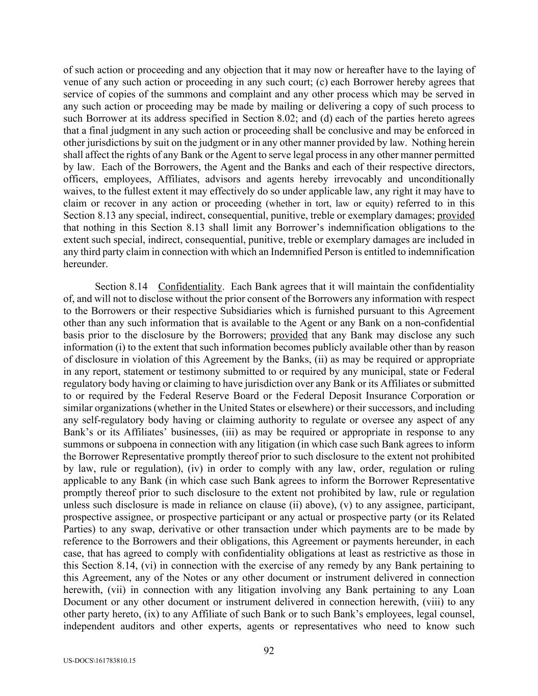 92 US-DOCS\161783810.15 of such action or proceeding and any objection that it may now or hereafter have to the laying of venue of any such action or proceeding in any such court; (c) each Borrower hereby agrees that service of copies of the summons and complaint and any other process which may be served in any such action or proceeding may be made by mailing or delivering a copy of such process to such Borrower at its address specified in Section 8.02; and (d) each of the parties hereto agrees that a final judgment in any such action or proceeding shall be conclusive and may be enforced in other jurisdictions by suit on the judgment or in any other manner provided by law. Nothing herein shall affect the rights of any Bank or the Agent to serve legal process in any other manner permitted by law. Each of the Borrowers, the Agent and the Banks and each of their respective directors, officers, employees, Affiliates, advisors and agents hereby irrevocably and unconditionally waives, to the fullest extent it may effectively do so under applicable law, any right it may have to claim or recover in any action or proceeding (whether in tort, law or equity) referred to in this Section 8.13 any special, indirect, consequential, punitive, treble or exemplary damages; provided that nothing in this Section 8.13 shall limit any Borrower’s indemnification obligations to the extent such special, indirect, consequential, punitive, treble or exemplary damages are included in any third party claim in connection with which an Indemnified Person is entitled to indemnification hereunder. Section 8.14 Confidentiality. Each Bank agrees that it will maintain the confidentiality of, and will not to disclose without the prior consent of the Borrowers any information with respect to the Borrowers or their respective Subsidiaries which is furnished pursuant to this Agreement other than any such information that is available to the Agent or any Bank on a non-confidential basis prior to the disclosure by the Borrowers; provided that any Bank may disclose any such information (i) to the extent that such information becomes publicly available other than by reason of disclosure in violation of this Agreement by the Banks, (ii) as may be required or appropriate in any report, statement or testimony submitted to or required by any municipal, state or Federal regulatory body having or claiming to have jurisdiction over any Bank or its Affiliates or submitted to or required by the Federal Reserve Board or the Federal Deposit Insurance Corporation or similar organizations (whether in the United States or elsewhere) or their successors, and including any self-regulatory body having or claiming authority to regulate or oversee any aspect of any Bank’s or its Affiliates’ businesses, (iii) as may be required or appropriate in response to any summons or subpoena in connection with any litigation (in which case such Bank agrees to inform the Borrower Representative promptly thereof prior to such disclosure to the extent not prohibited by law, rule or regulation), (iv) in order to comply with any law, order, regulation or ruling applicable to any Bank (in which case such Bank agrees to inform the Borrower Representative promptly thereof prior to such disclosure to the extent not prohibited by law, rule or regulation unless such disclosure is made in reliance on clause (ii) above), (v) to any assignee, participant, prospective assignee, or prospective participant or any actual or prospective party (or its Related Parties) to any swap, derivative or other transaction under which payments are to be made by reference to the Borrowers and their obligations, this Agreement or payments hereunder, in each case, that has agreed to comply with confidentiality obligations at least as restrictive as those in this Section 8.14, (vi) in connection with the exercise of any remedy by any Bank pertaining to this Agreement, any of the Notes or any other document or instrument delivered in connection herewith, (vii) in connection with any litigation involving any Bank pertaining to any Loan Document or any other document or instrument delivered in connection herewith, (viii) to any other party hereto, (ix) to any Affiliate of such Bank or to such Bank’s employees, legal counsel, independent auditors and other experts, agents or representatives who need to know such