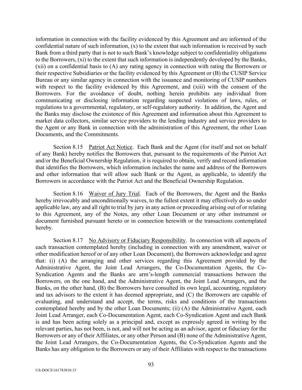 93 US-DOCS\161783810.15 information in connection with the facility evidenced by this Agreement and are informed of the confidential nature of such information, (x) to the extent that such information is received by such Bank from a third party that is not to such Bank’s knowledge subject to confidentiality obligations to the Borrowers, (xi) to the extent that such information is independently developed by the Banks, (xii) on a confidential basis to (A) any rating agency in connection with rating the Borrowers or their respective Subsidiaries or the facility evidenced by this Agreement or (B) the CUSIP Service Bureau or any similar agency in connection with the issuance and monitoring of CUSIP numbers with respect to the facility evidenced by this Agreement, and (xiii) with the consent of the Borrowers. For the avoidance of doubt, nothing herein prohibits any individual from communicating or disclosing information regarding suspected violations of laws, rules, or regulations to a governmental, regulatory, or self-regulatory authority. In addition, the Agent and the Banks may disclose the existence of this Agreement and information about this Agreement to market data collectors, similar service providers to the lending industry and service providers to the Agent or any Bank in connection with the administration of this Agreement, the other Loan Documents, and the Commitments. Section 8.15 Patriot Act Notice. Each Bank and the Agent (for itself and not on behalf of any Bank) hereby notifies the Borrowers that, pursuant to the requirements of the Patriot Act and/or the Beneficial Ownership Regulation, it is required to obtain, verify and record information that identifies the Borrowers, which information includes the name and address of the Borrowers and other information that will allow such Bank or the Agent, as applicable, to identify the Borrowers in accordance with the Patriot Act and the Beneficial Ownership Regulation. Section 8.16 Waiver of Jury Trial. Each of the Borrowers, the Agent and the Banks hereby irrevocably and unconditionally waives, to the fullest extent it may effectively do so under applicable law, any and all right to trial by jury in any action or proceeding arising out of or relating to this Agreement, any of the Notes, any other Loan Document or any other instrument or document furnished pursuant hereto or in connection herewith or the transactions contemplated hereby. Section 8.17 No Advisory or Fiduciary Responsibility. In connection with all aspects of each transaction contemplated hereby (including in connection with any amendment, waiver or other modification hereof or of any other Loan Document), the Borrowers acknowledge and agree that: (i) (A) the arranging and other services regarding this Agreement provided by the Administrative Agent, the Joint Lead Arrangers, the Co-Documentation Agents, the Co- Syndication Agents and the Banks are arm’s-length commercial transactions between the Borrowers, on the one hand, and the Administrative Agent, the Joint Lead Arrangers, and the Banks, on the other hand, (B) the Borrowers have consulted its own legal, accounting, regulatory and tax advisors to the extent it has deemed appropriate, and (C) the Borrowers are capable of evaluating, and understand and accept, the terms, risks and conditions of the transactions contemplated hereby and by the other Loan Documents; (ii) (A) the Administrative Agent, each Joint Lead Arranger, each Co-Documentation Agent, each Co-Syndication Agent and each Bank is and has been acting solely as a principal and, except as expressly agreed in writing by the relevant parties, has not been, is not, and will not be acting as an advisor, agent or fiduciary for the Borrowers or any of their Affiliates, or any other Person and (B) none of the Administrative Agent, the Joint Lead Arrangers, the Co-Documentation Agents, the Co-Syndication Agents and the Banks has any obligation to the Borrowers or any of their Affiliates with respect to the transactions