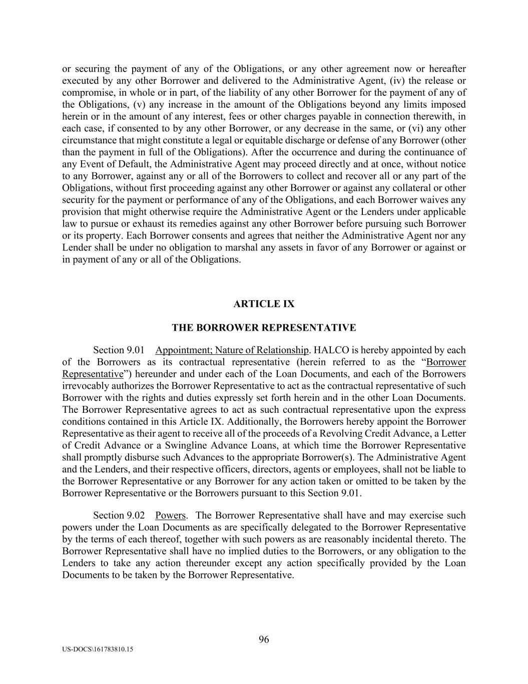 96 US-DOCS\161783810.15 or securing the payment of any of the Obligations, or any other agreement now or hereafter executed by any other Borrower and delivered to the Administrative Agent, (iv) the release or compromise, in whole or in part, of the liability of any other Borrower for the payment of any of the Obligations, (v) any increase in the amount of the Obligations beyond any limits imposed herein or in the amount of any interest, fees or other charges payable in connection therewith, in each case, if consented to by any other Borrower, or any decrease in the same, or (vi) any other circumstance that might constitute a legal or equitable discharge or defense of any Borrower (other than the payment in full of the Obligations). After the occurrence and during the continuance of any Event of Default, the Administrative Agent may proceed directly and at once, without notice to any Borrower, against any or all of the Borrowers to collect and recover all or any part of the Obligations, without first proceeding against any other Borrower or against any collateral or other security for the payment or performance of any of the Obligations, and each Borrower waives any provision that might otherwise require the Administrative Agent or the Lenders under applicable law to pursue or exhaust its remedies against any other Borrower before pursuing such Borrower or its property. Each Borrower consents and agrees that neither the Administrative Agent nor any Lender shall be under no obligation to marshal any assets in favor of any Borrower or against or in payment of any or all of the Obligations. ARTICLE IX THE BORROWER REPRESENTATIVE Section 9.01 Appointment; Nature of Relationship. HALCO is hereby appointed by each of the Borrowers as its contractual representative (herein referred to as the “Borrower Representative”) hereunder and under each of the Loan Documents, and each of the Borrowers irrevocably authorizes the Borrower Representative to act as the contractual representative of such Borrower with the rights and duties expressly set forth herein and in the other Loan Documents. The Borrower Representative agrees to act as such contractual representative upon the express conditions contained in this Article IX. Additionally, the Borrowers hereby appoint the Borrower Representative as their agent to receive all of the proceeds of a Revolving Credit Advance, a Letter of Credit Advance or a Swingline Advance Loans, at which time the Borrower Representative shall promptly disburse such Advances to the appropriate Borrower(s). The Administrative Agent and the Lenders, and their respective officers, directors, agents or employees, shall not be liable to the Borrower Representative or any Borrower for any action taken or omitted to be taken by the Borrower Representative or the Borrowers pursuant to this Section 9.01. Section 9.02 Powers. The Borrower Representative shall have and may exercise such powers under the Loan Documents as are specifically delegated to the Borrower Representative by the terms of each thereof, together with such powers as are reasonably incidental thereto. The Borrower Representative shall have no implied duties to the Borrowers, or any obligation to the Lenders to take any action thereunder except any action specifically provided by the Loan Documents to be taken by the Borrower Representative.